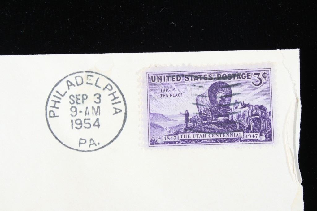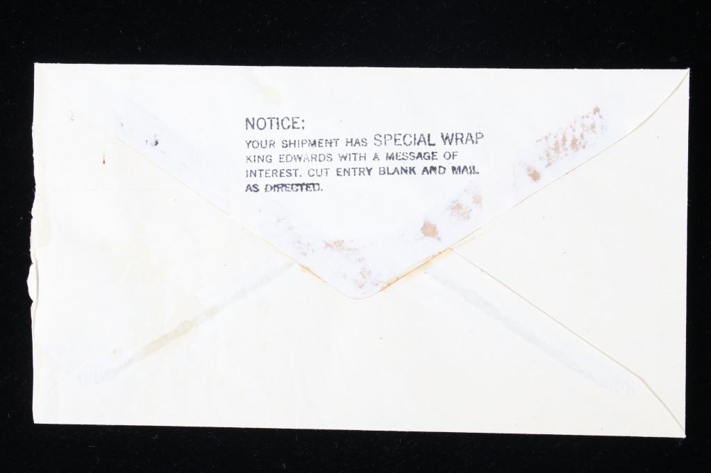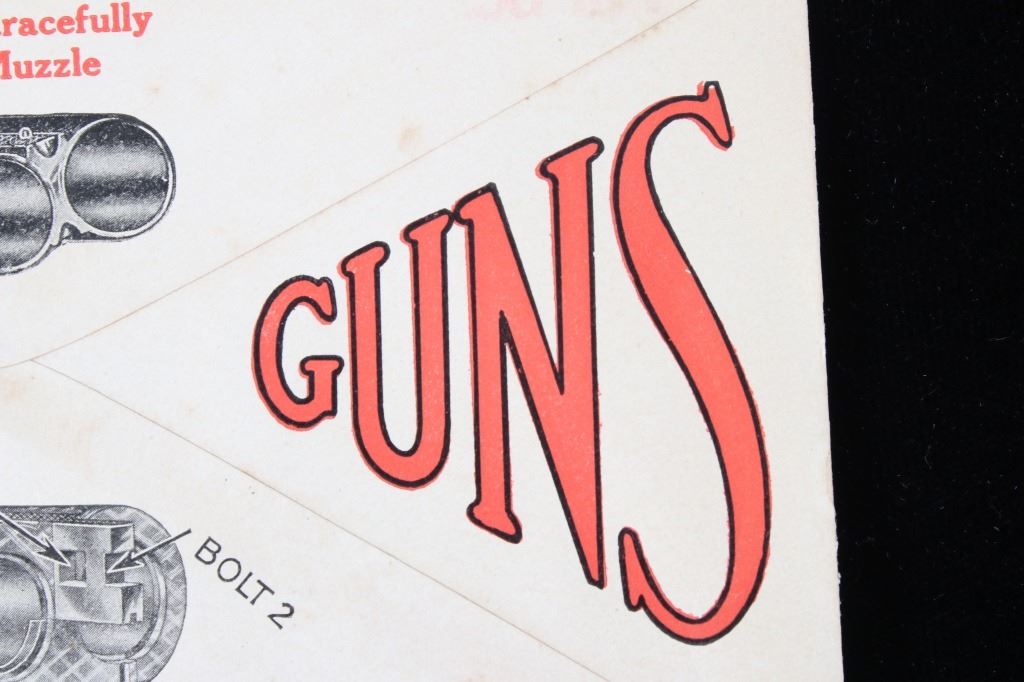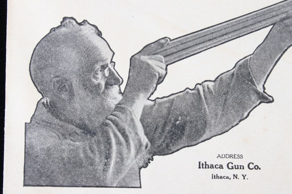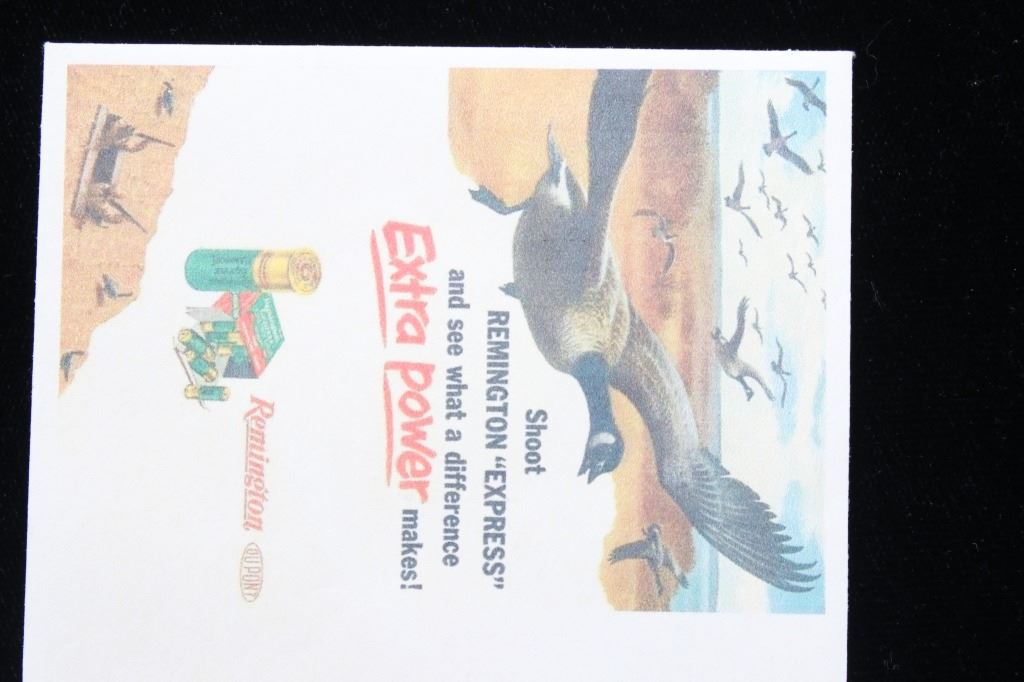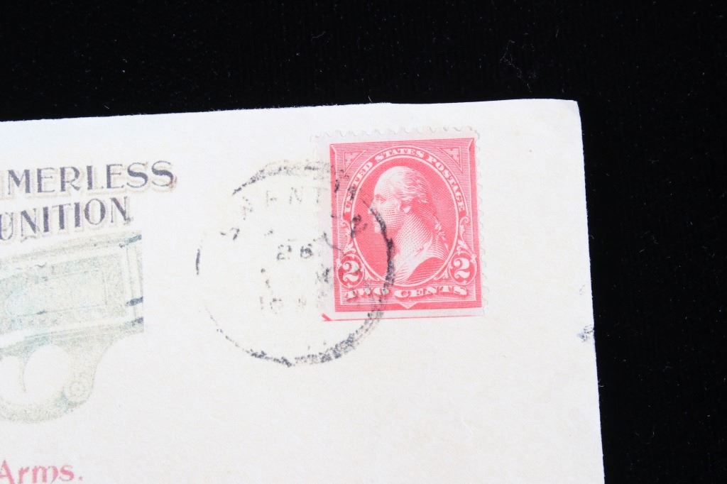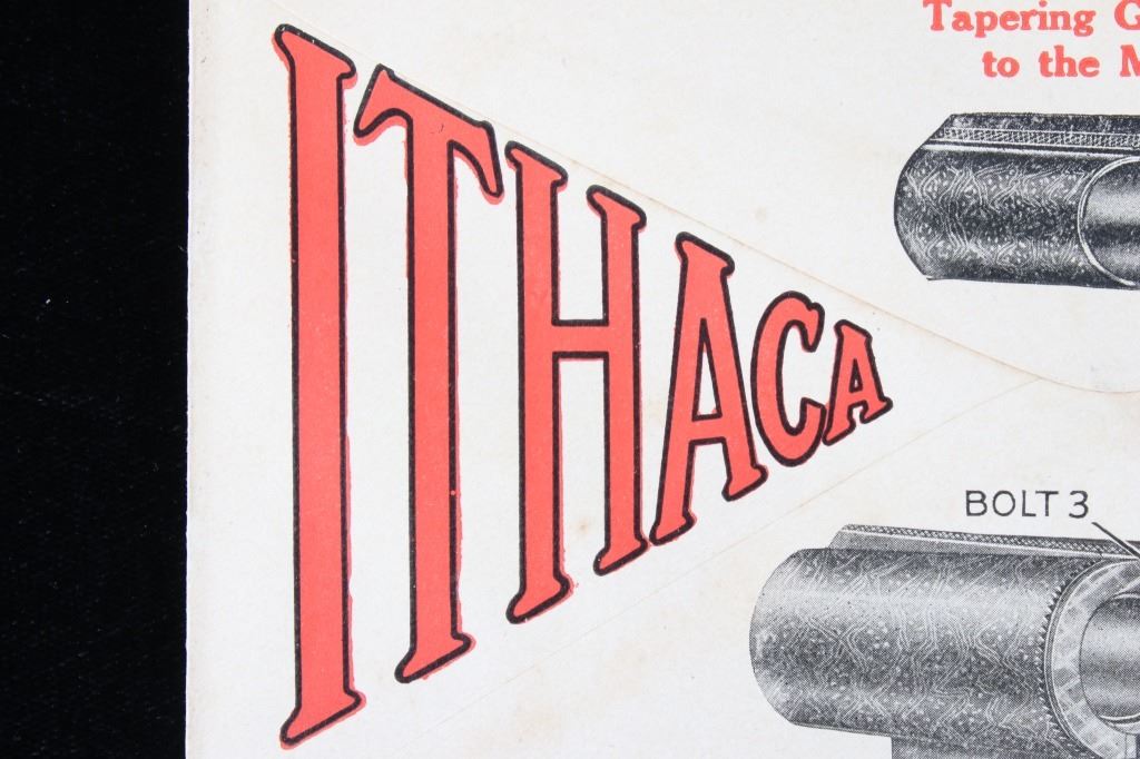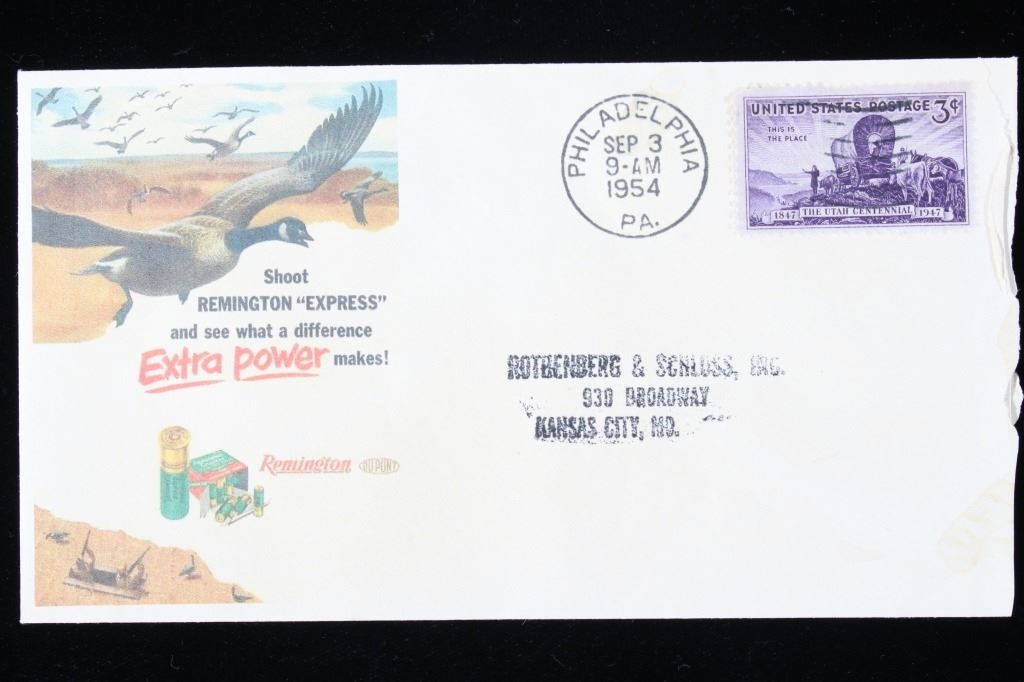 Featured in this lot we have a set of three firearm manufacturer envelopes originating from the early 20th century. The collection shows three envelopes from three different firearm manufacturing companies. The first of the envelopes shows a Native American is full chiefs garb with the words "Savage Hammerless Rifles & Ammunition Twentieth Century Arms" across the front. The envelope displays a US postage stamp along with a stamped address and postage across the front. The back is stamped "Special Delivery Kansas City". The second piece is an Ithaca Guns envelope with Bob Edwards staring down a shotgun barrel and is titled "Still Boring Ithaca Guns". The back of the envelope shows two diagrams of double barreled shotgun barrels and recerver and is marked "The Narrow Skeleton Rib Tapering Gracefully to the Muzzle - Ithaca Guns- The Double Thick Nitro Breach, Showing 3 Bolts". The third and final piece is a Remington express envelope with the image of Canadian geese flying over two hunters. The piece shows a postage stamp and has the address and Philadelphia post office stamp. The back of the envelope is marked with a stamped Notice across the back. The set show good condition overall with some minor wear and having been opened. The envelopes measure 6 1/2" wide by 3 5/8" tall.