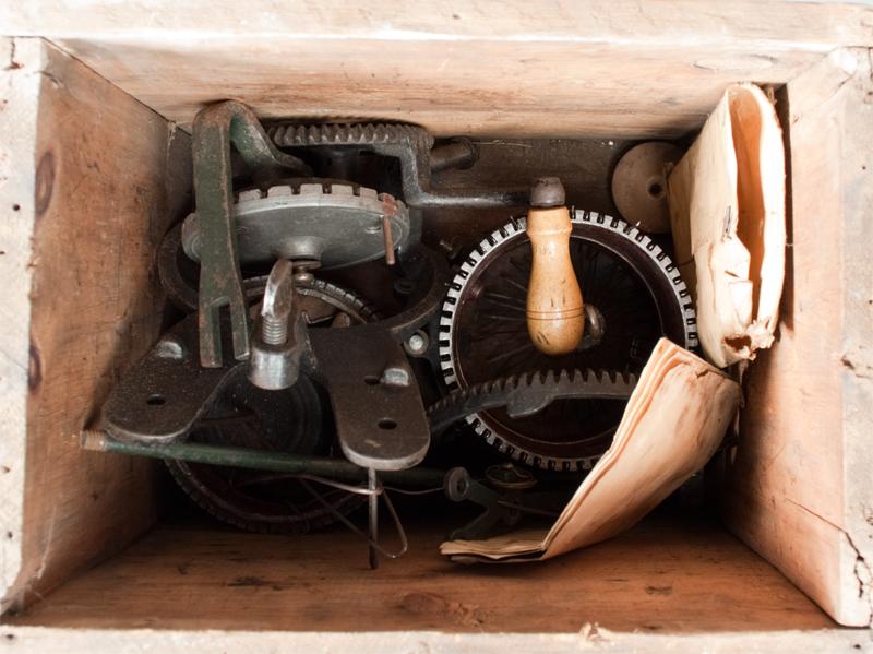 Made by Gearhart's 1908, Family Knitting Machine with parts and original instruction booklet. All contained in small wooden shipping crate.