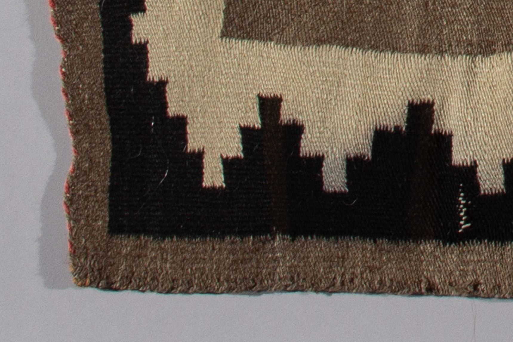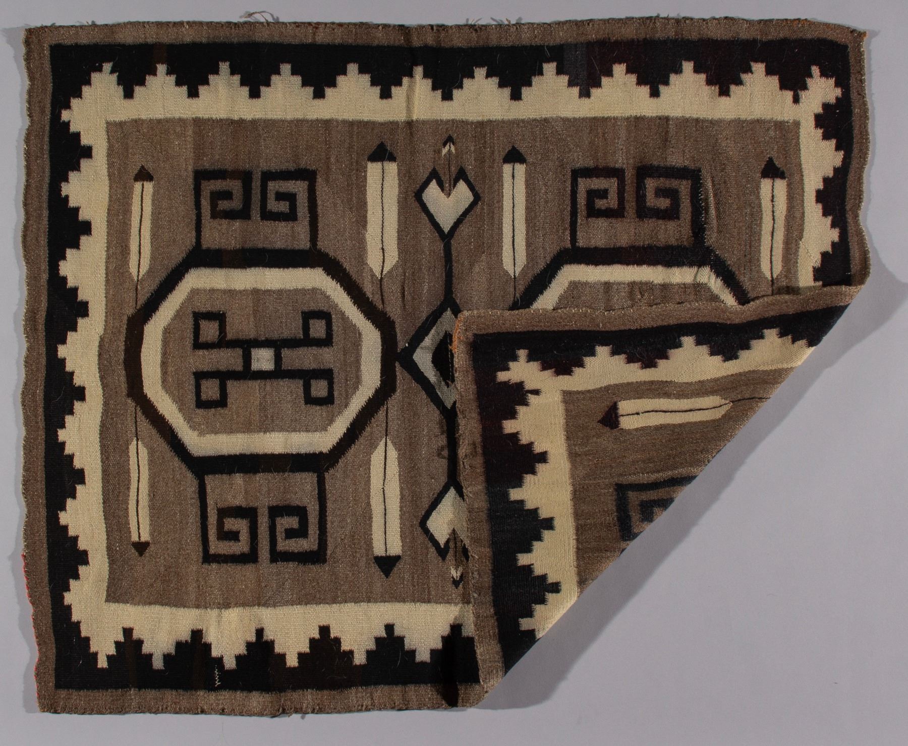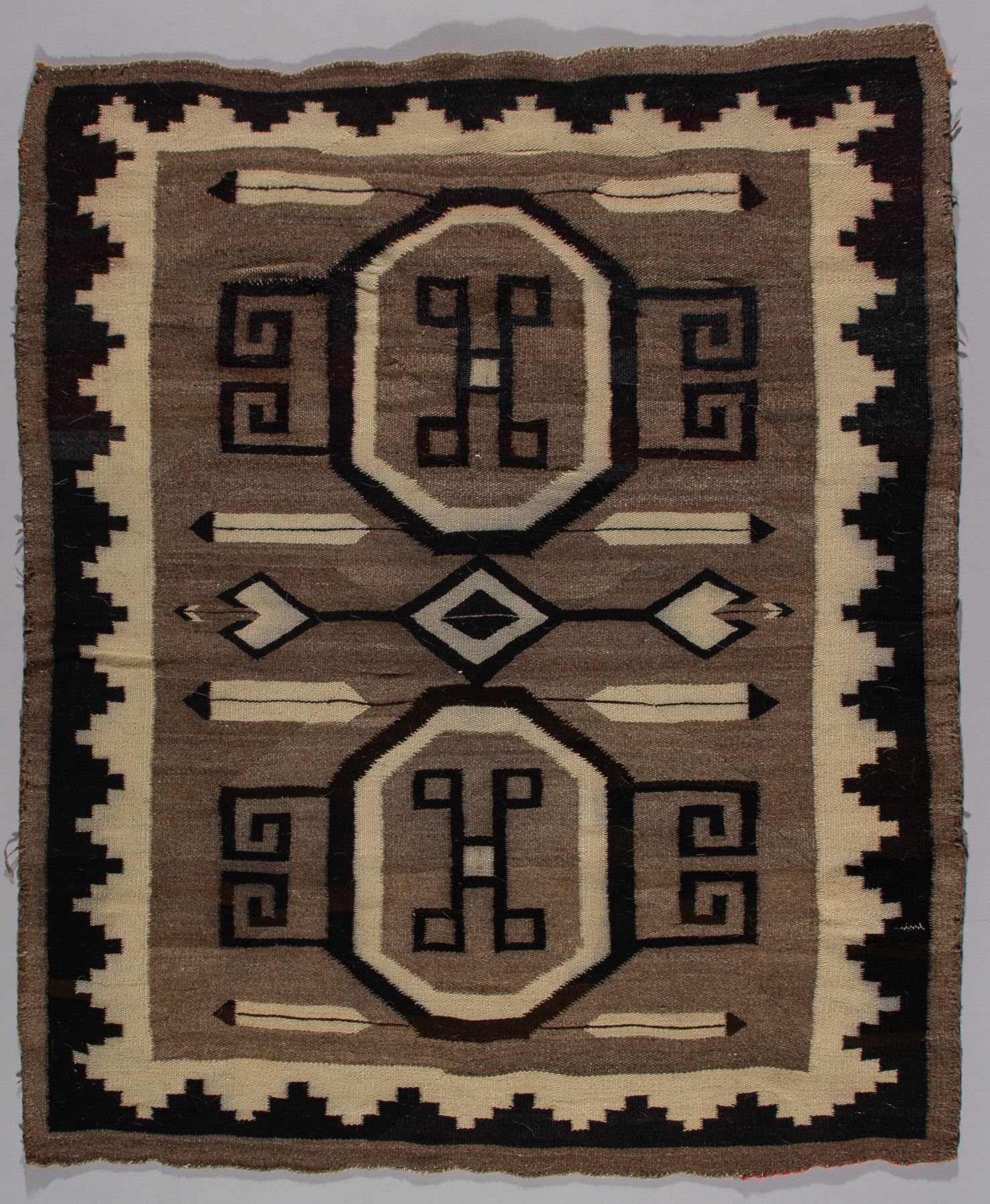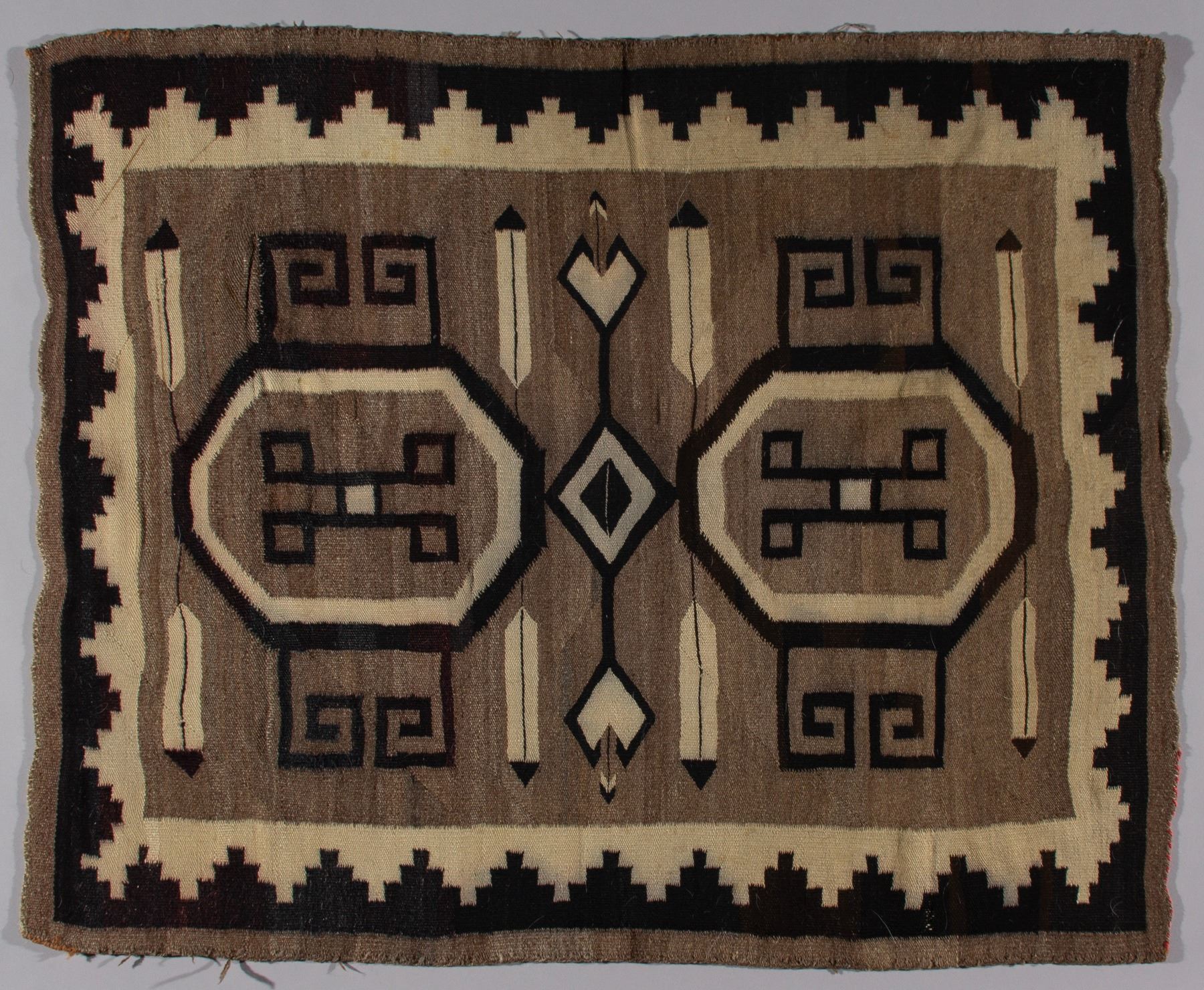 A finely hand-woven Navajo textile, identified as a classic example of the Crystal style. This pictorial rug features a complex, symmetrical geometric pattern utilizing natural, handspun wool in shades of grey-tan, black, and cream. The design centers on two large octagonal motifs, flanked by hooked elements (frets) and striking arrow/feather designs, a common motif in this regional style. The entire composition is finished with a traditional stepped border of cream and black. The aesthetic is characteristic of the weavings popularized by traders around the turn of the century. Ca 1900s