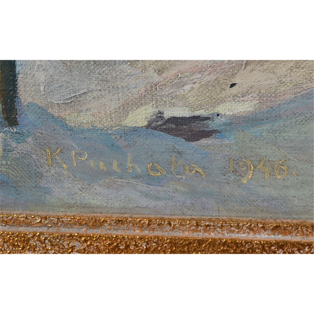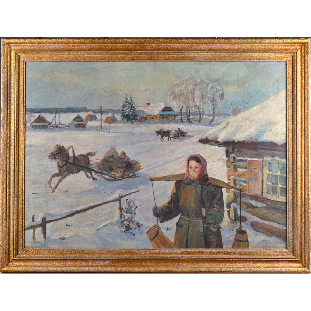 Depicting a winter scene with a woman carrying buckets on a yoke, with sleigh riders and village houses in background. Wonderful depicting of early 20th century life in Russia. Woman has a warm smile on her face as she goes about the daily tasks. 34.25" H x 45.25" W, including the frame. Circa early 20th century. Private collection Troy, MI.