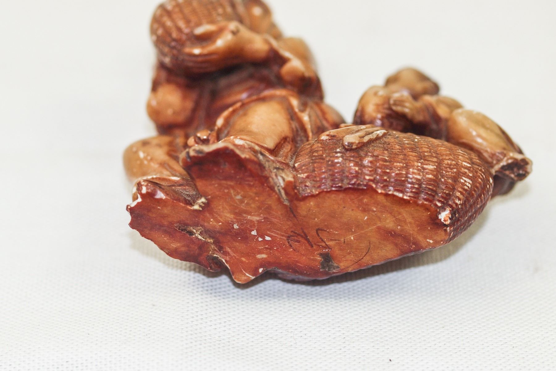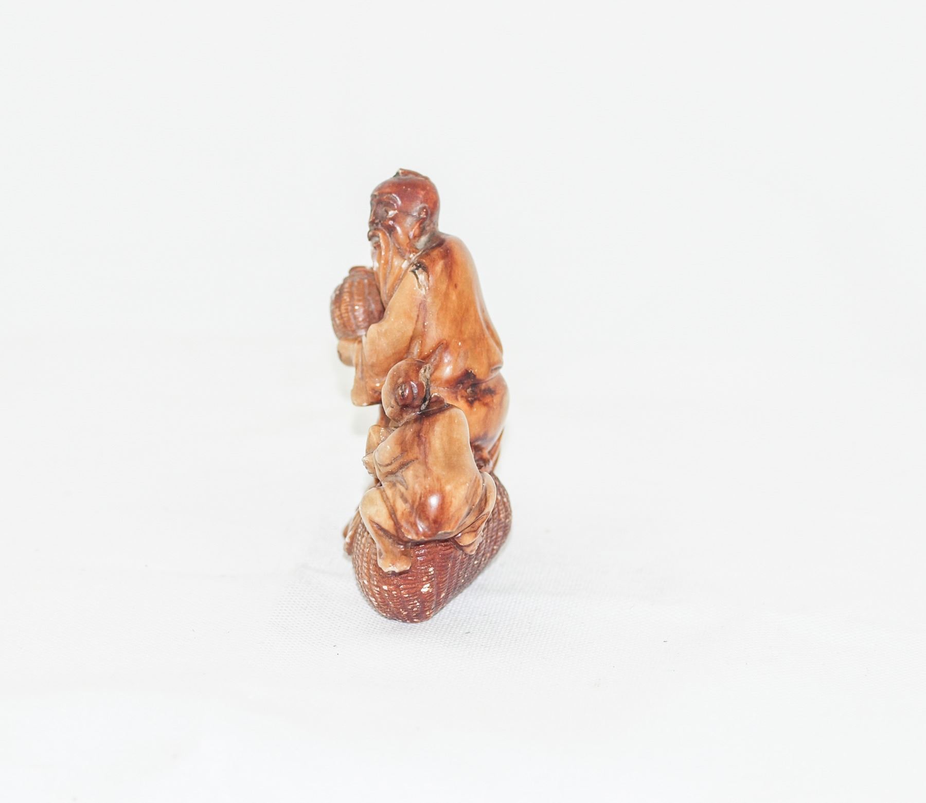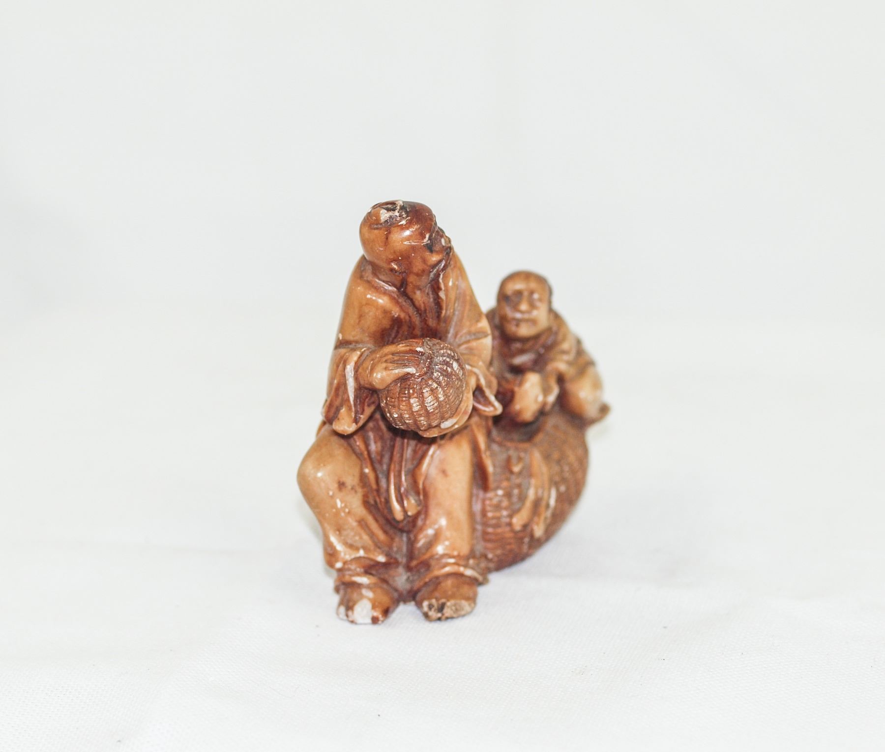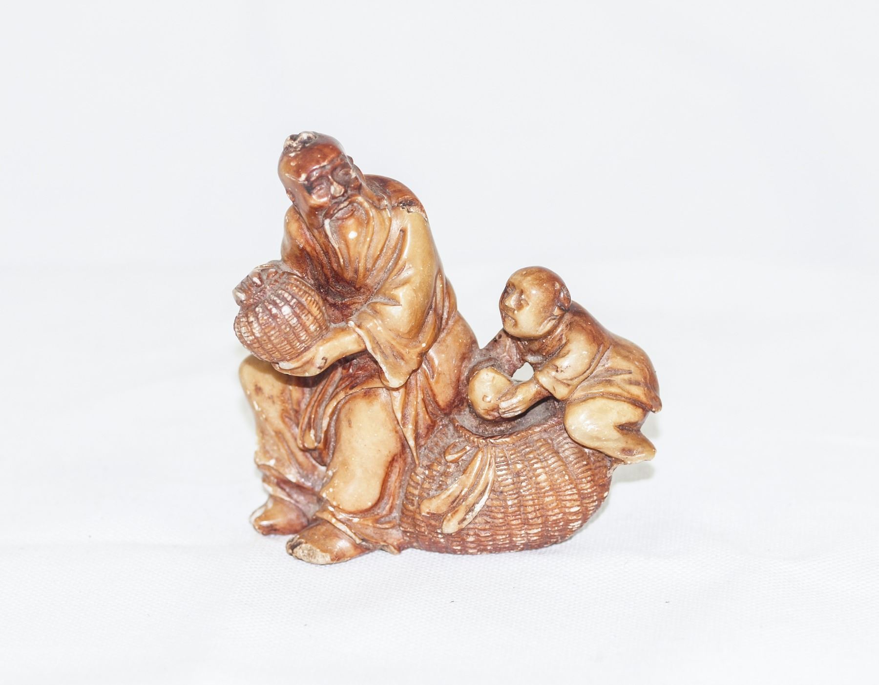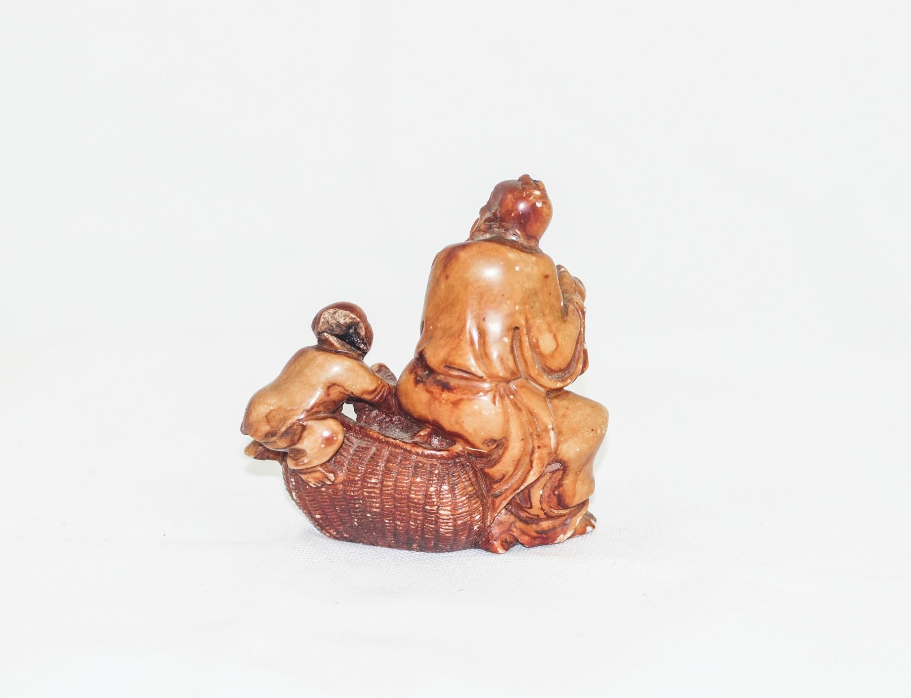 Early 20th century Chinese soapstone figure with maker’s mark on base. 8 x 8.5 x 4 cm (3.15 x 3.35 x 1.57 inches), 185 grams. PROVENANCE: Private collection, Italy