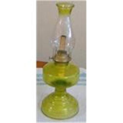 This early 20th century vaseline-colored, pressed glass oil lamp has a striking presence in both its height and execution!</em></td>