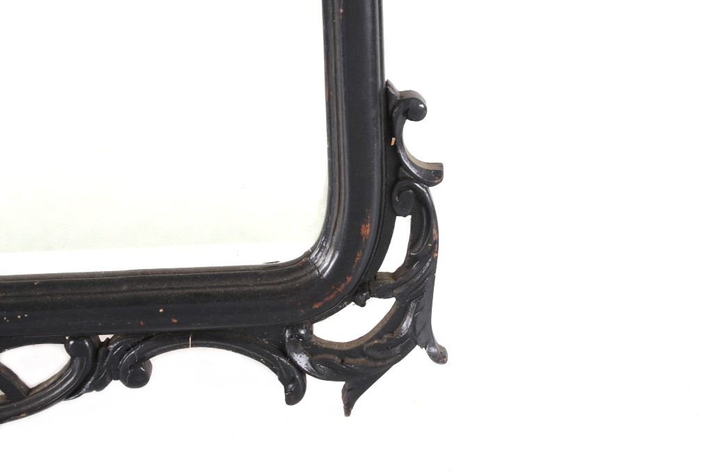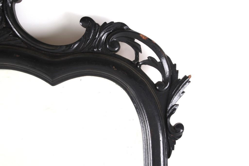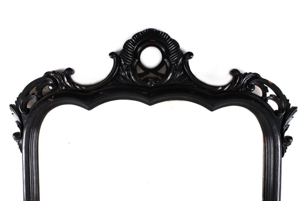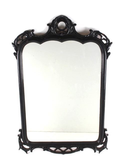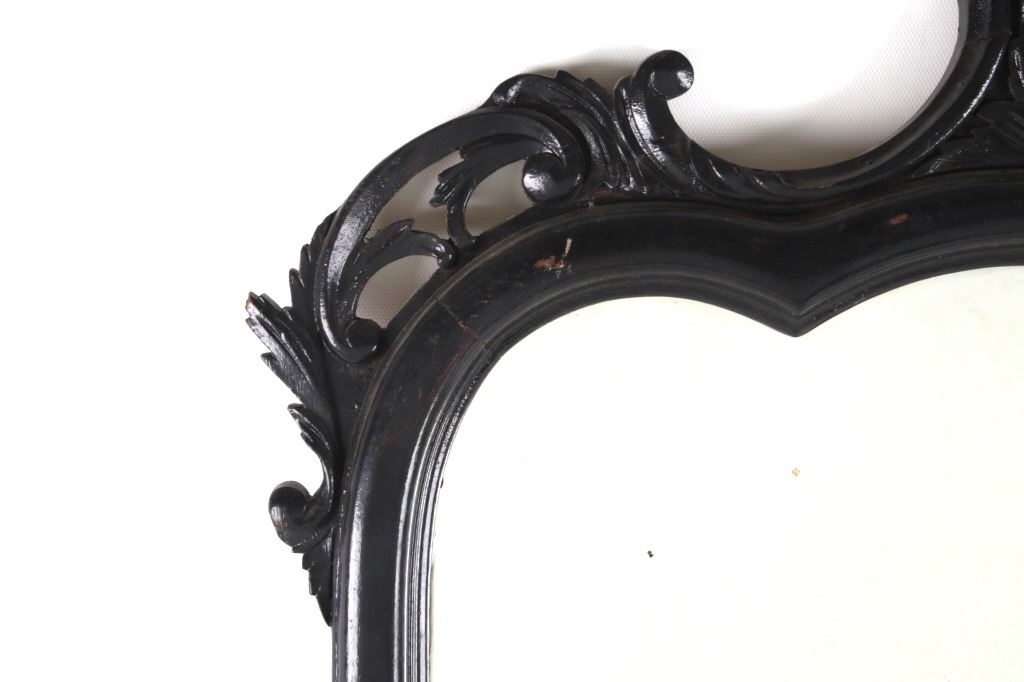 For your consideration is this early 20th century Victorian style carved wood mirror. The mirror is large and set in a dark wood frame and features an angled perimeter. The frame shows a wooden beveled construction with a carved centerpiece at the top of the frame and smaller carved accents on the sides and bottom. The piece shows solid construction and is in good condition overall with the wood frame showing slight wear and scuffs from its antique age. The mirror measures 37" H x 24" W x 1 1/4" D.