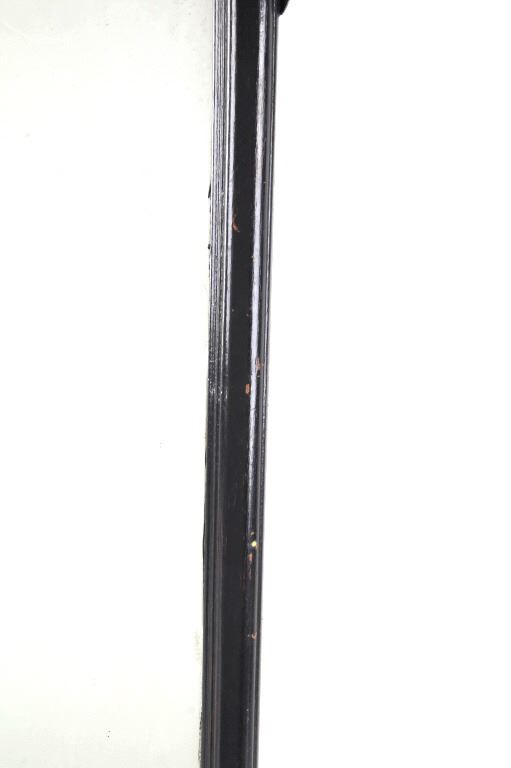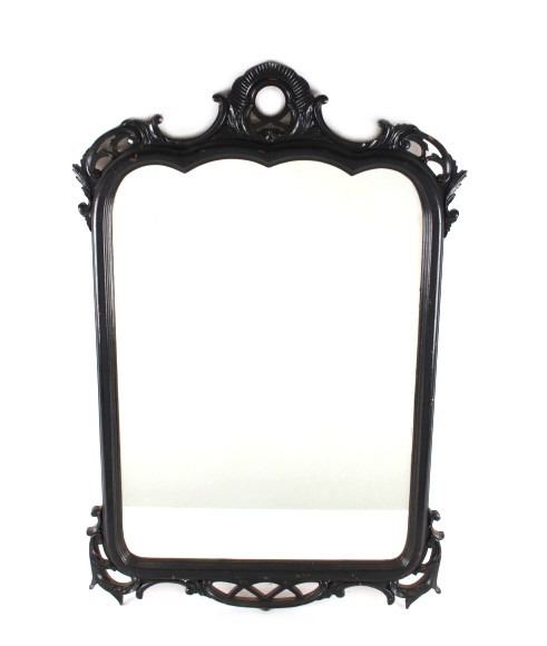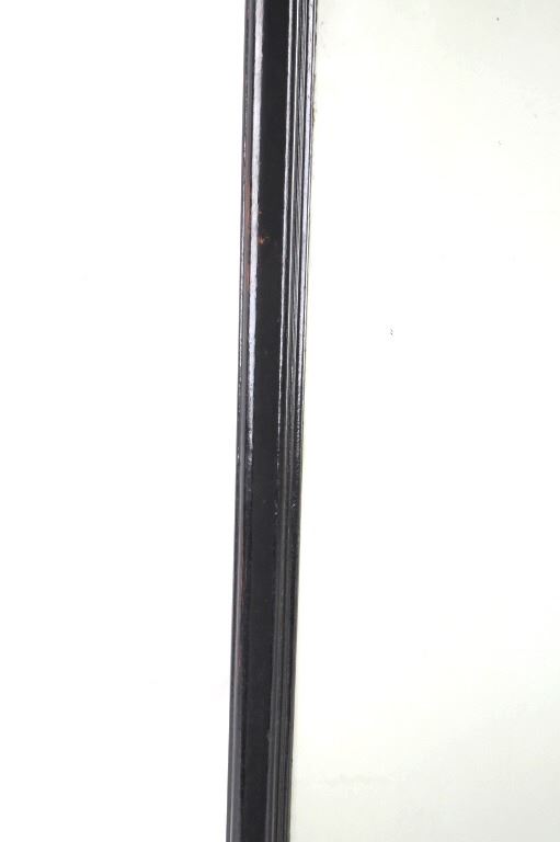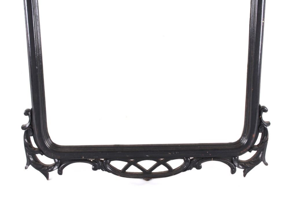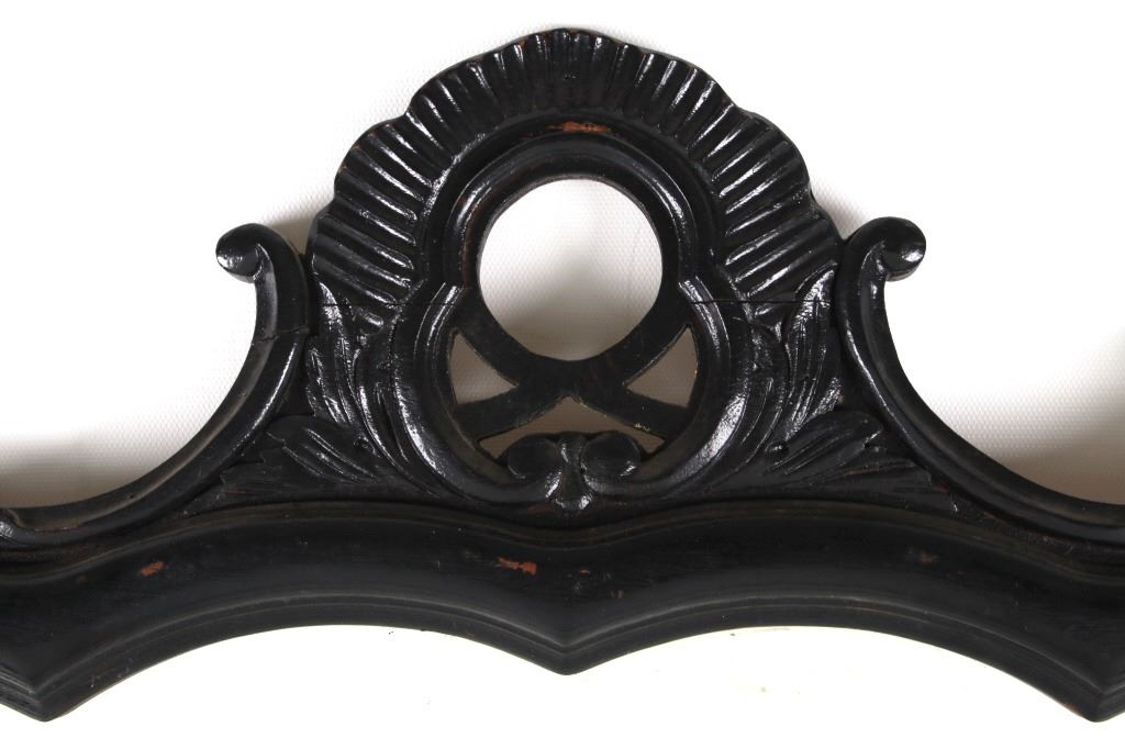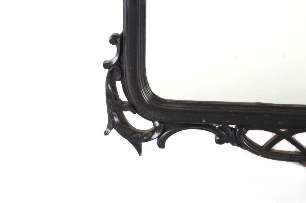 For your consideration is this early 20th century Victorian style carved wood mirror. The mirror is large and set in a dark wood frame and features an angled perimeter. The frame shows a wooden beveled construction with a carved centerpiece at the top of the frame and smaller carved accents on the sides and bottom. The piece shows solid construction and is in good condition overall with the wood frame showing slight wear and scuffs from its antique age. The mirror measures 37" H x 24" W x 1 1/4" D.
