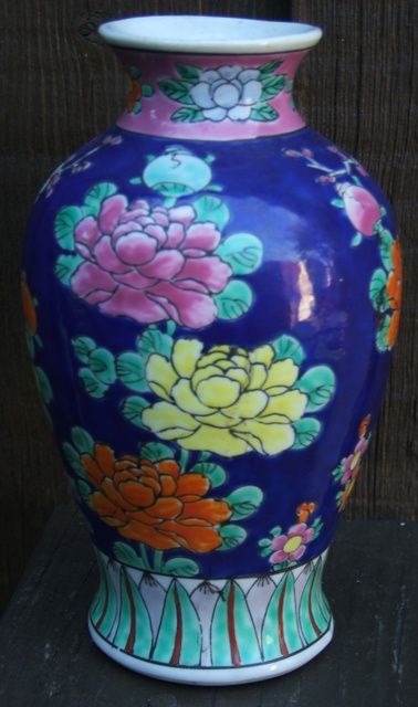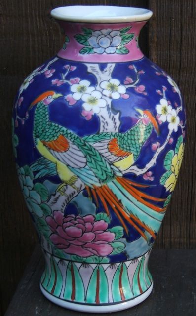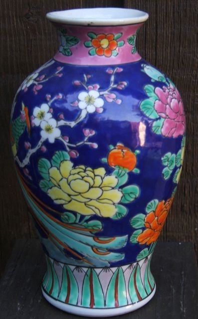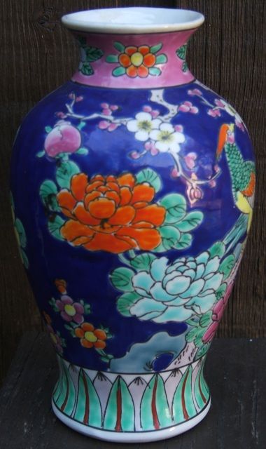 Depicting "Colorful Birds & Flowers", cobalt blue background. Excellent condition. Approx. 7" H x 4.25" W. Please read our terms of sale.