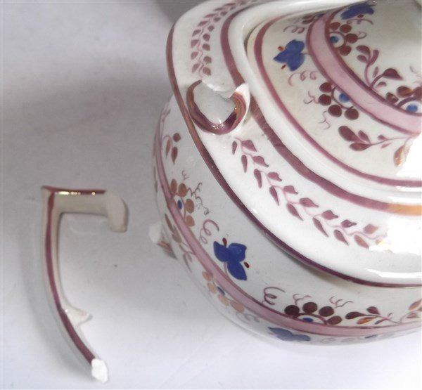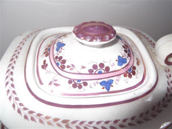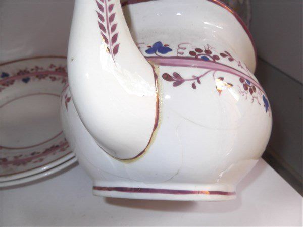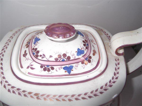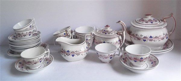 Early 20th c. English dishes, cups, saucers, tea pot. Not a complete set. 2 plates- 8 inches diam; tea pot- 6 inches high x 10 inches wide; 10 cups- 2 1/2 inches high x 3 1/2 inches diam.; 12 saucers- 5 1/2 inches