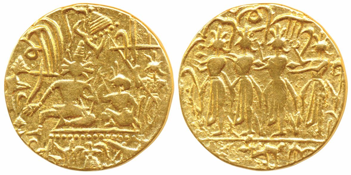 Early 20th century, Gold Ramatanka, 11g, Obverse: Durbar scene, Ram and Sita sitting facing flanked by two attendants, Reverse: a procession. Extremely Fine, Very Rare.