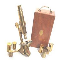 Early 20th century brass microscope by Baker, London, with one eyepiece and six objectives by various makers, 10 1/2 in. high, in mahogany case with brass carrying handle. See illustration.