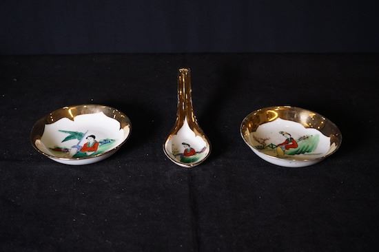 Condition as is, shown in photos. Diameter(dishes): 10.1cm (10); H(dishes): 2.7 cm (10). L(spoon): 14.3cm (10)