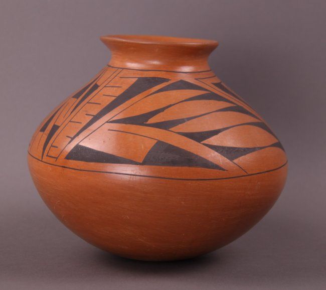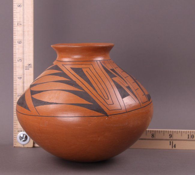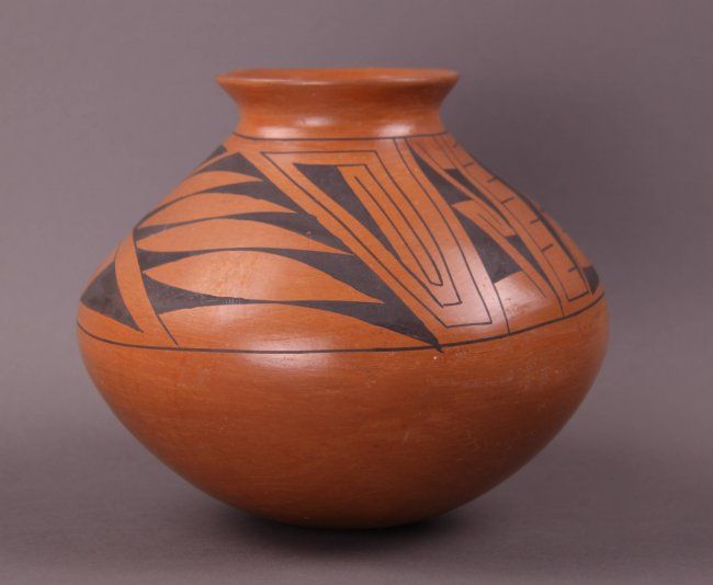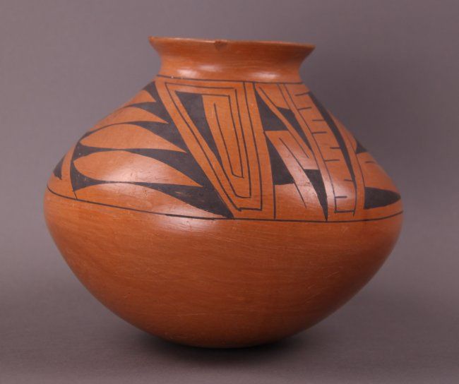 Early 20th century, the short spreading neck over a shouldered body decorated with two bands geometric devices in black on a red ground, Condition Report: tiny chip in rim. (Size: See last photo for measurement.)