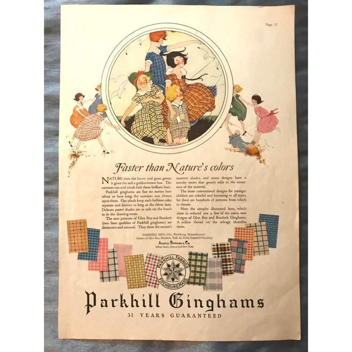 Original early - mid 20th Century children's themes, magazine advertisements, including: 1950's Keds shoes, United States Rubber Company advertisement from a copy of the Saturday Evening Post. 10 1/2" X 13 1/2" & a 1920's Parkhill Fabrics, features Parkhill Ginghams with illustrative colored lithograph of children playing by Edith Butler.. 9 1/2" X 13 1/2". ** Keds ad is mounted on linen canvas backing for preservation.Â