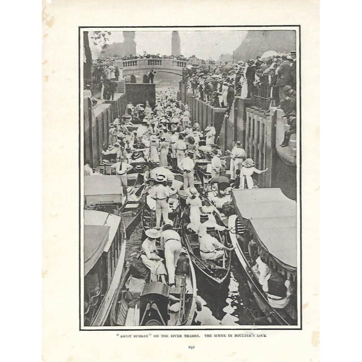 Early 20th Century English book plate print, photo of “Ascot Sunday†on the River Thames. Wonderful Edwardian period image of Society at recreation. 7" X 10".
