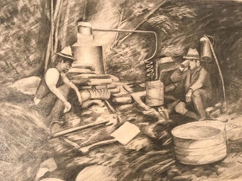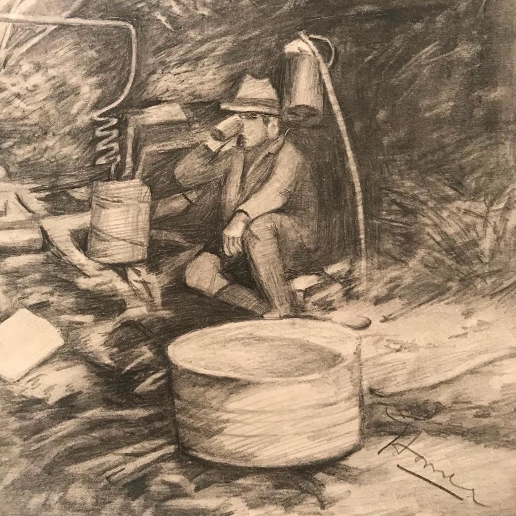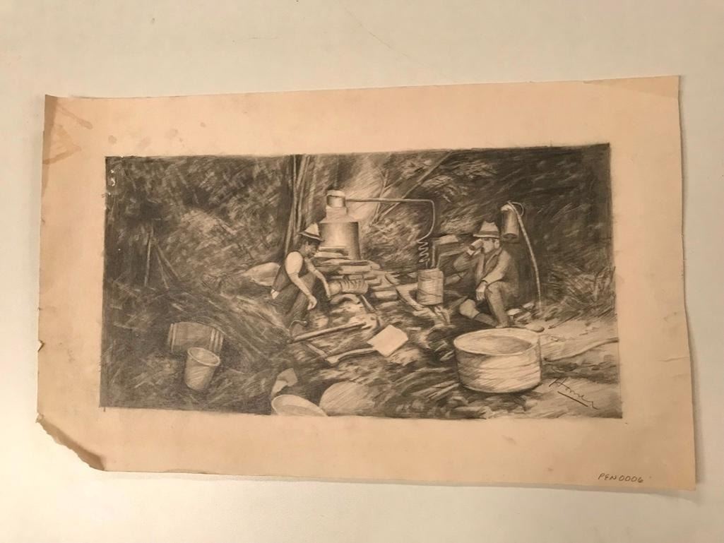 Early 20th Century graphite pencil sketch, depicting moonshiners at a  mountain still, signed "Homer" lower right.  8 1/4" X 16" sketch on 12" X 20" paper. * some loss & staining, a tear to the left corner.