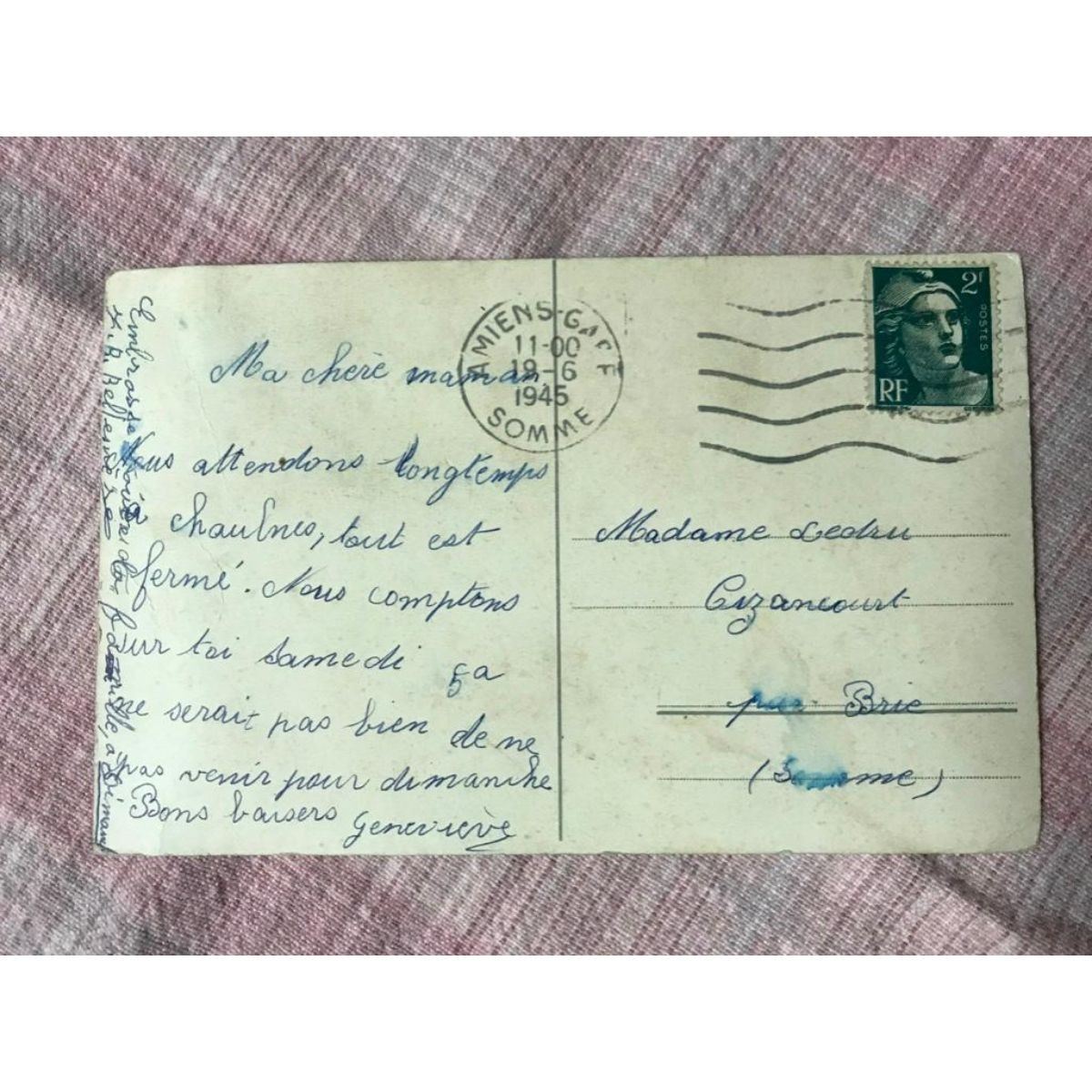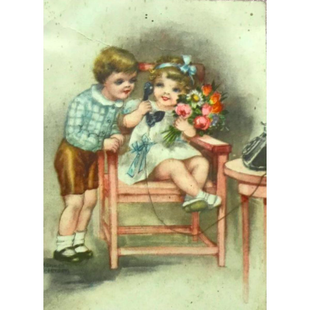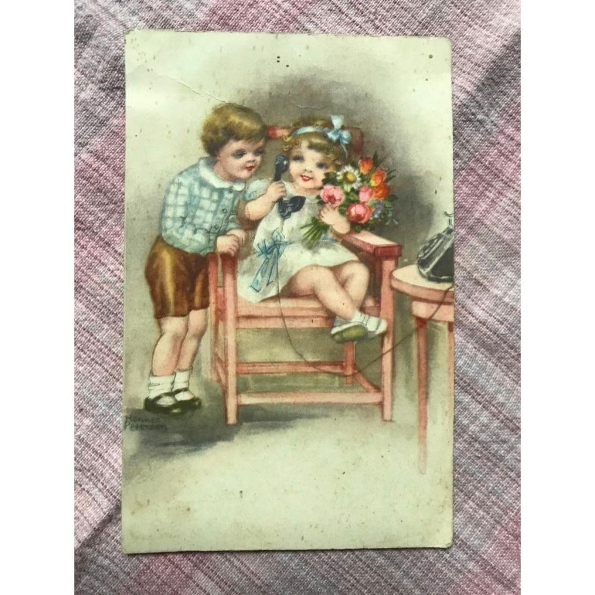 Vintage, early 20th-century postcard by Hannes Petersen, the illustrative subject - a little boy listening in on a little girl's conversation over the phone. Postally used & stamped 1945, with handwriting & addressee in French, with French stamp. * creasing to the top left from usage, as seen in photos.