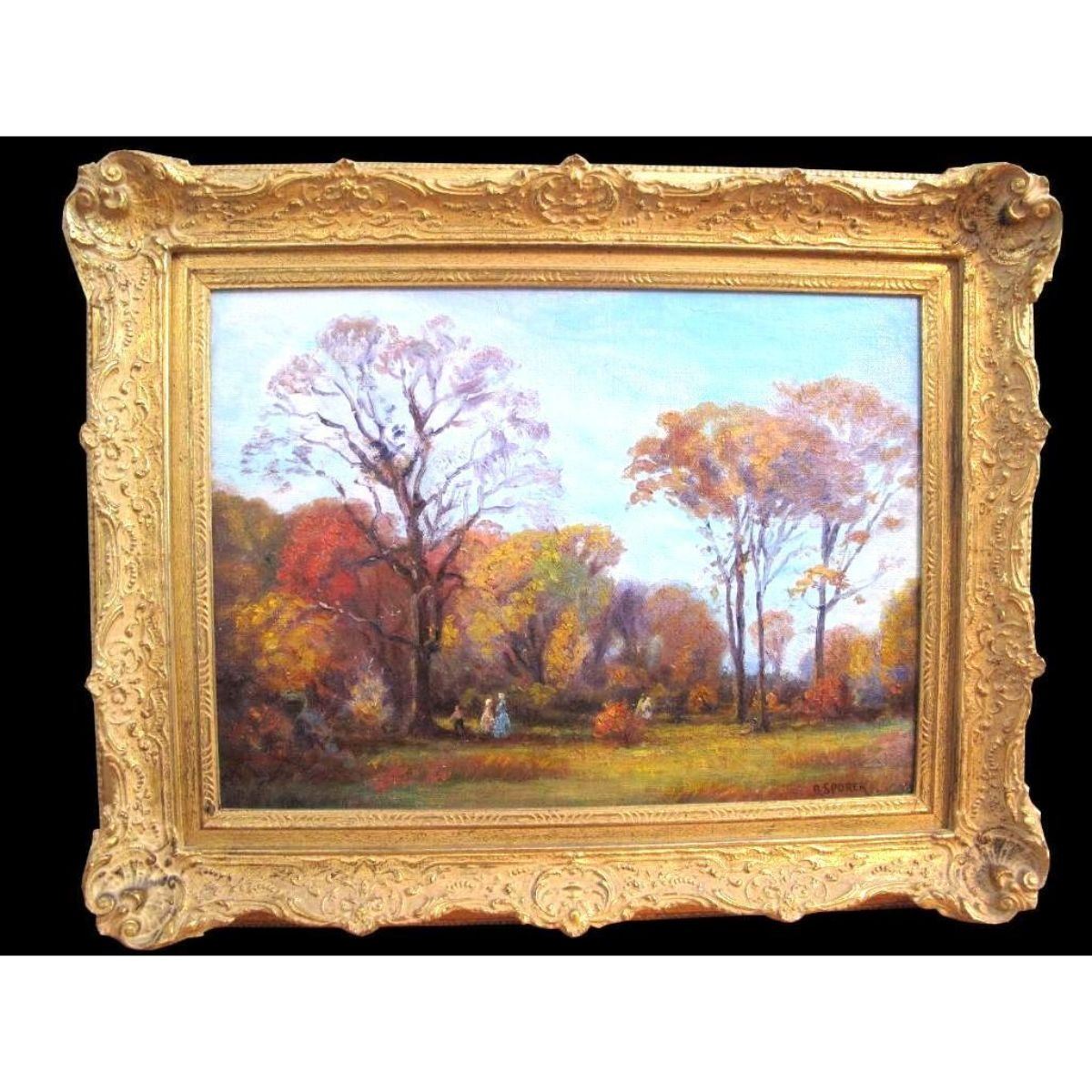 Early 1900's oil painting, "Autumn" signed Bartholomew Sporer, lower right-hand corner, with notations verso, indicating that the artist died in 1928. Measures approx 11" X 15"1, the outer dimensions of frame approx 19 3/4" X 15 3/4." Â