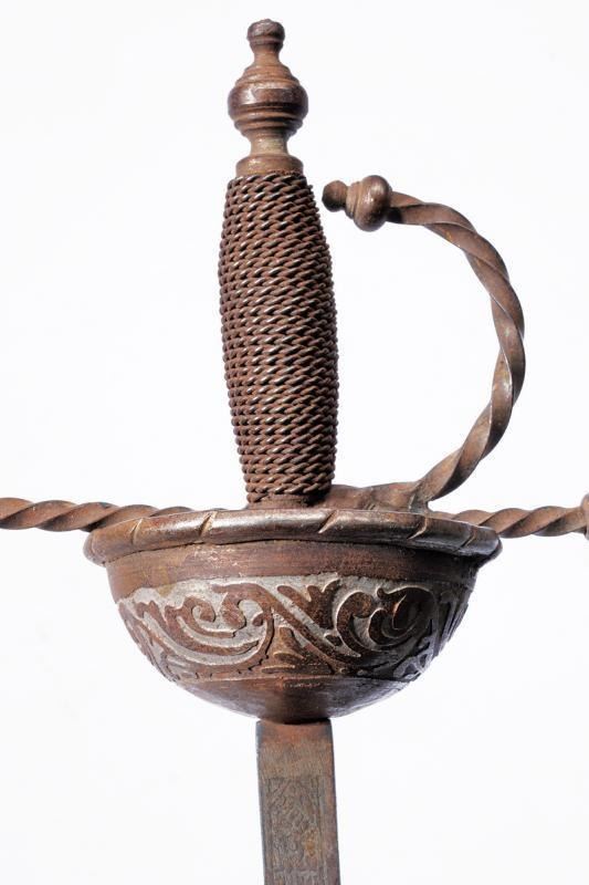 20thc Spanish straight blade without wires, engraved on both sides: cup engraved with floral motifs, elso & guard branch with buttons at the ends; pomo worked en suite. Grip covered with metallic braid. 18"L. ( 45 cm ). 10116-040518-CZ-00870