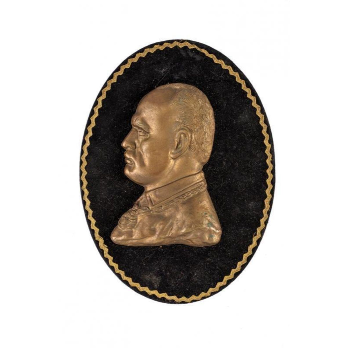 First quarter of the 20th century, Italian bas-relief of Benito Mussolini bearing the medallion of an Order. In bronze. Mounted on an elliptical plaque lined with black velvet & framed in golden thread. 5" (15 cm ). 10112-040518-CZ-00426