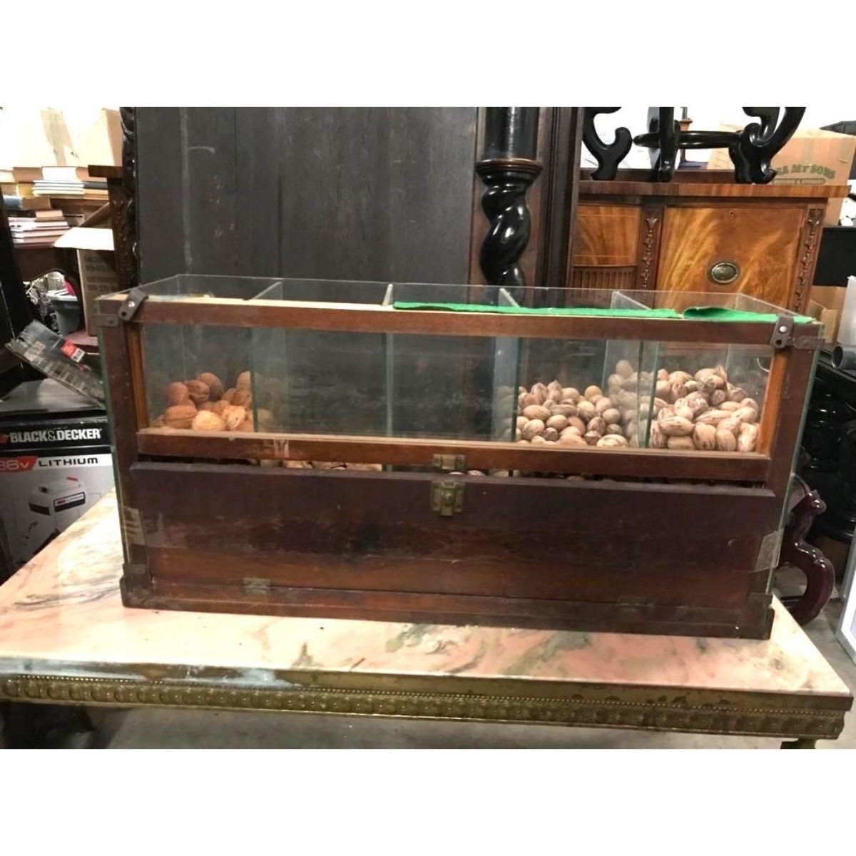 Early 20th Century, wood & glass country store counter display bin, for penny candy or nuts.  Brass hinges with 5 display containers. **** due to size & glass, special pick-up delivery arrangements required