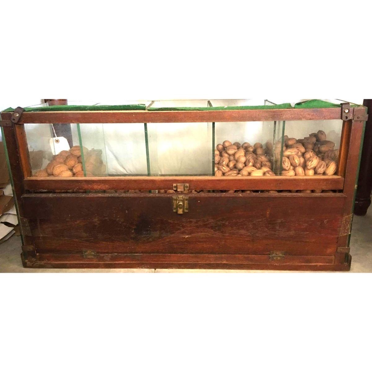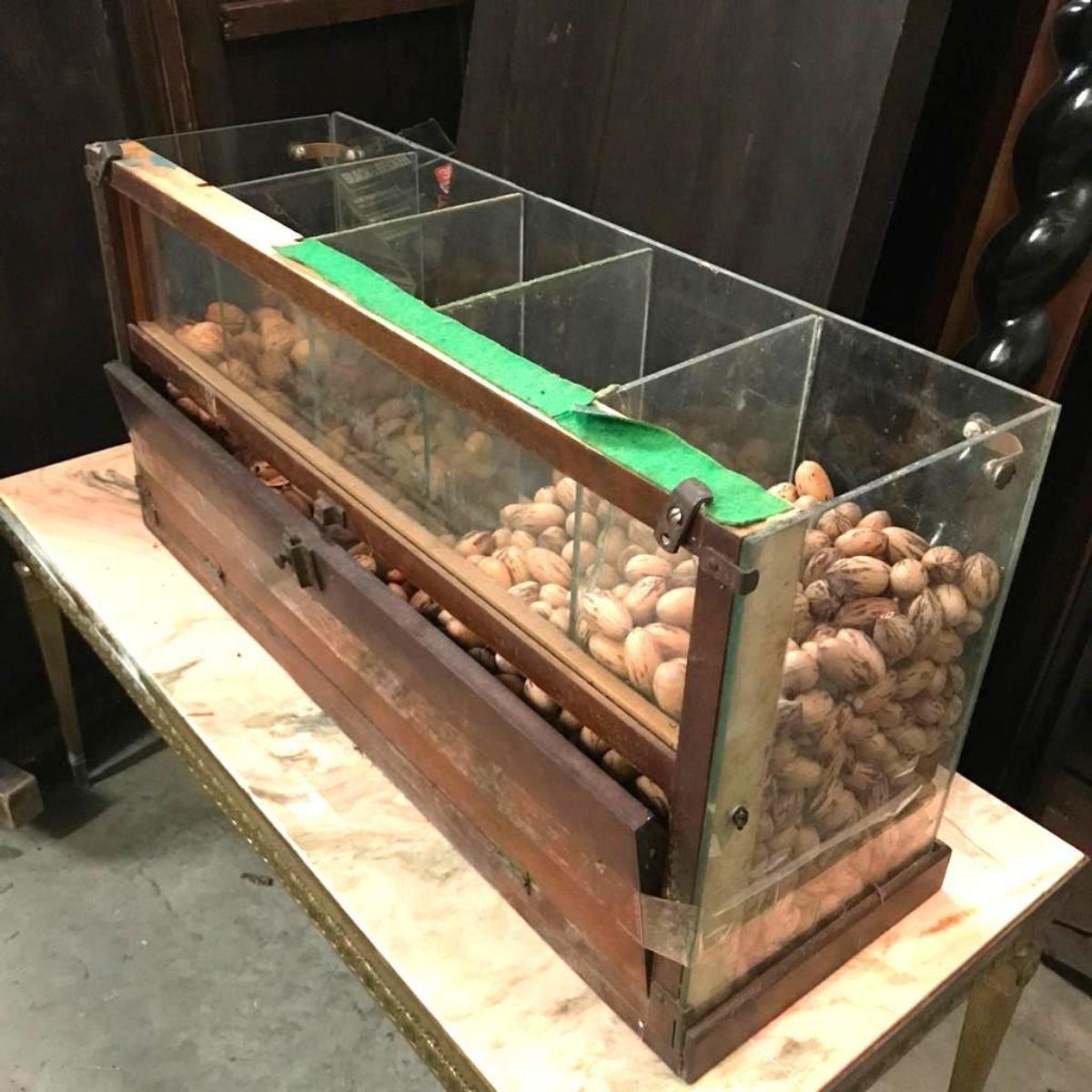 Early 20th Century, wood & glass country store counter display bin, for pennycandy or nuts. Brass hinges with 5 display containers. ****due to size & glass,special pick-up delivery arrangements required.