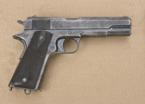 Early 3-digit Colt model 1911 .45 auto, U.S. property marked, blued finish, checkered wood grips, serial #355. This low serial number 1911 remains in good to very good untouched original conditions showing 20-40% originalblue finish, some erosion, light to moderate scattered surface pitting, good markings, grips good with even wear. Markings are all visible and there is some bright finish on small parts and protected areas. The pistolshows all correct early major component parts including barrel, trigger, hammer, grips, etc. and shows early patent dates, early inspections, and two-tone lanyard-bottom magazine. Action good, bore very good, andthe Colt just shows honest use consistent with military service. These early 1911’s went primarily to Texas and the border areas and were used before the first World War along the border in the Pancho Villa era. Itwould be difficult to fine and more honest and untouched early 3-digit 1911, which have become prohibitively expensive in fine condition. Note: Recorded as one of a group shipped to Springfield Armory February 15th