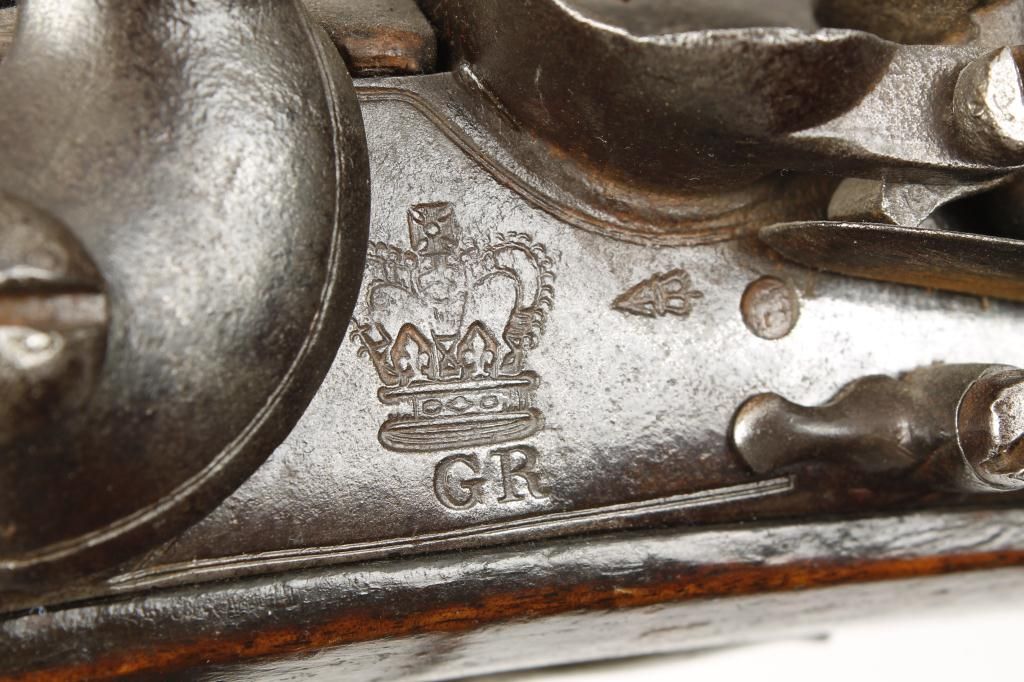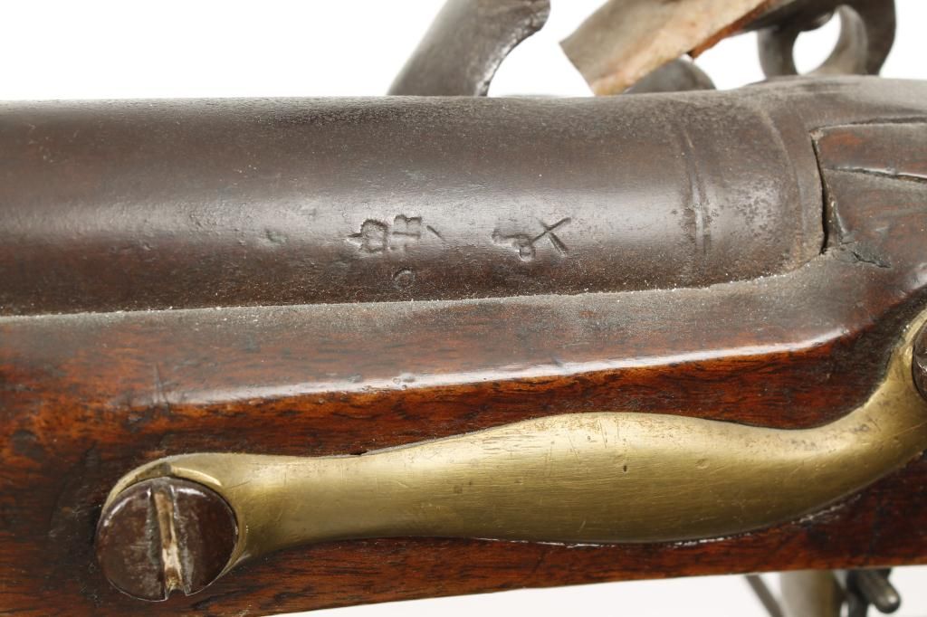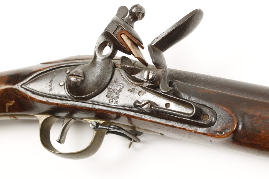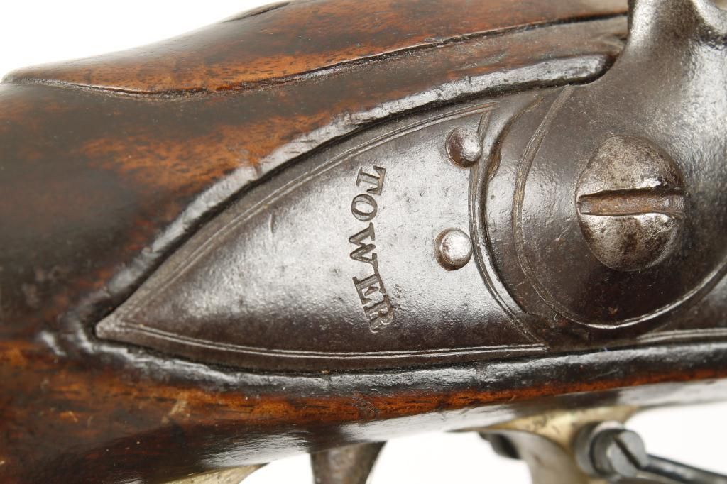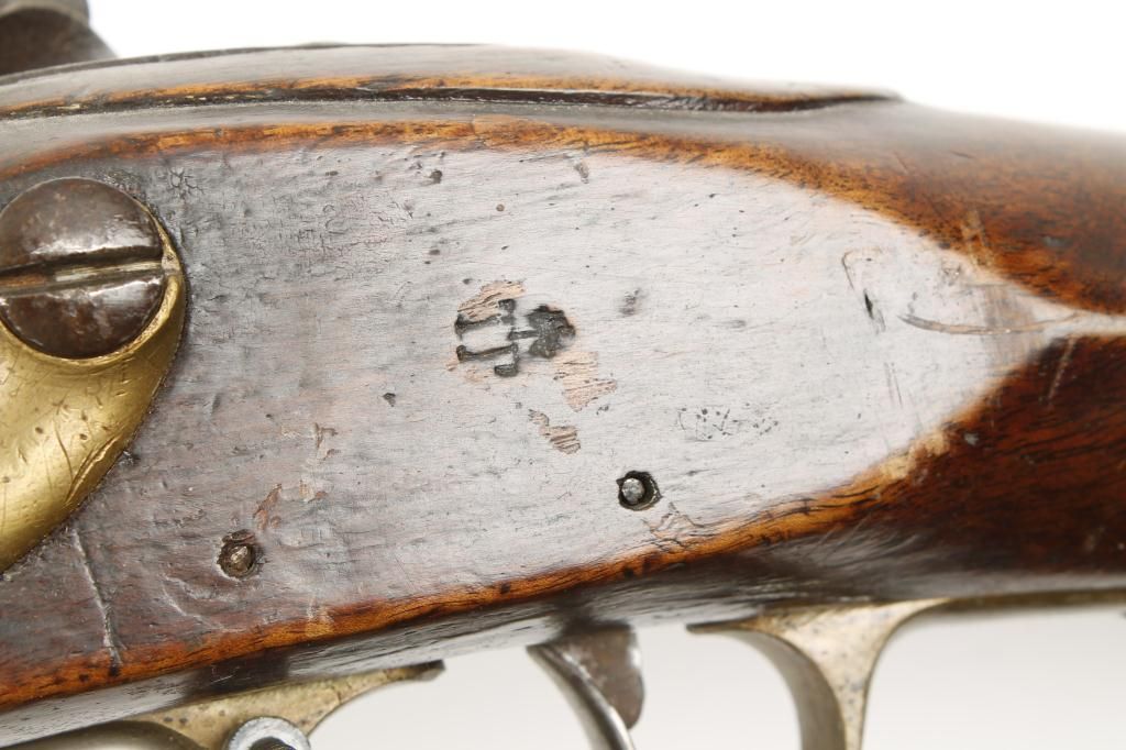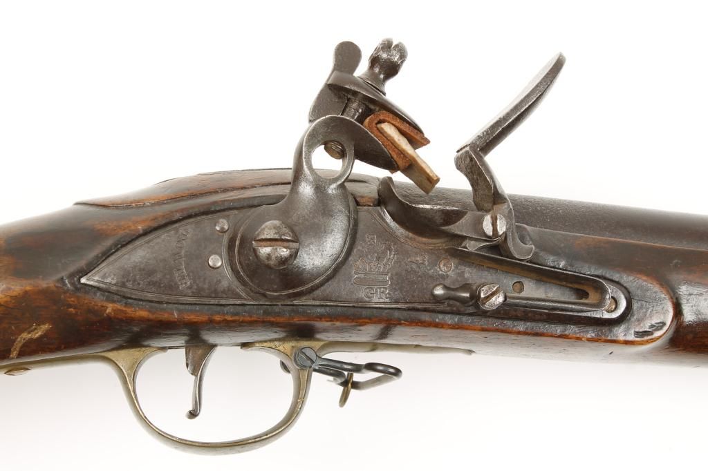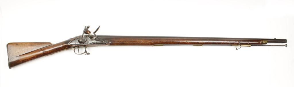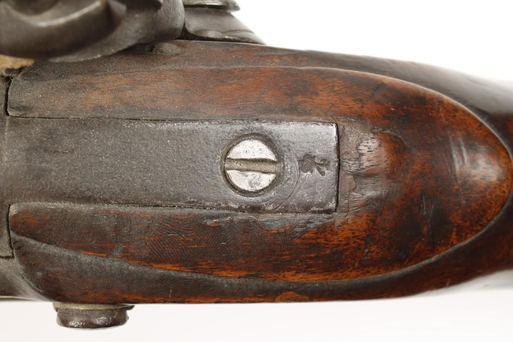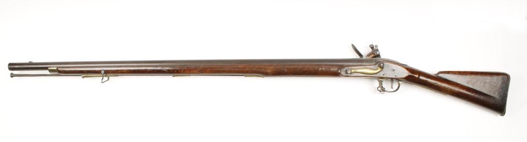 Early 3rd model Brown Bess showing GR and crowned at center of lock with tower at rear of lock also lazy S shaped side plate with early type comb and molding around the tang. .69 caliber smoothbore in very good pluscondition showing a dark patina on barrel with some minor pitting and erosion around the firing areas of breech. The hammer and small parts are all original and the lock is well marked. The stock is also very good plus with a bulbous swell around the rear ramrod pipe (denotes early 3rd model) and just some small scratches, minor dings, dents and normal aging. There is a good inspection mark on the left side of the stock above thetrigger which shows a British type crown in and the initials IP or TP. There are also some smaller inspector marks that are not legible just behind the bottom trigger guard and on the belly of the stock. The musketretains its original swivels and a ramrod. Also shows good proofs on the left side of the breech. From the styling configuration we would date this Brown Bess at 1780 to the war of1812. Est. $1,000-$2,000.