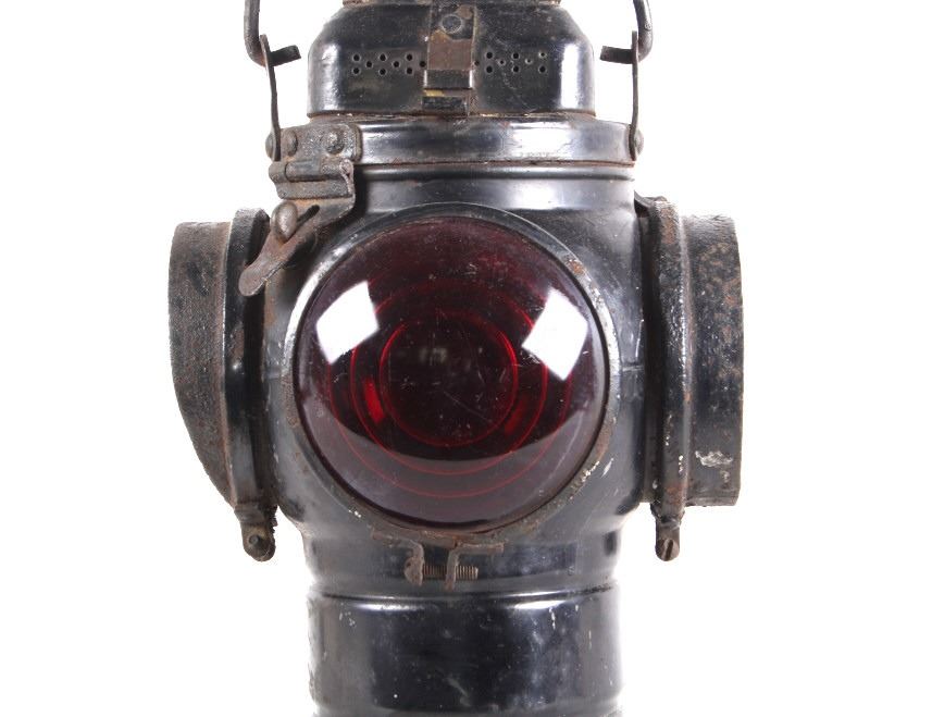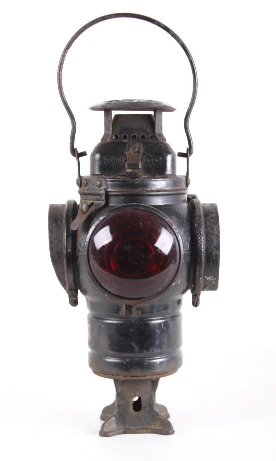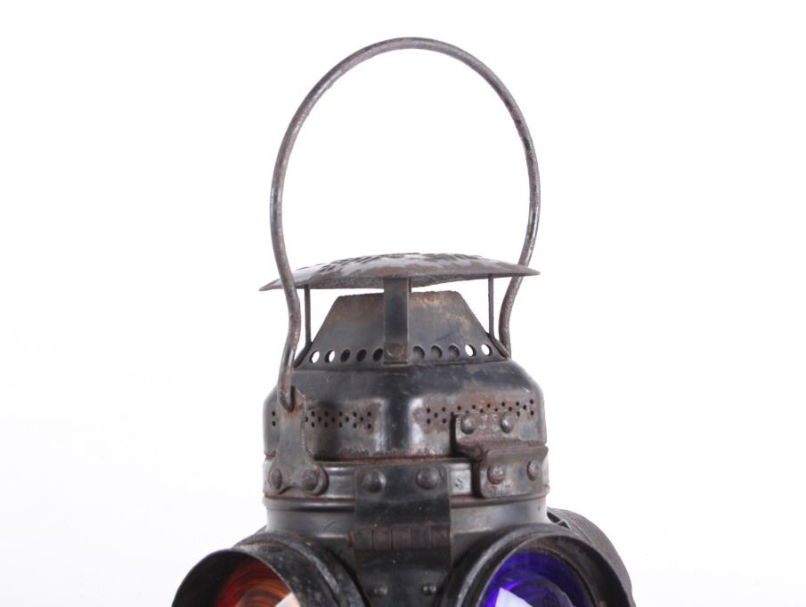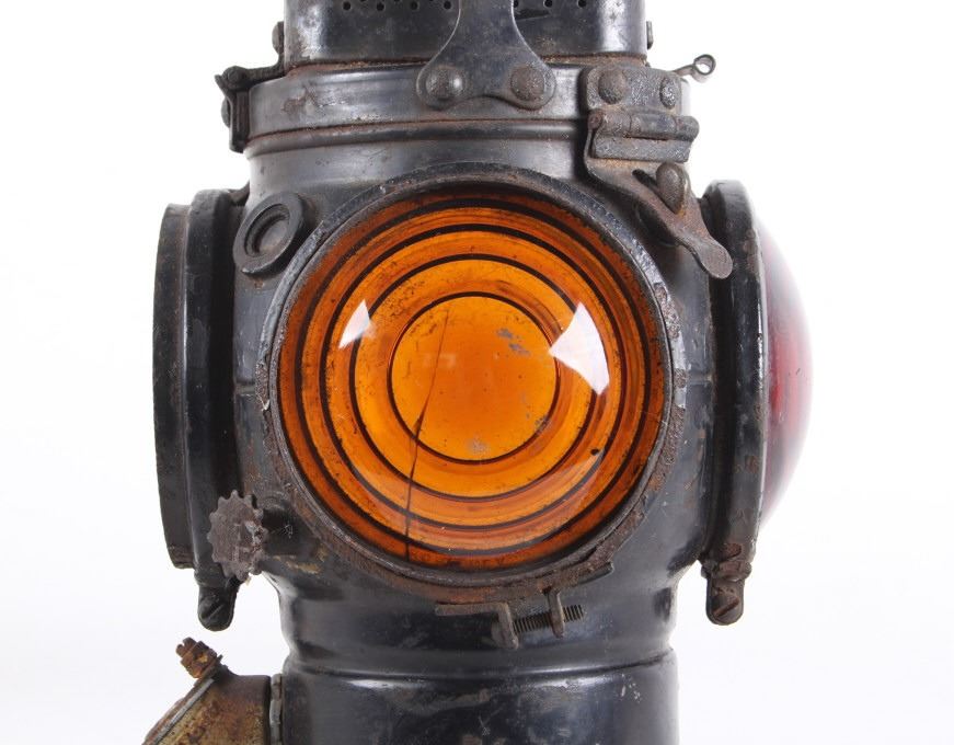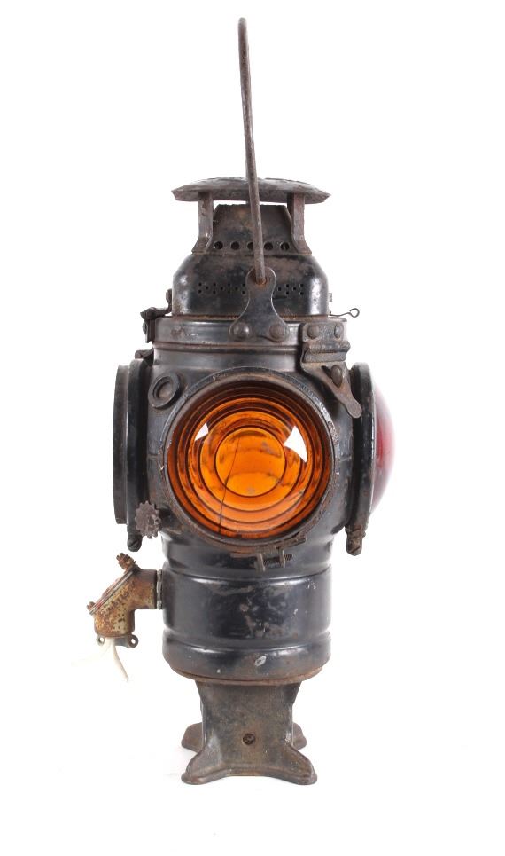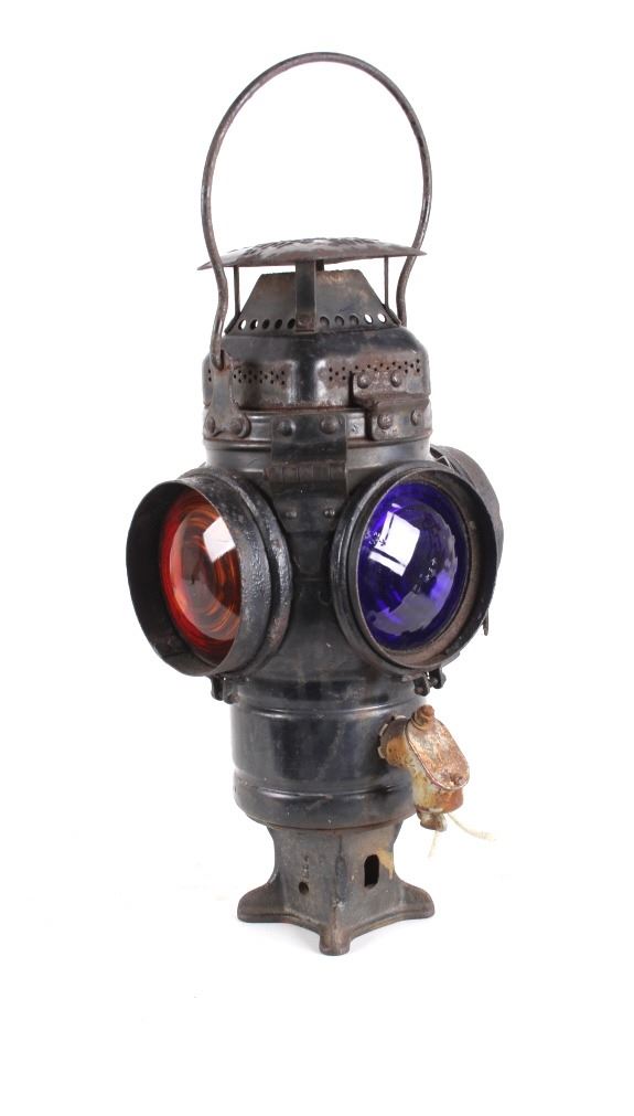 This lot features a early Adlake non-sweating railroad Switch lamp. The lamp was manufactured by the Adlake or Adams & Westlake company. Adams & Westlake was founded in 1857 in Chicago, Illinois. In the beginning, the company manufactured and sold railroad supplies and hardware. With the opening of the American West and expansion of the railroads, the company prospered and diversified. “Adlake” became one of the largest suppliers of equipment to the transportation industry in the world. The lamp is marked Chicago most likely indicating it was produced before the company's move to Indiana in 1927. The lantern design also is comparable to some of the earliest models produced by Adlake. The lantern features four lens, two yellow, one blue, and one red. One of the yellow lenses has a significant crack. The rest of the lenses are in good condition with small amounts of surface wear. The overall condition of the piece is good for its age. Measures: 20" H x 7" Diameter