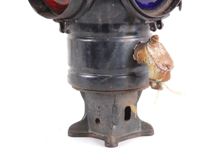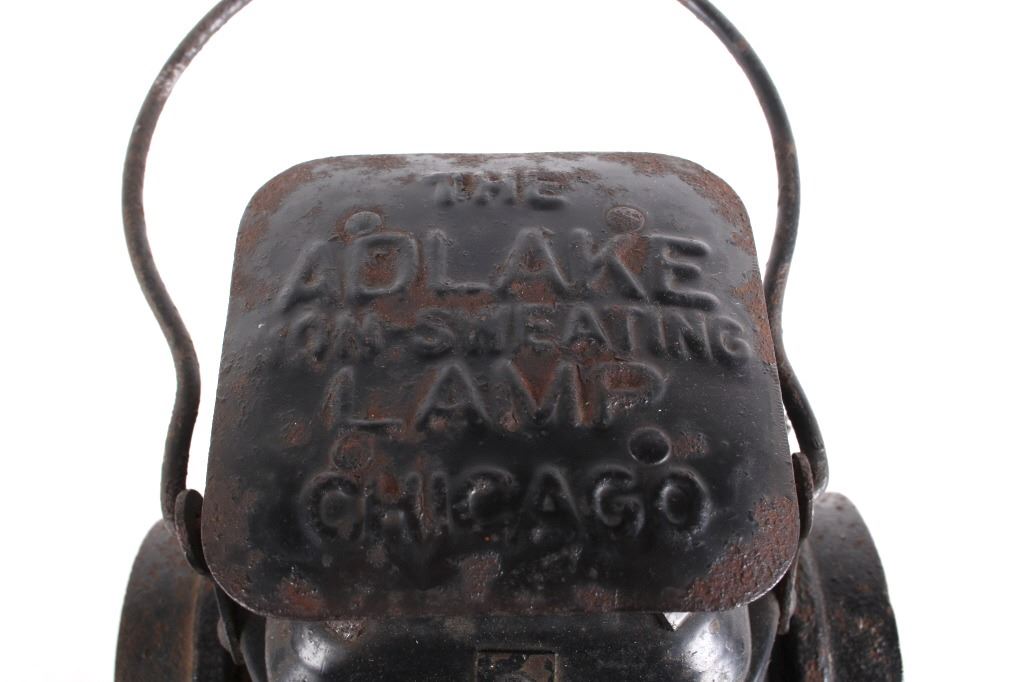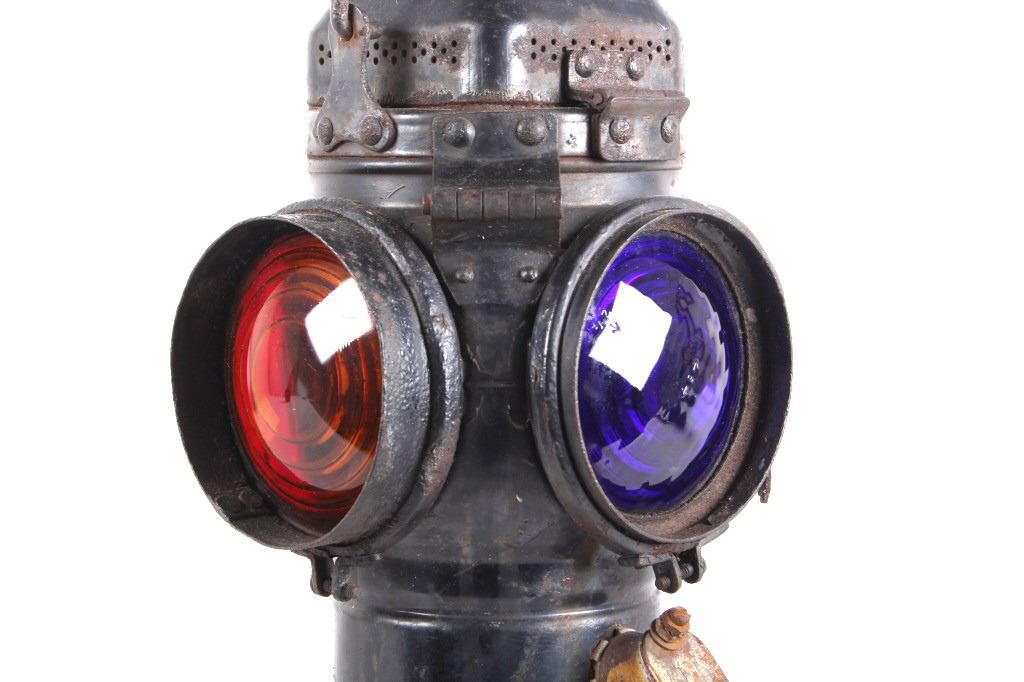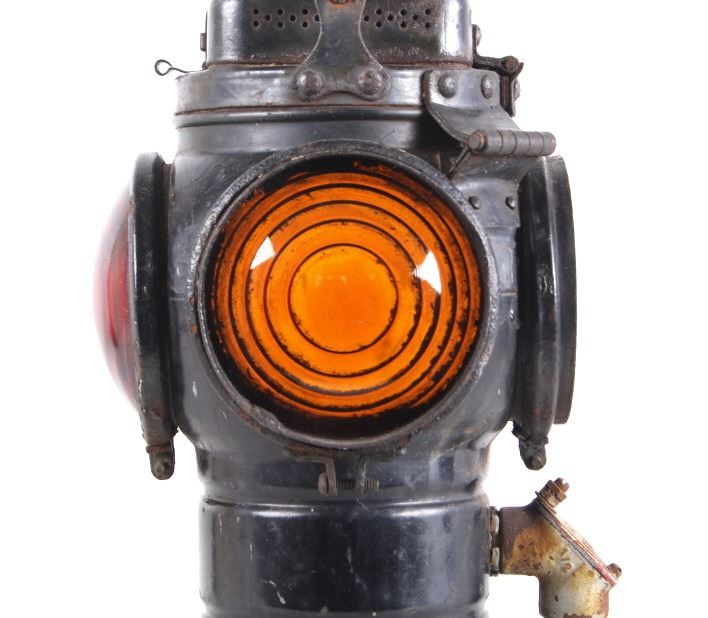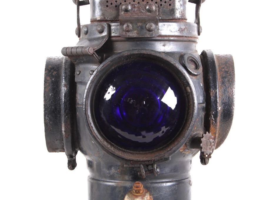 This lot features a early Adlake non-sweating railroad Switch lamp. The lamp was manufactured by the Adlake or Adams & Westlake company. Adams & Westlake was founded in 1857 in Chicago, Illinois. In the beginning, the company manufactured and sold railroad supplies and hardware. With the opening of the American West and expansion of the railroads, the company prospered and diversified. “Adlake” became one of the largest suppliers of equipment to the transportation industry in the world. The lamp is marked Chicago most likely indicating it was produced before the company's move to Indiana in 1927. The lantern design also is comparable to some of the earliest models produced by Adlake. The lantern features four lens, two yellow, one blue, and one red. One of the yellow lenses has a significant crack. The rest of the lenses are in good condition with small amounts of surface wear. The overall condition of the piece is good for its age. Measures: 20" H x 7" Diameter