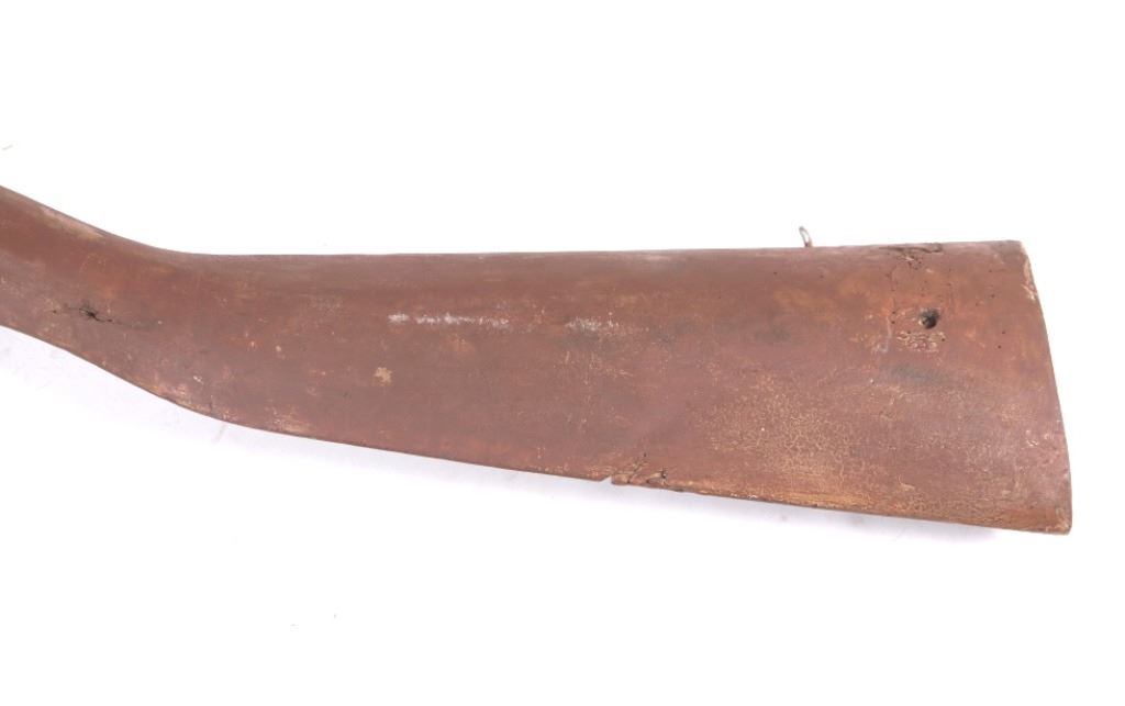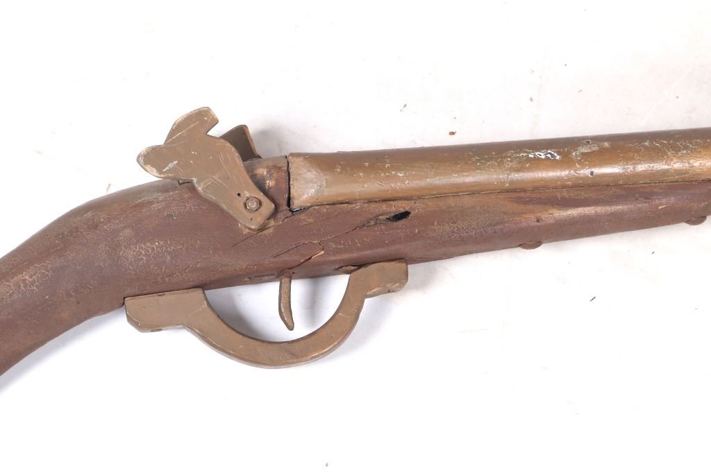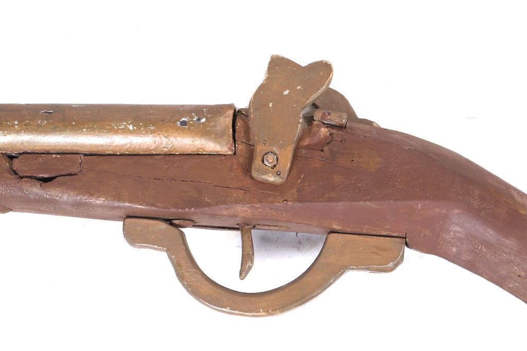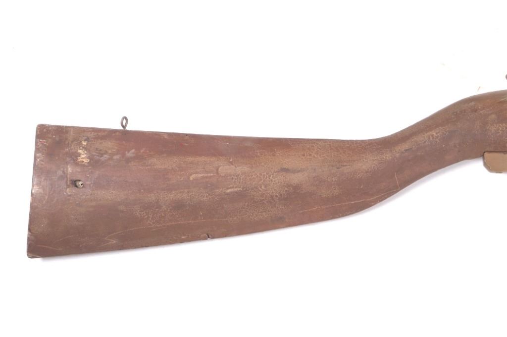 The lot features an excellent gun store mercantile trade sign of a large oversized double barrel shotgun. This sign was used as a trade stimulator and would hang outside the store to attract customers and act as an advertising sign. The piece shows a wooden stock, trigger, trigger guard, and hammers. The barrels show metal construction and are painted with a bronze finish. The trade sign has a massive size and is in fair condition overall, with some damage to the stock and wear across the piece. The piece dates to circa 1890-1900’s. The sign measures 85" long by 8 1/2" at the widest.