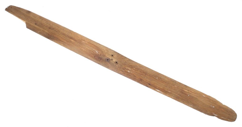 For your bidding pleasure is this Vintage Aerofoil Shape Wooden Propeller. This wooden propeller is a little under 48" long with a proper Aerofoil twist to it. The twisted aerofoil shape of modern aircraft propellers was pioneered by the Wright brothers.The understanding of low speed propeller aerodynamics was fairly complete by the 1920s, but later requirements to handle more power in smaller diameter have made the problem more complex. The propeller has a chip in one side with three holes centered on the propeller around where the prop-shaft is inserted.