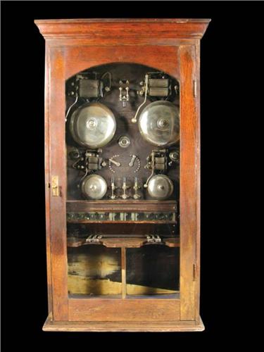 Early Alarm Box, electrical alarm system switchboard 22-1402 by the American Bank Protection Co. 1902. Some water damage to bottom of cabinet otherwise good condition. 21 X 43 X 8 1/2 inches.