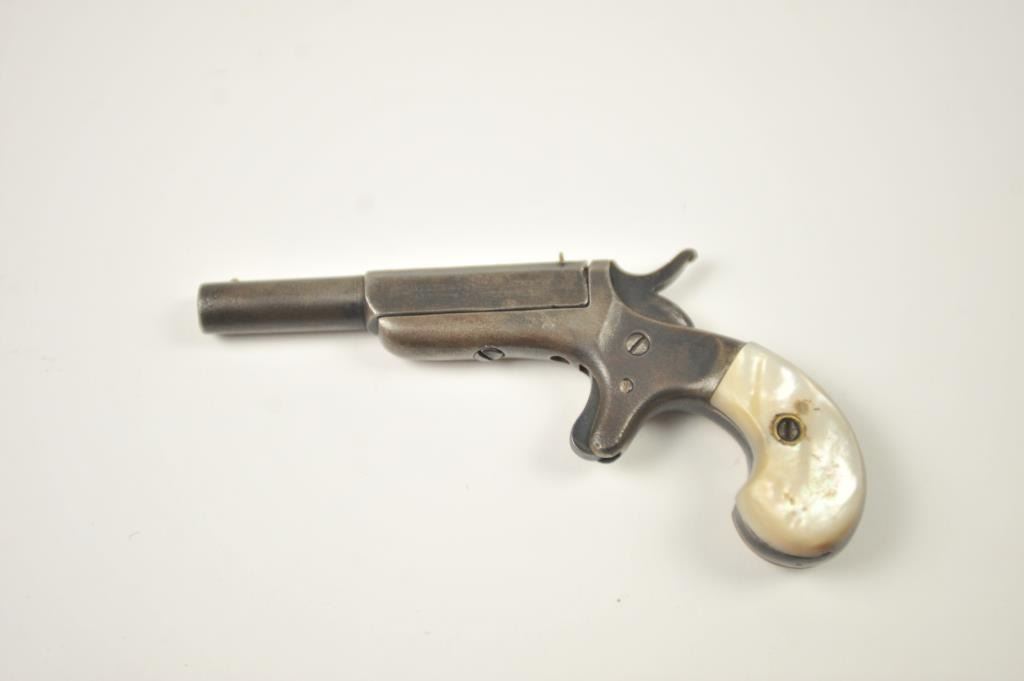 Early Allen Single Shot Derringer with iron frame, 1865 patent date, and pearl grips. Dark gray/brown patina with some erosion and pitting. Thick old pearls show minor loss with minor chips and losses. Ejector intactand the action is working. Good address. 3 ¼” barrel. One of the earlier cartridge derringers. (Antique) Est.: $250-$500