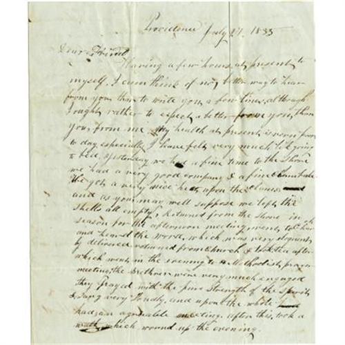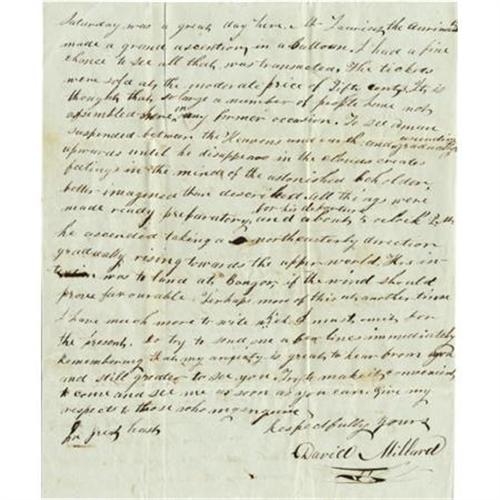 <B>Very Early American Balloon Flight Autograph Letter Signed, </B></I> “<I>David Millard,</B></I> two pages with integral address panel, 8” x 9.5”, Providence, Rhode Island, July 27, 1835, to William R. Wilson, Gloucester, Rhode Island. Relating a weekend of pleasant diversions to a friend, the author mentions in part, “<I>…Saturday was a great day here. Mr. Lauricot made a great ascention sic in a Balloon…to see a man suspended between the Heavens and earth, and ascending gradually upwards until he disappears in the clouds, creates feelings in the mind of the astonished beholder…he ascended, taking a northeasterly direction, gradually rising toward the upper world…</B></I>”. Soiling, smoothed folds. Good condition. <I>From the collection of Henry E. Luhrs.</B></I><BR><BR><b>Shipping:</b> Flat Material, Small (<a target="_blank" href="http://www.heritageauctions.com/common/shipping.php">view shipping information</a>)
