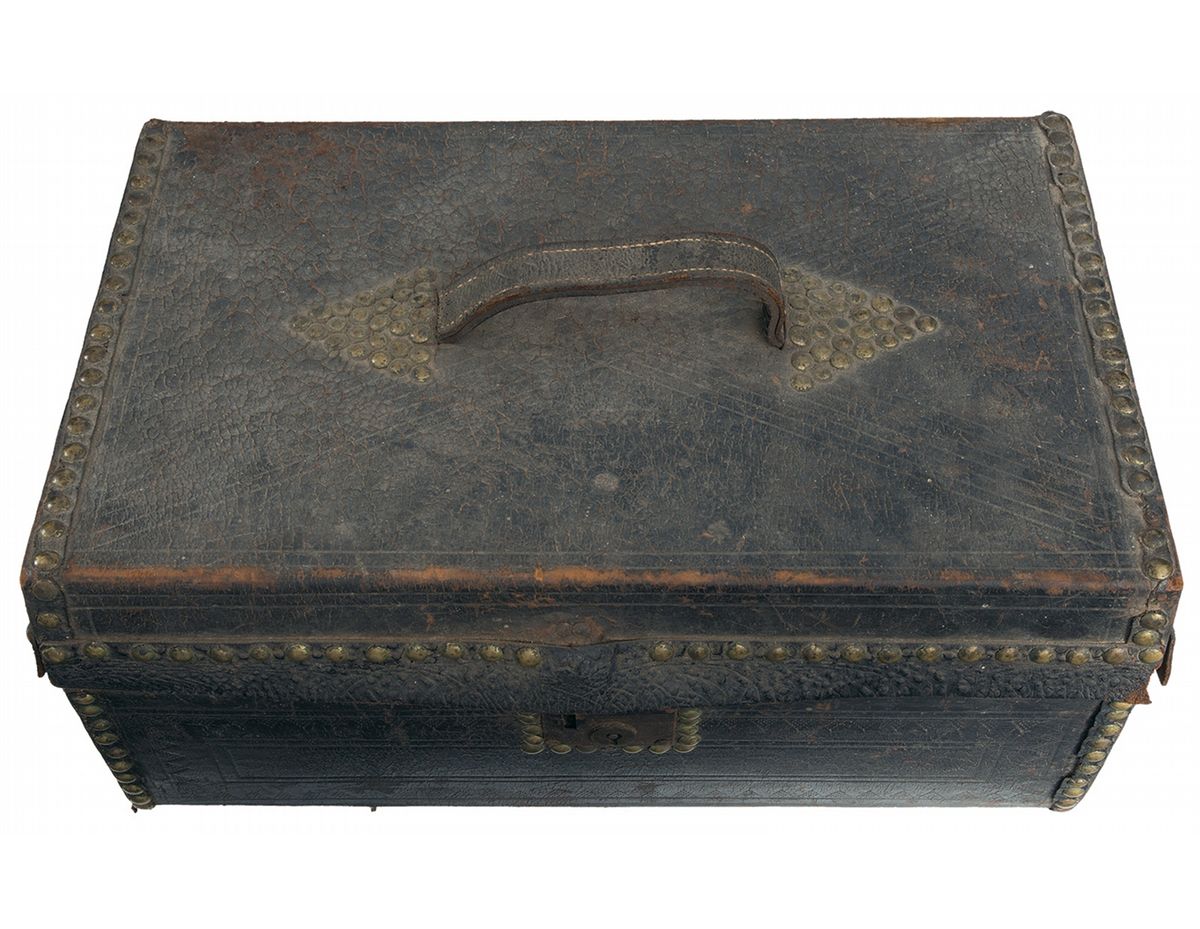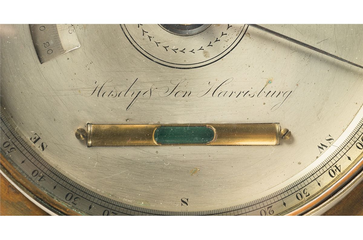 Engraved in script on the silvered compass face, "Heisely & Son Harrisburg". Circa 1811-1843. Charles Smart, in "The Makers of Surveying Instruments in America Since 1700", documents the Heisely family during their three generations as makers. Frederick Heisely, the senior, born 1759, enlisted in Captain Jos. Howell's Company, 2nd PA regiment, in 1778. George, the son, was in Green's Company of the Maryland Militia and then the Harrisburg Volunteers, Captain Walker's Company, active during the war of 1812. This "Heisely & Son" signature dates from 1811 to 1843. The instrument measures 14 inches in length and carries both two sight vanes, and an auxiliary telescope. The compass face has a read-out for the magnetic variation, and one long bubble vial with original blue interior. There is another bubble level outboard of the compass on the mainplate. On the side of the compass is a graduated vertical arc and vernier, this was used to record vertical angles, which while slope chaining, reduced to horizontal distance by trigonometric functions. The original compass cover, ball and socket, tripod, plumb bob, measuring chain and tacked leather covered case accompany the instrument.