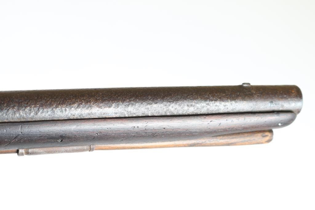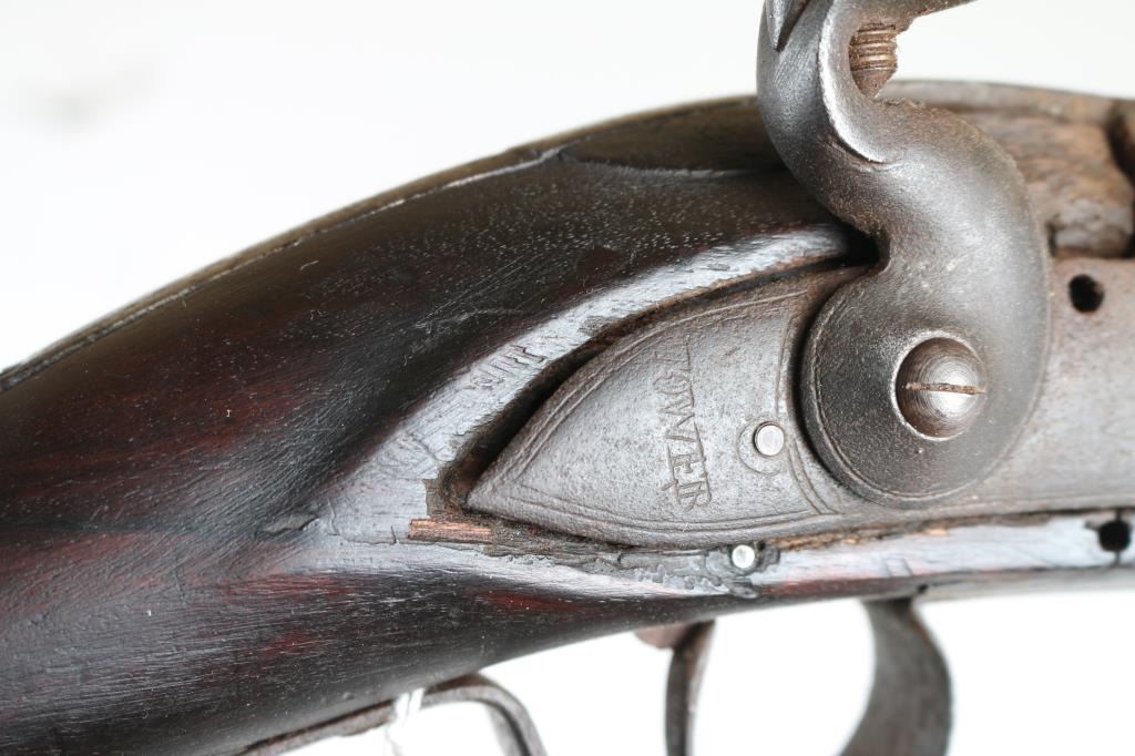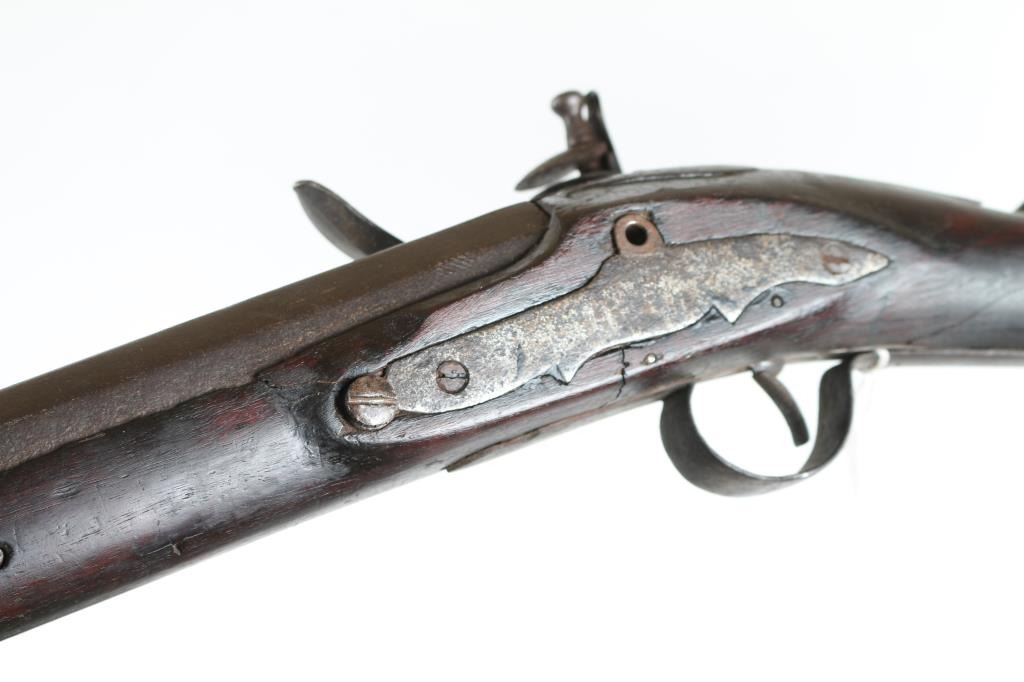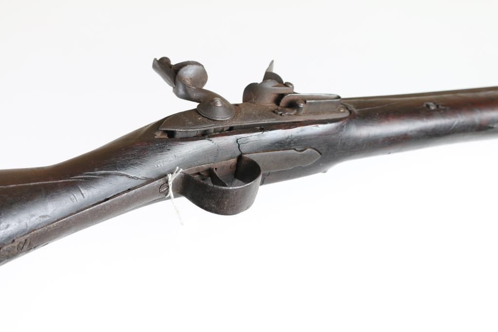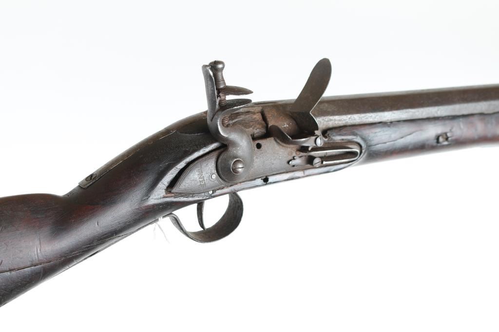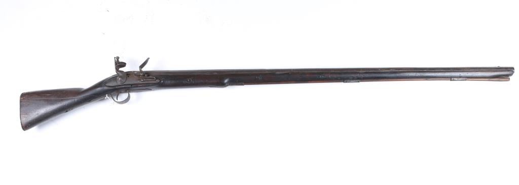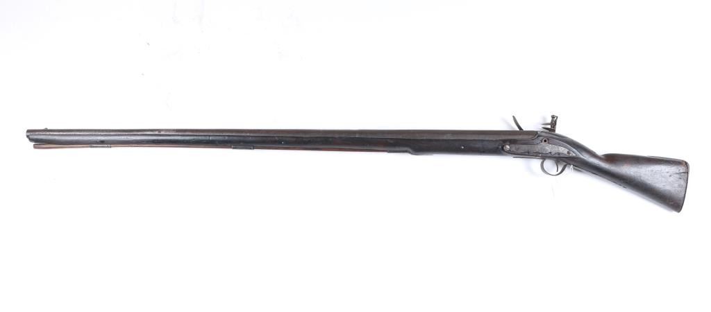 Wall or Punt gun with plain steel mounts and approx 50 inch barrel with 65 inch overall in 80 cal. With smooth bore an approx 10GA. The lock appears to be of a replacement to the correct period, showing Tower and GR about 1780-1800 period and the stock and mounts are mid to 3rd quarter of the 18th century. It has both Germanic and American styling and features an old collection or museum. Number is painted on left side of stock "1221" with heavy brown patina with rust and erosion showing matching age to lock and parts. Numerous stock cracks,and alot of distress from general aging. Some screws replaced and lock not working but complete. A period ram-rod. James Aplan likely obtained from the local tribal members as kept a long while in his museum. Antique Firearm NRA Poor/Fair