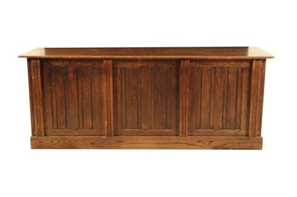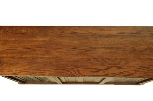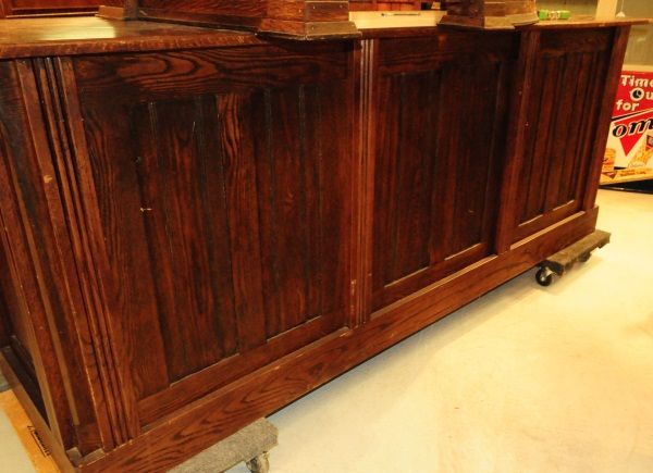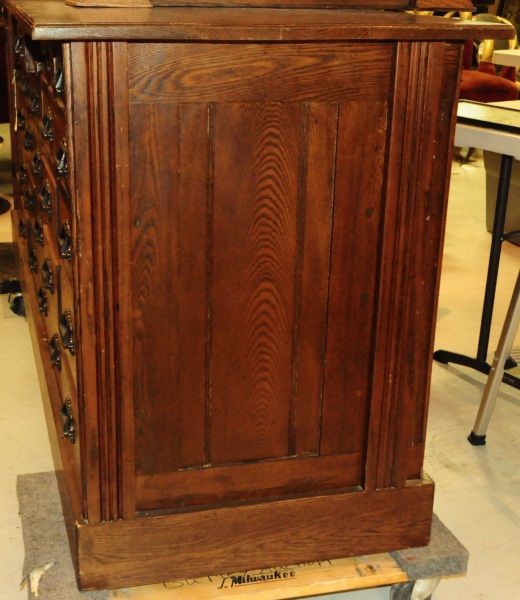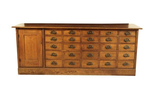Square nails, cast iron pulls with ID labels- incised lines, 25 drawers 1 door with lock and key, professionally restored. Measures 26 1/2" deep x 90" wide x 35 1/2" tall.