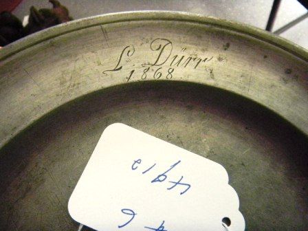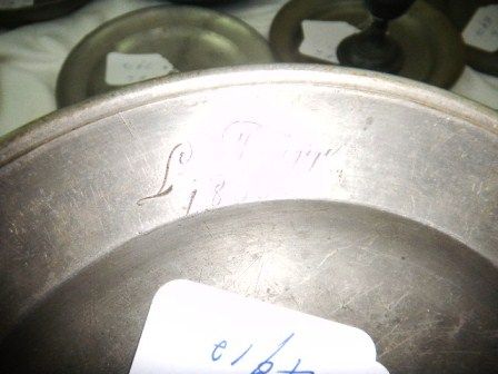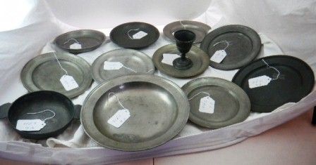 Twelve Early American Pewter Pieces. One dated 1866, tarnished and worn with some dings, scratches. Some items has stamps and identifying numbers.