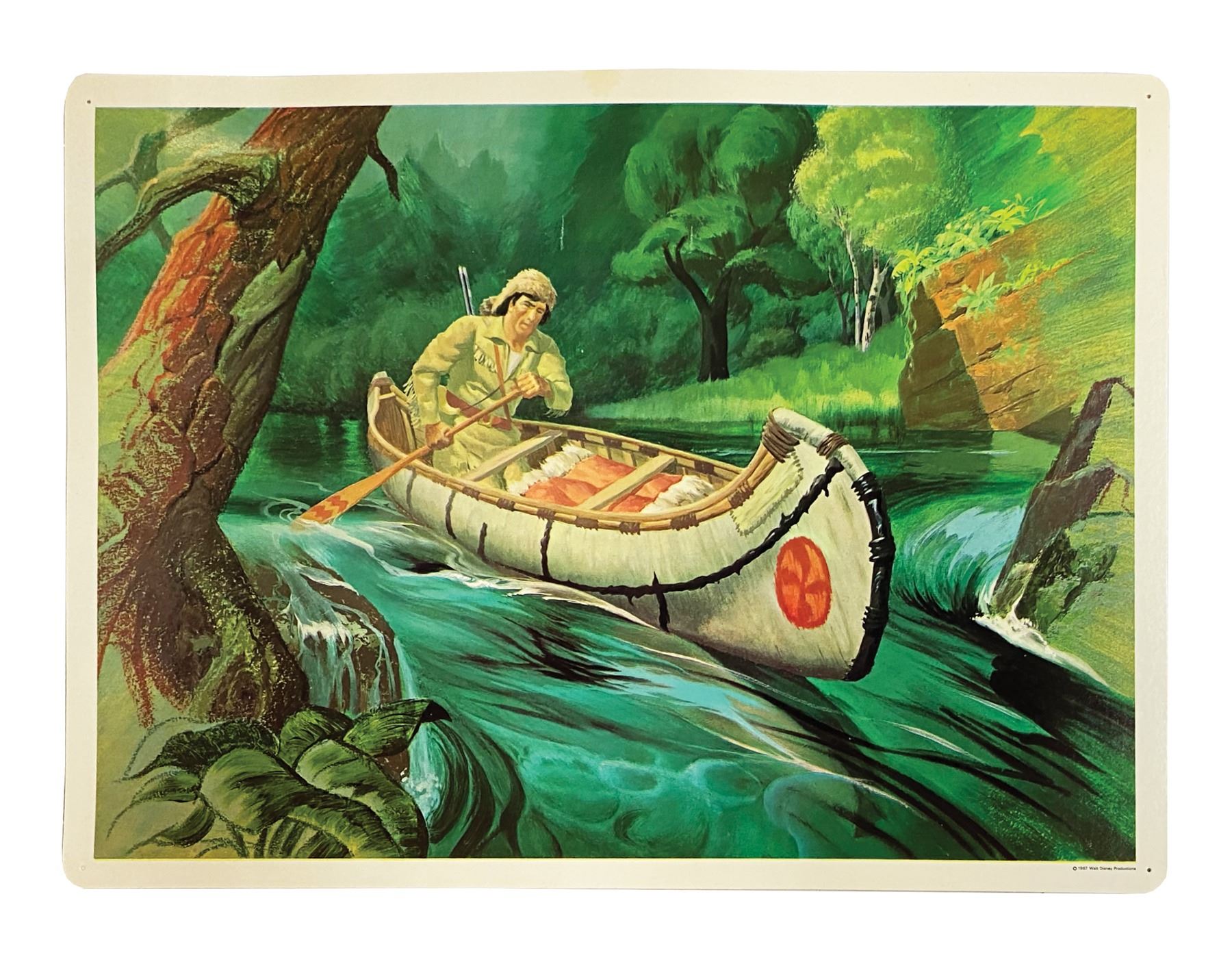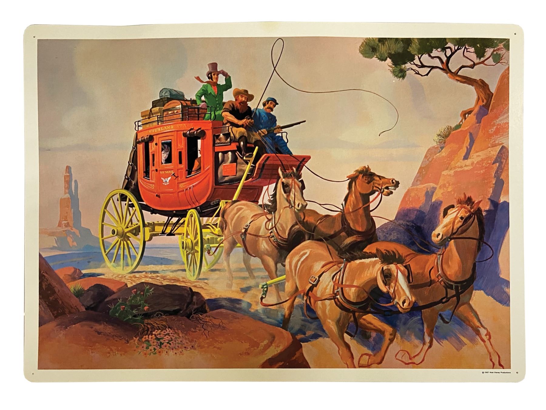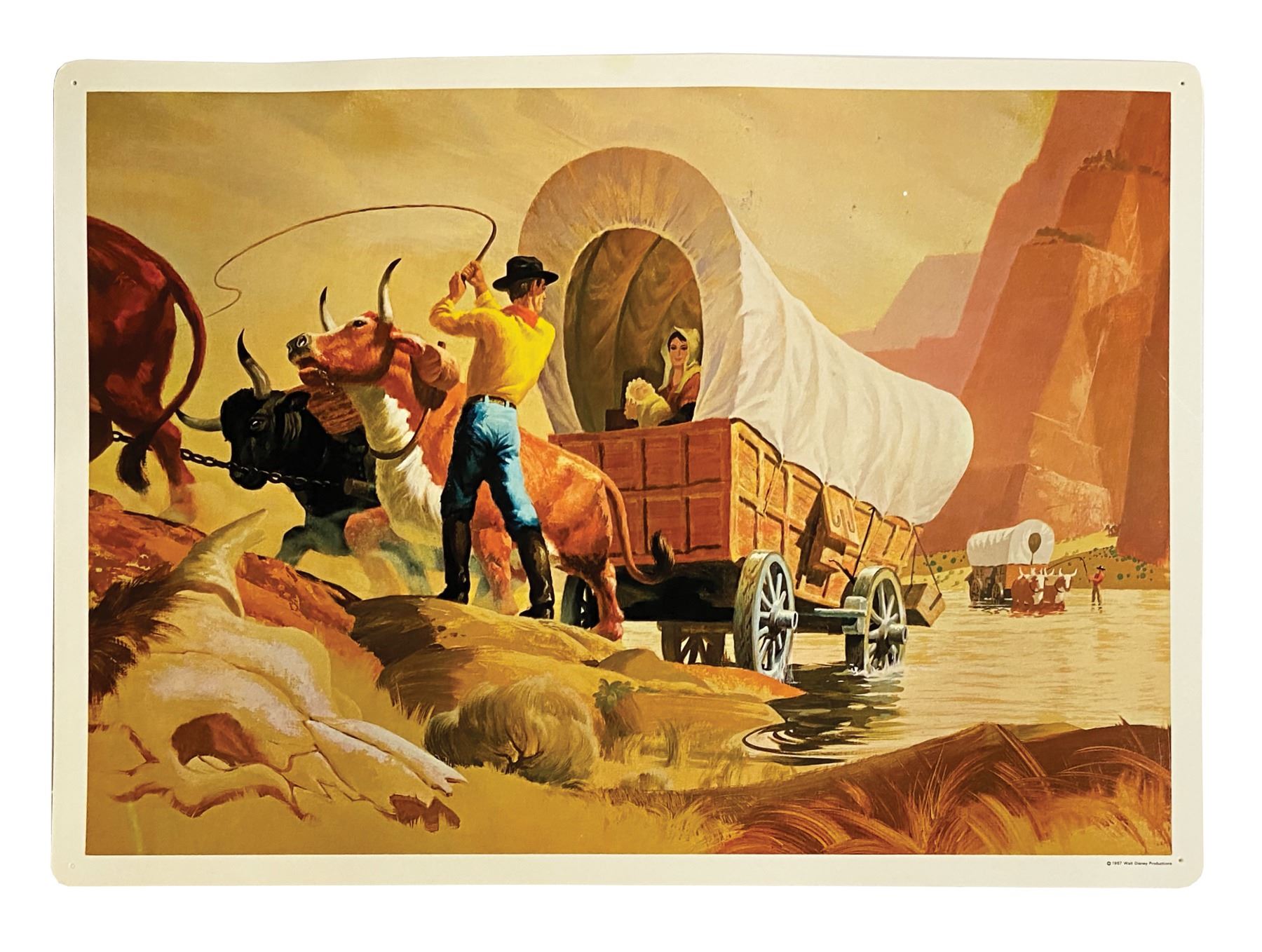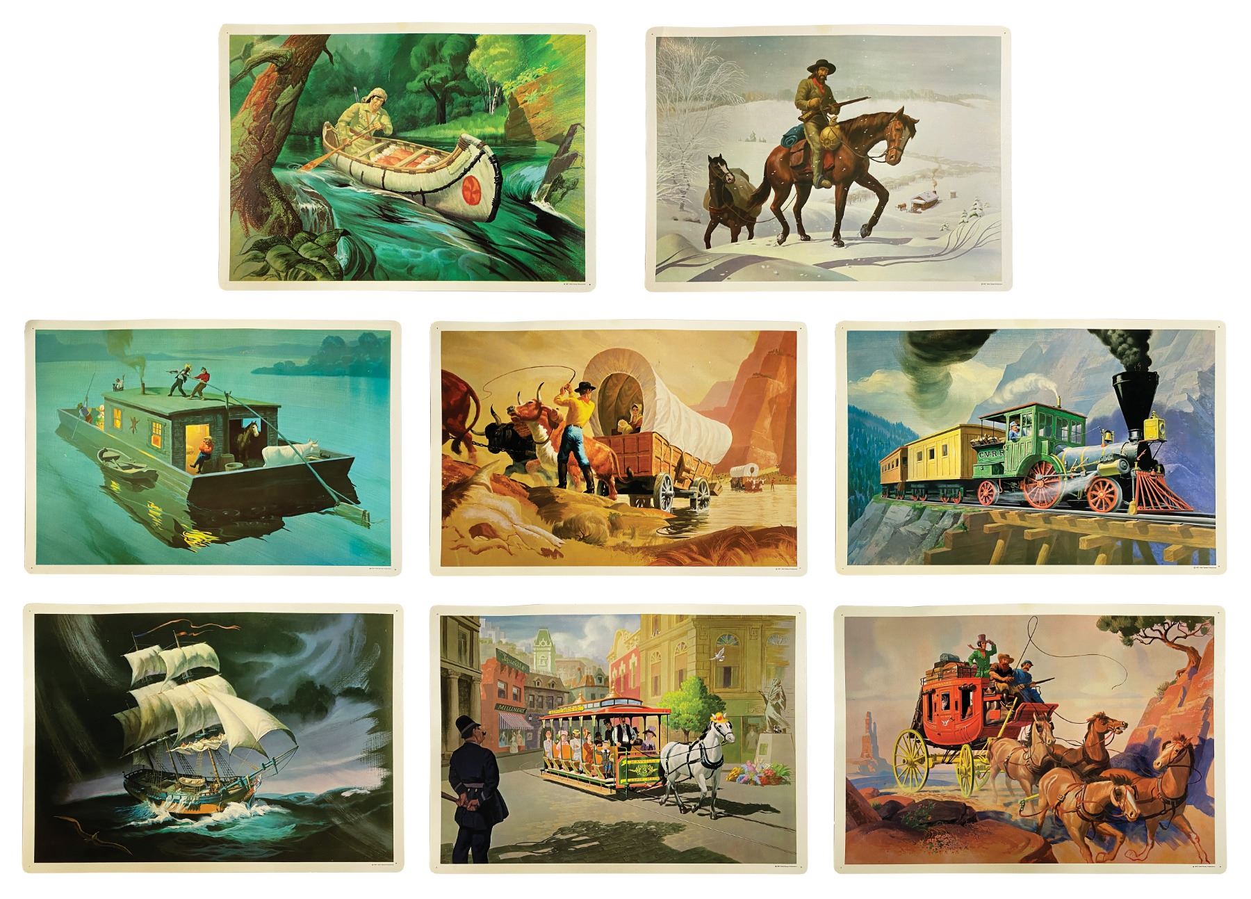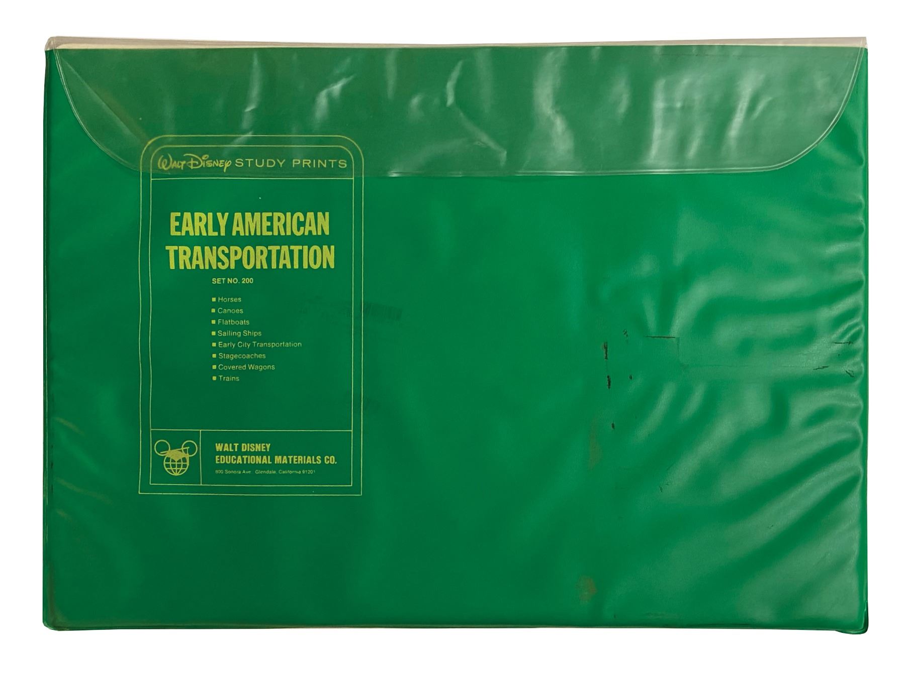 (Disney, 1967) A complete set of (8) Set No. 200 Early American Transportation Walt Disney Study Prints published by Walt Disney Educational Materials Co. Each card features printed information about a primary mode of transportation from the 18th-19th century on the reverse and a lavish color illustration on the face. The original vinyl storage envelope is included. Measuring 13"x18", the prints are in very good condition with some minor waviness, faint spot staining, and pin point surface loss. All are equipped with holes for pushpins in the corners and retain a "Feaster School Library" ink stamp in the upper right margin of the reverse. The envelope exhibits some soiling and ink stamps.