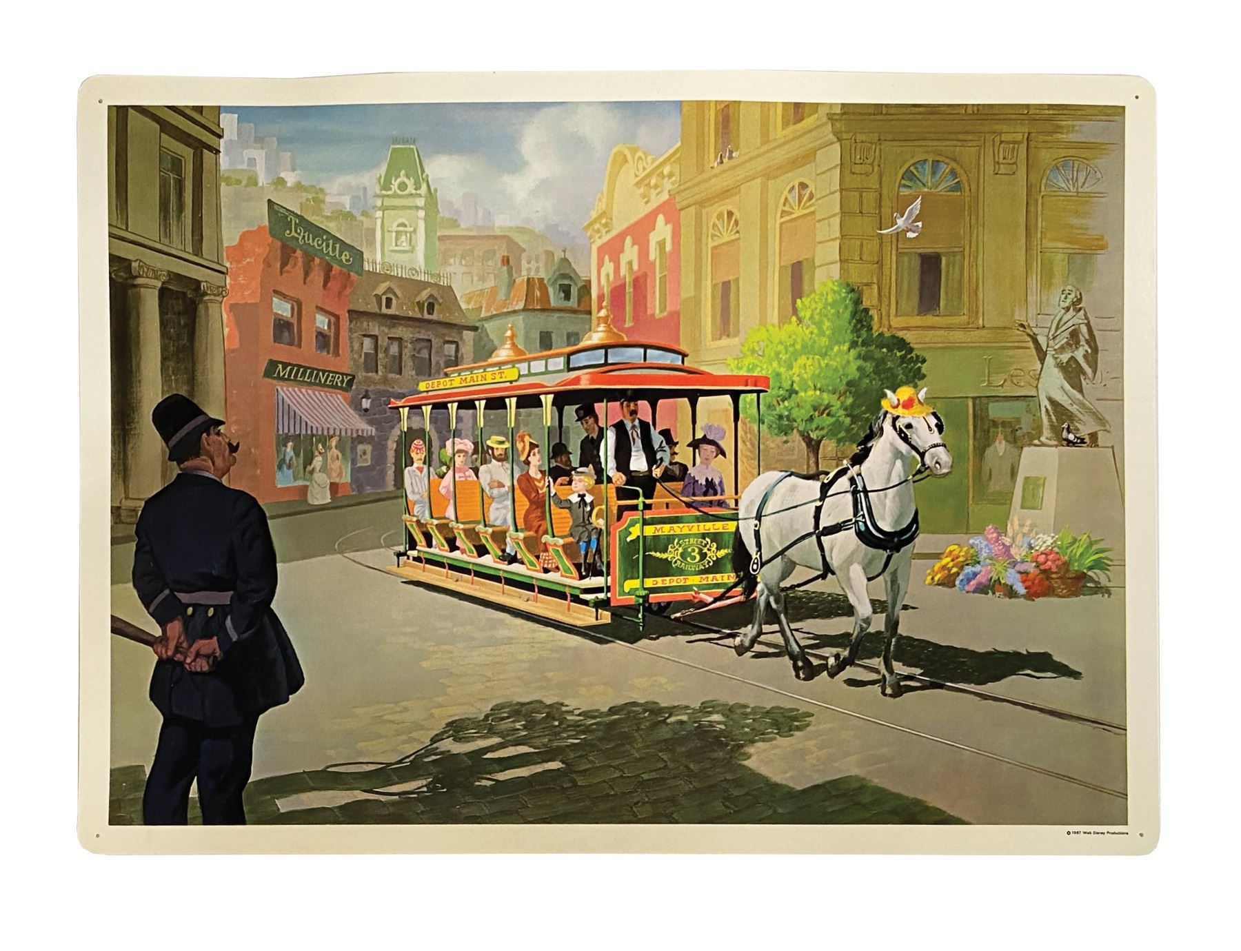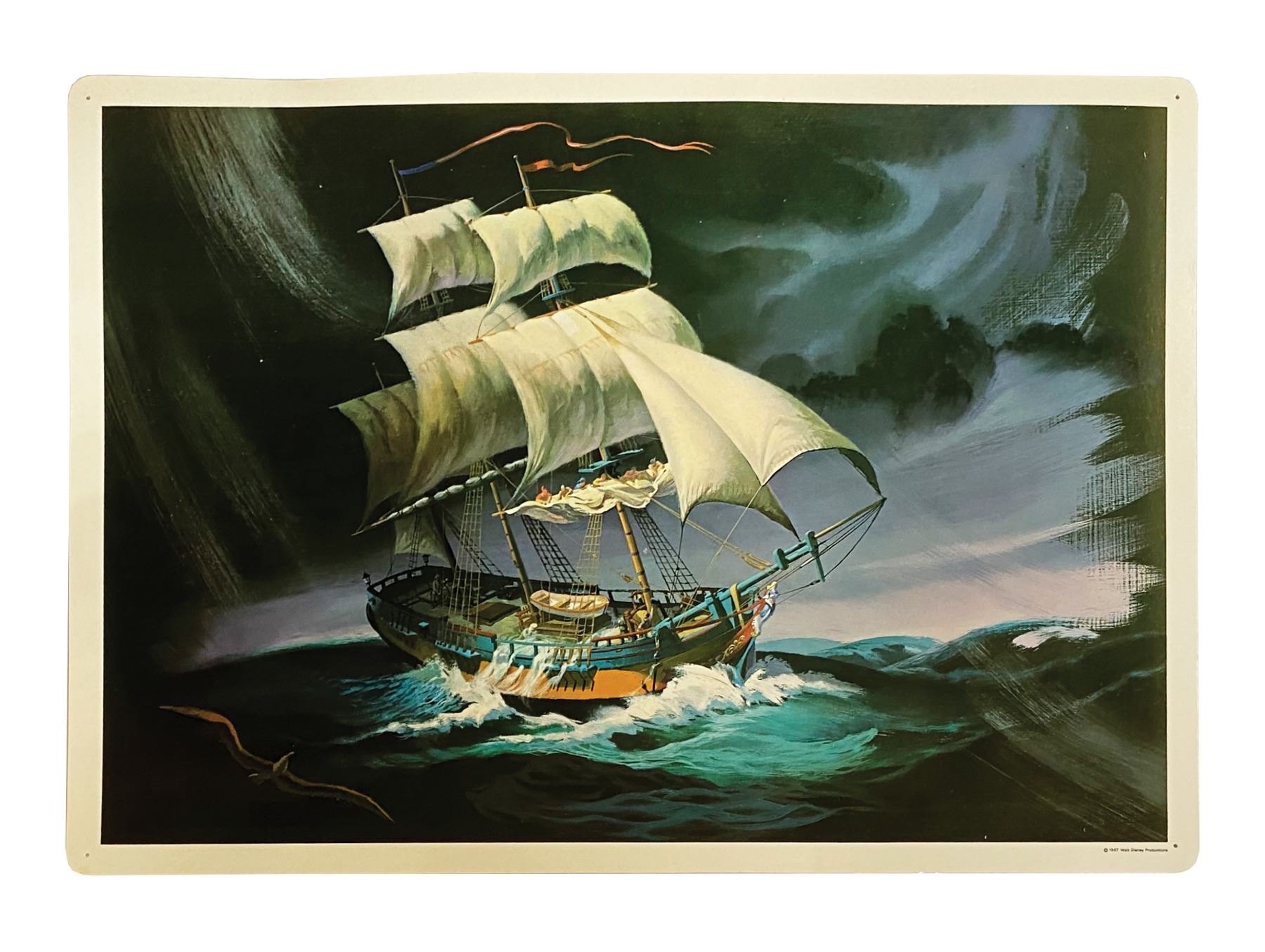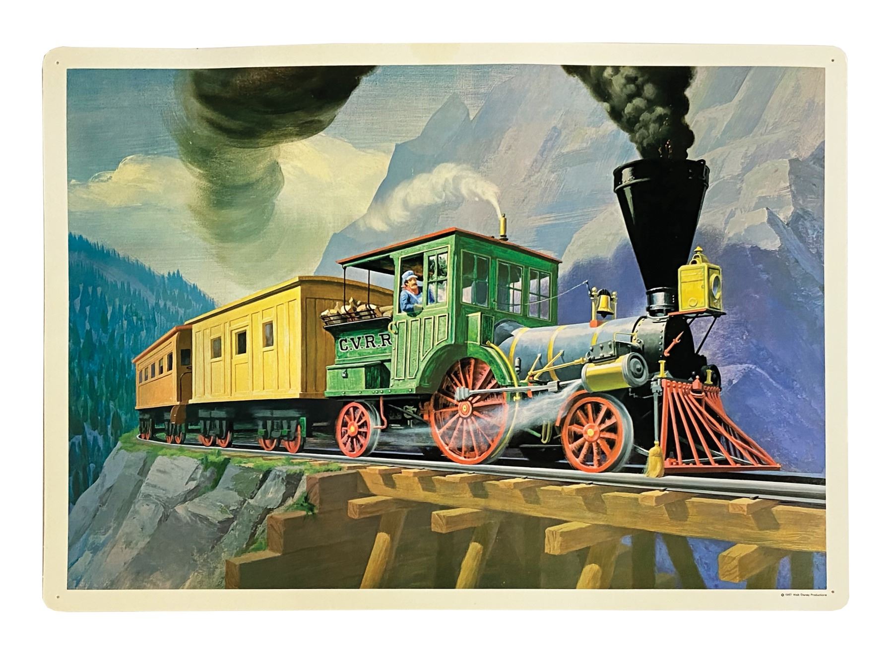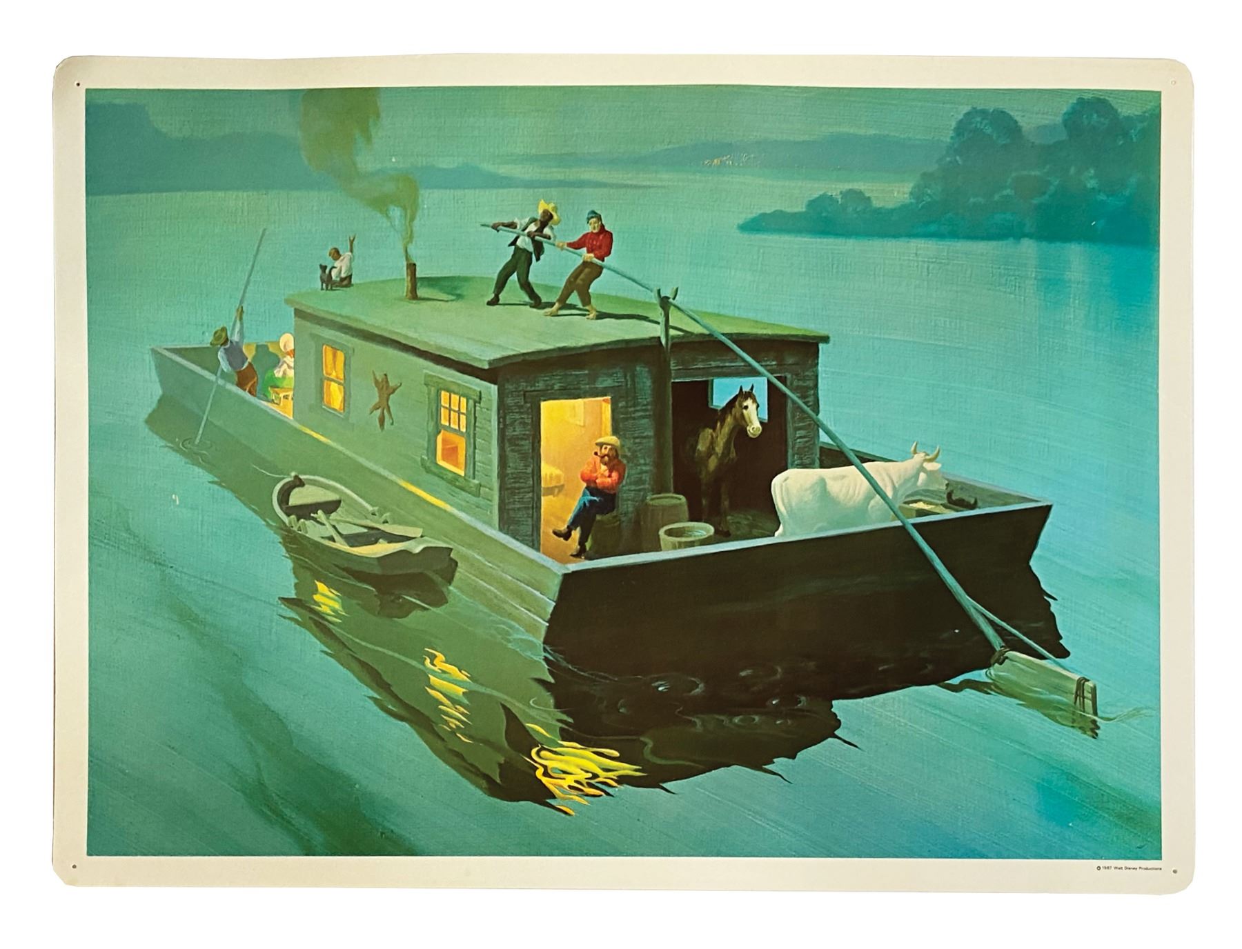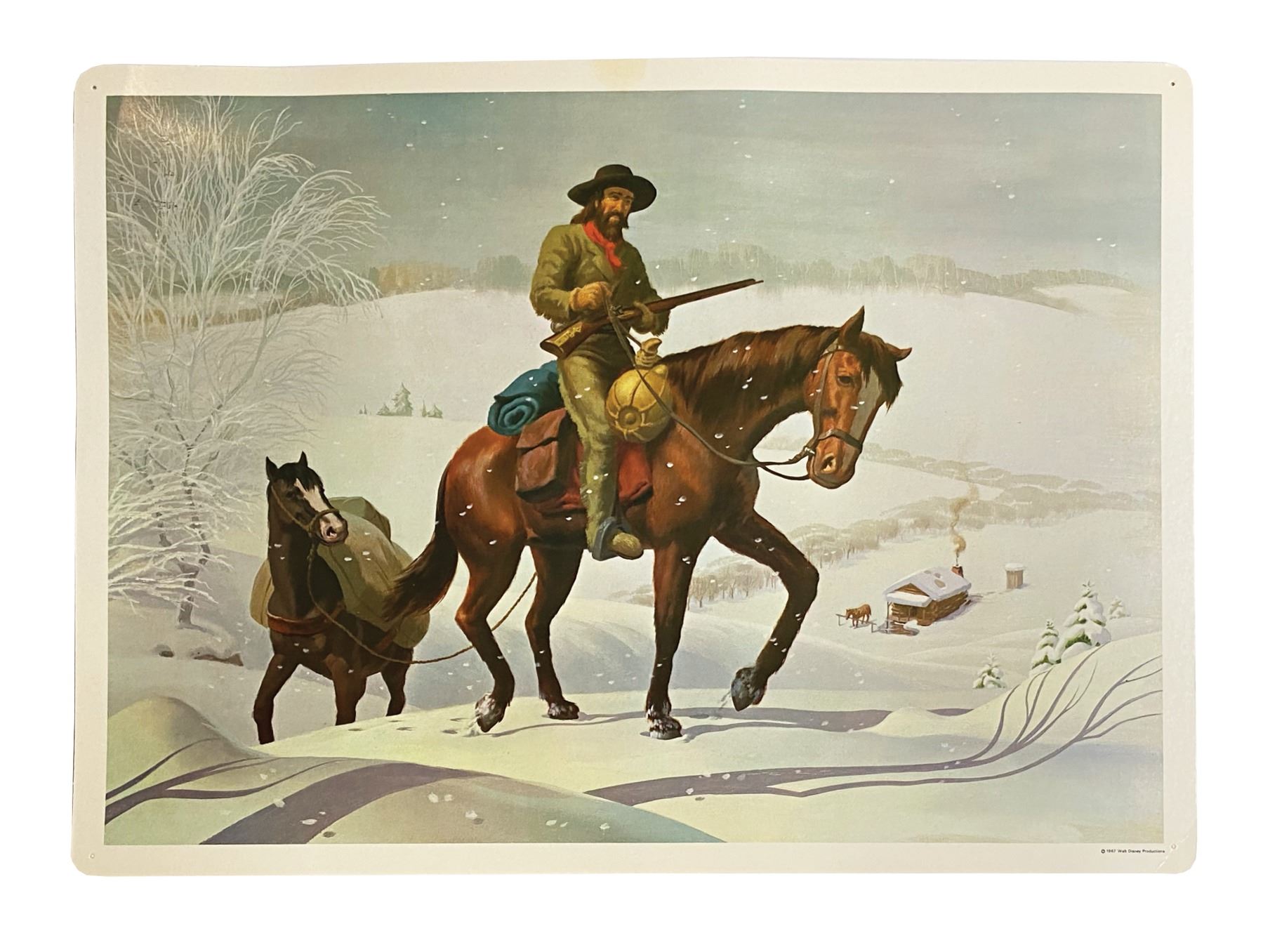 (Disney, 1967) A complete set of (8) Set No. 200 Early American Transportation Walt Disney Study Prints published by Walt Disney Educational Materials Co. Each card features printed information about a primary mode of transportation from the 18th-19th century on the reverse and a lavish color illustration on the face. The original vinyl storage envelope is included. Measuring 13"x18", the prints are in very good condition with some minor waviness, faint spot staining, and pin point surface loss. All are equipped with holes for pushpins in the corners and retain a "Feaster School Library" ink stamp in the upper right margin of the reverse. The envelope exhibits some soiling and ink stamps.