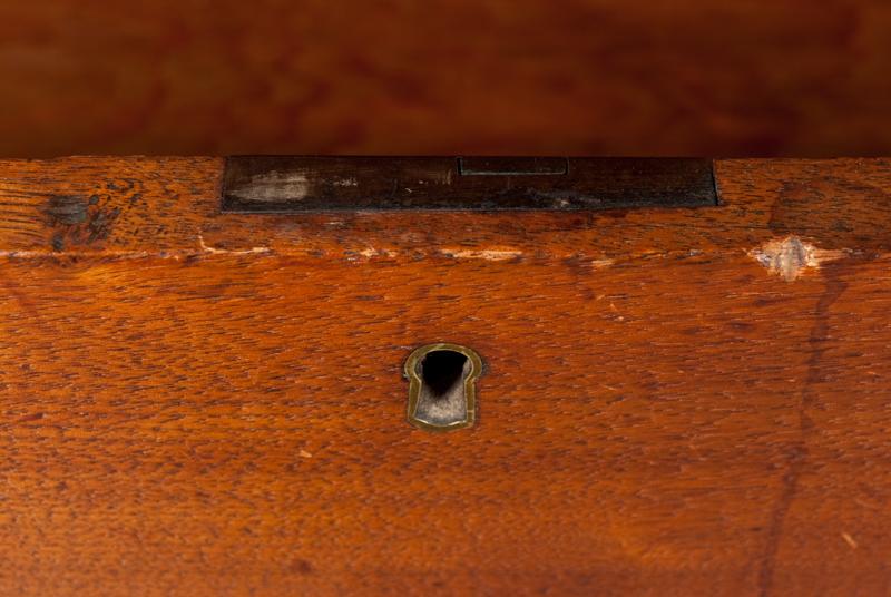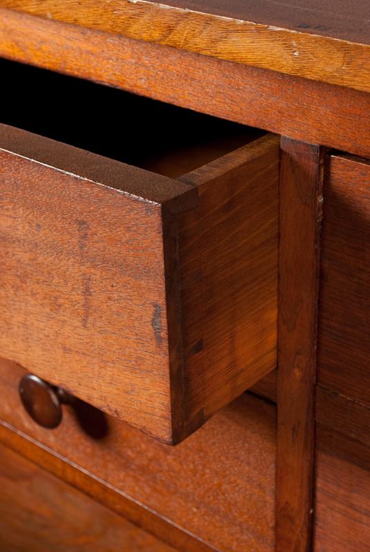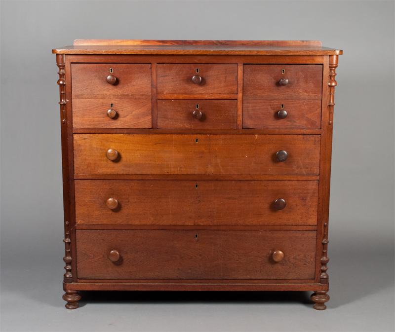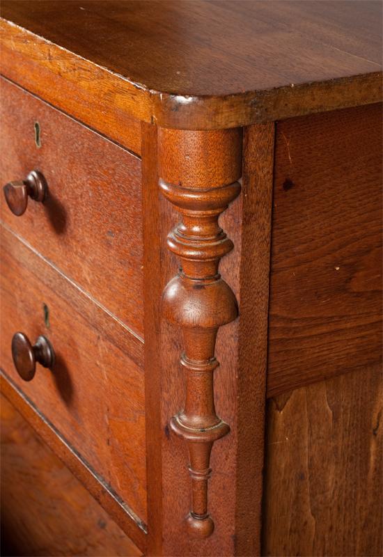 Four drawers over three large drawers with canted corners, all with hand cut dovetails. The corners with applied urn form turnings, raised on four turned wood feet with castors, original turned wood knobs and small back splash. 49" H x 47.75" W x 21.25" D. Three drawers lacking locks, two pulls with losses, two drawers lacking drawer stops. Probably later castors. Circa 1860.