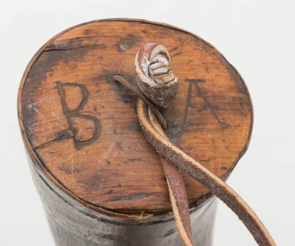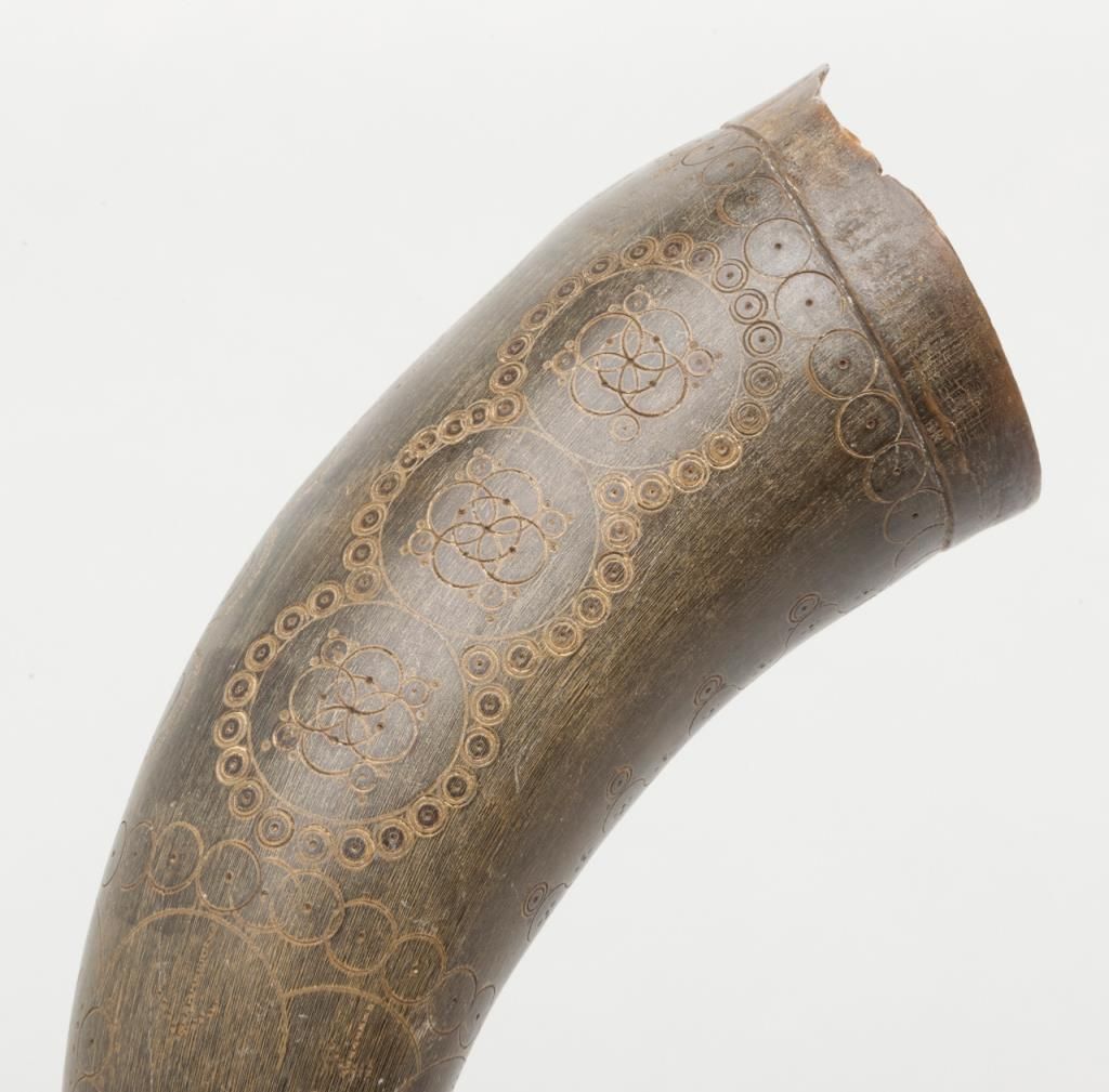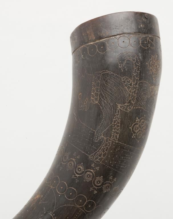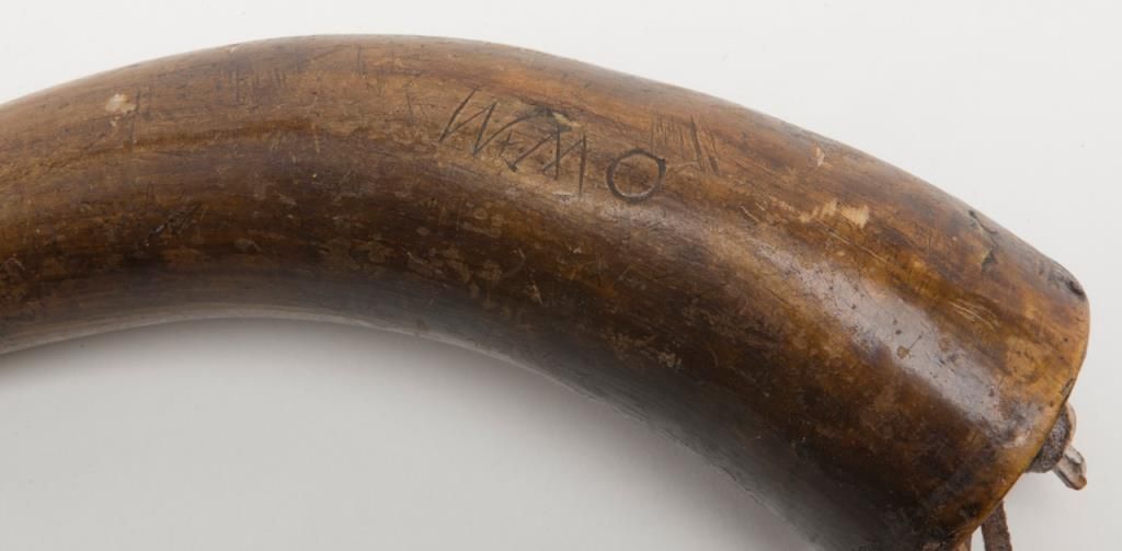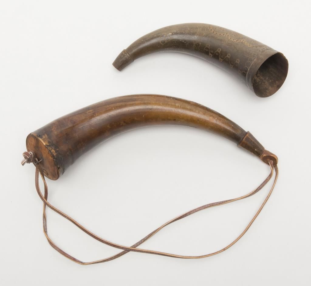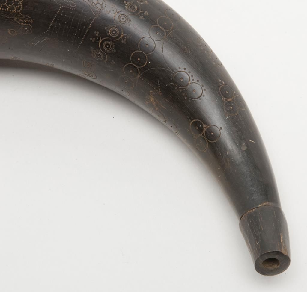 Early American signal horn nicely carved with dog, and powder horn; both 19th century. Est.: $200-$400.