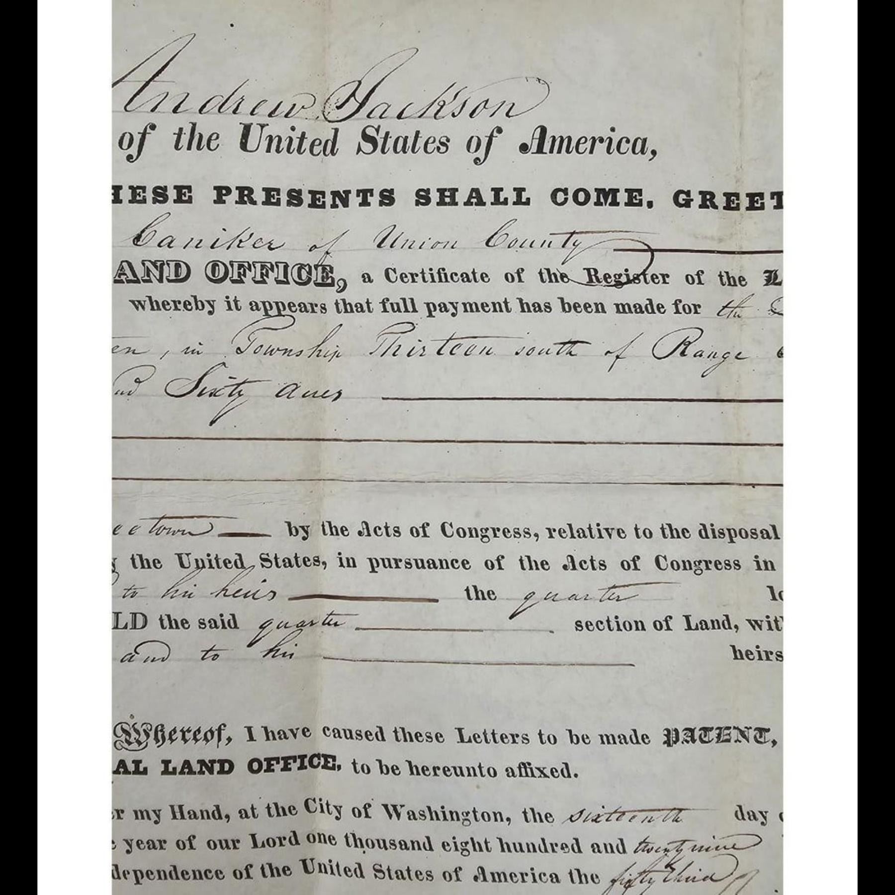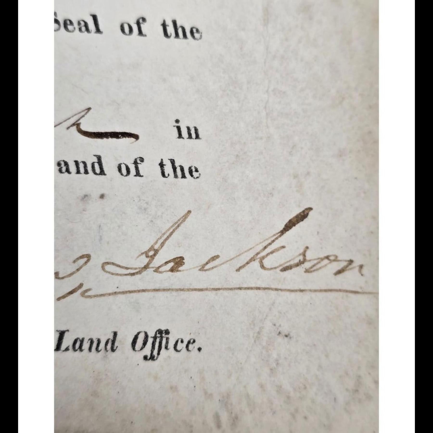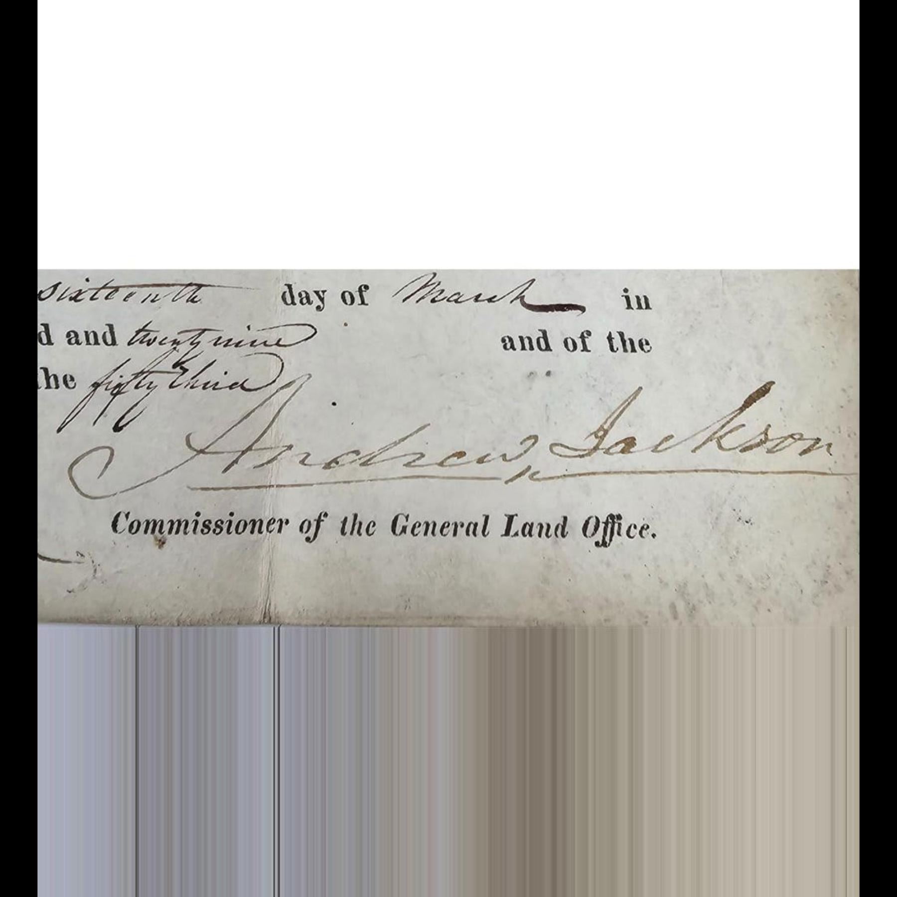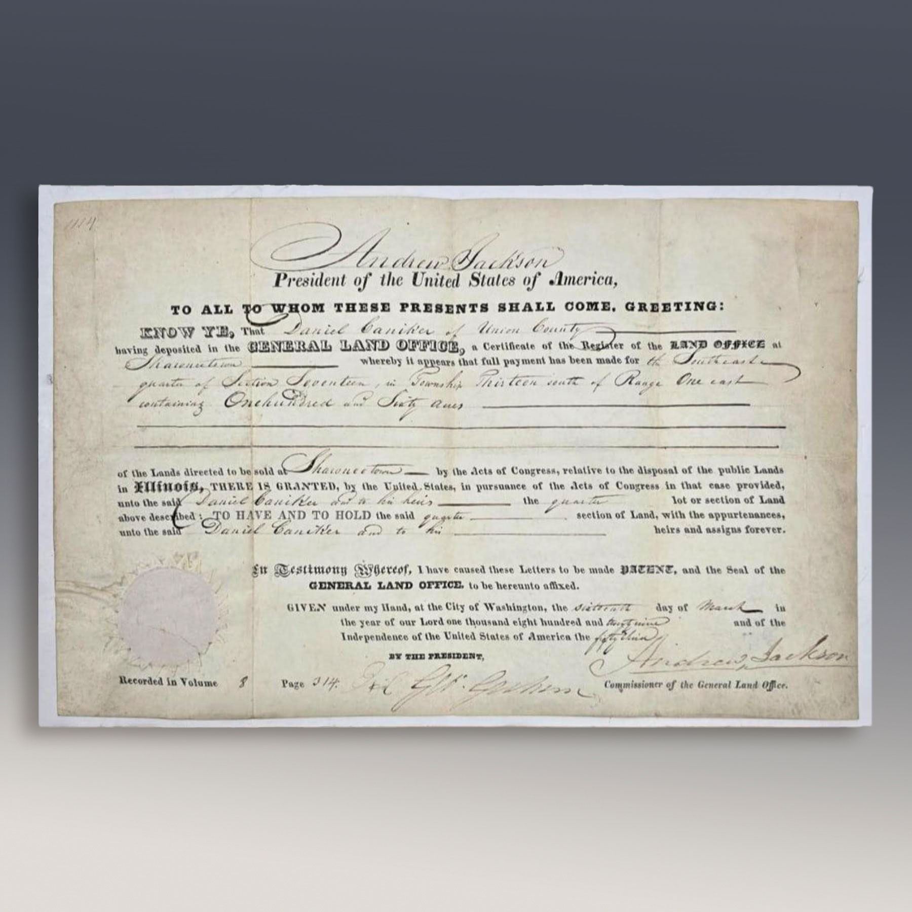 Early Andrew Jackson Document March 16th 1829, 12 Days After His Inauguration 03/04/1829. Land grant for 160 Acres of Shawnee Town, Illinois on The Ohio River, "Old Shawnee Town" Before 1937 Flood. Historically Famous U.S President Early Signature. Provenance: One Person Private Estate Central Florida.