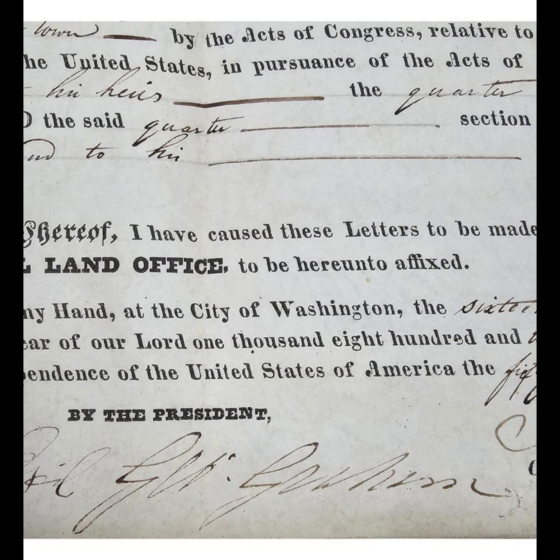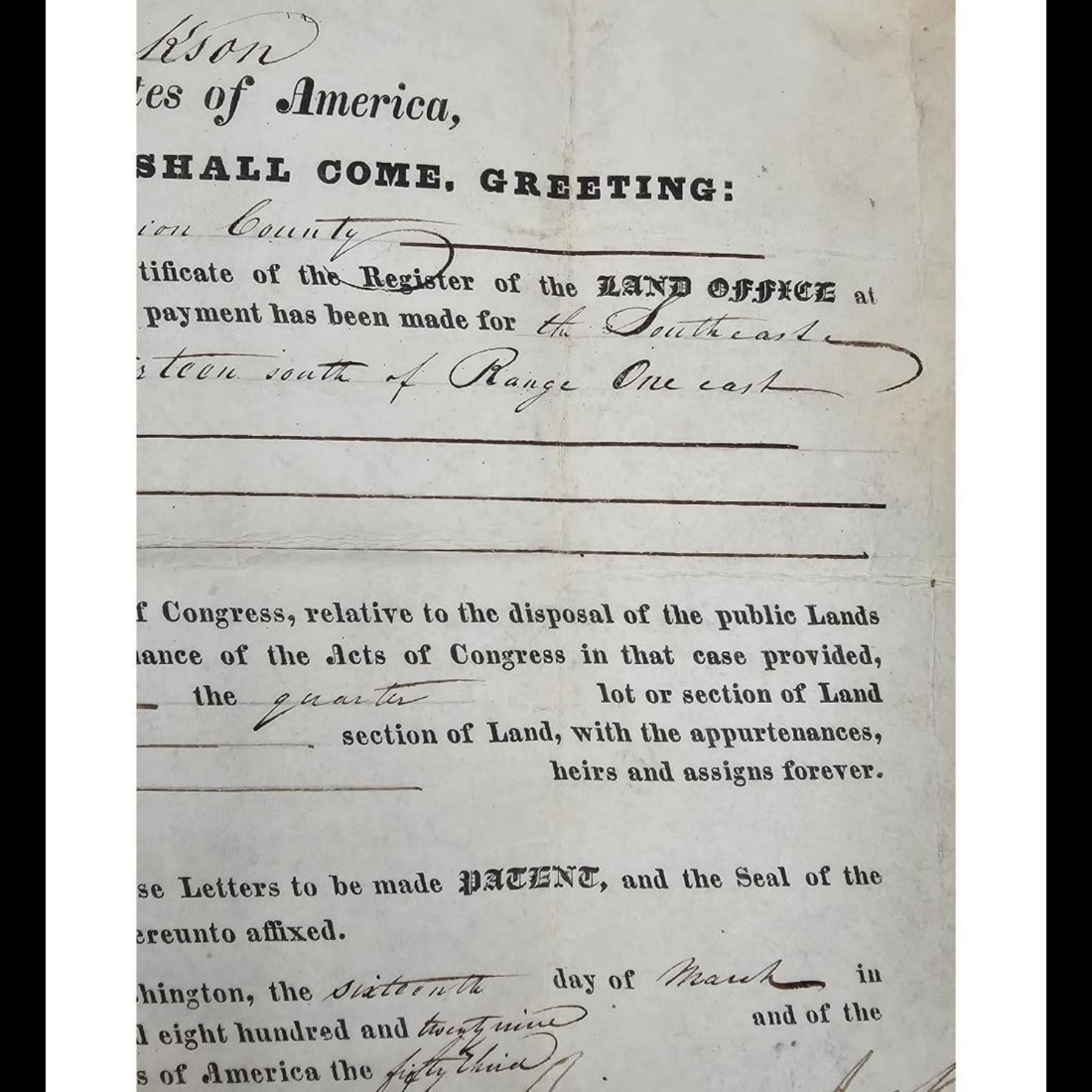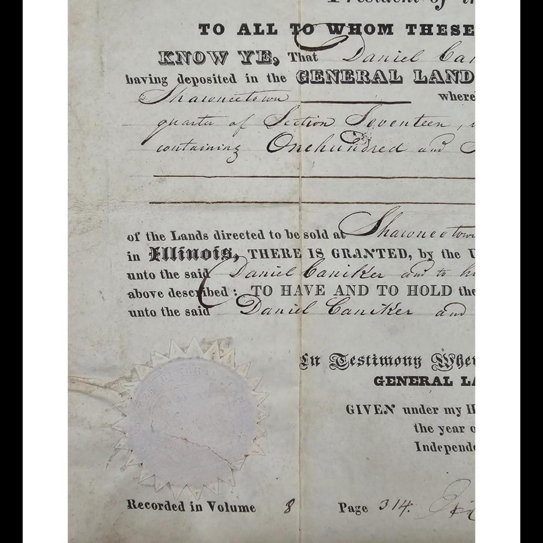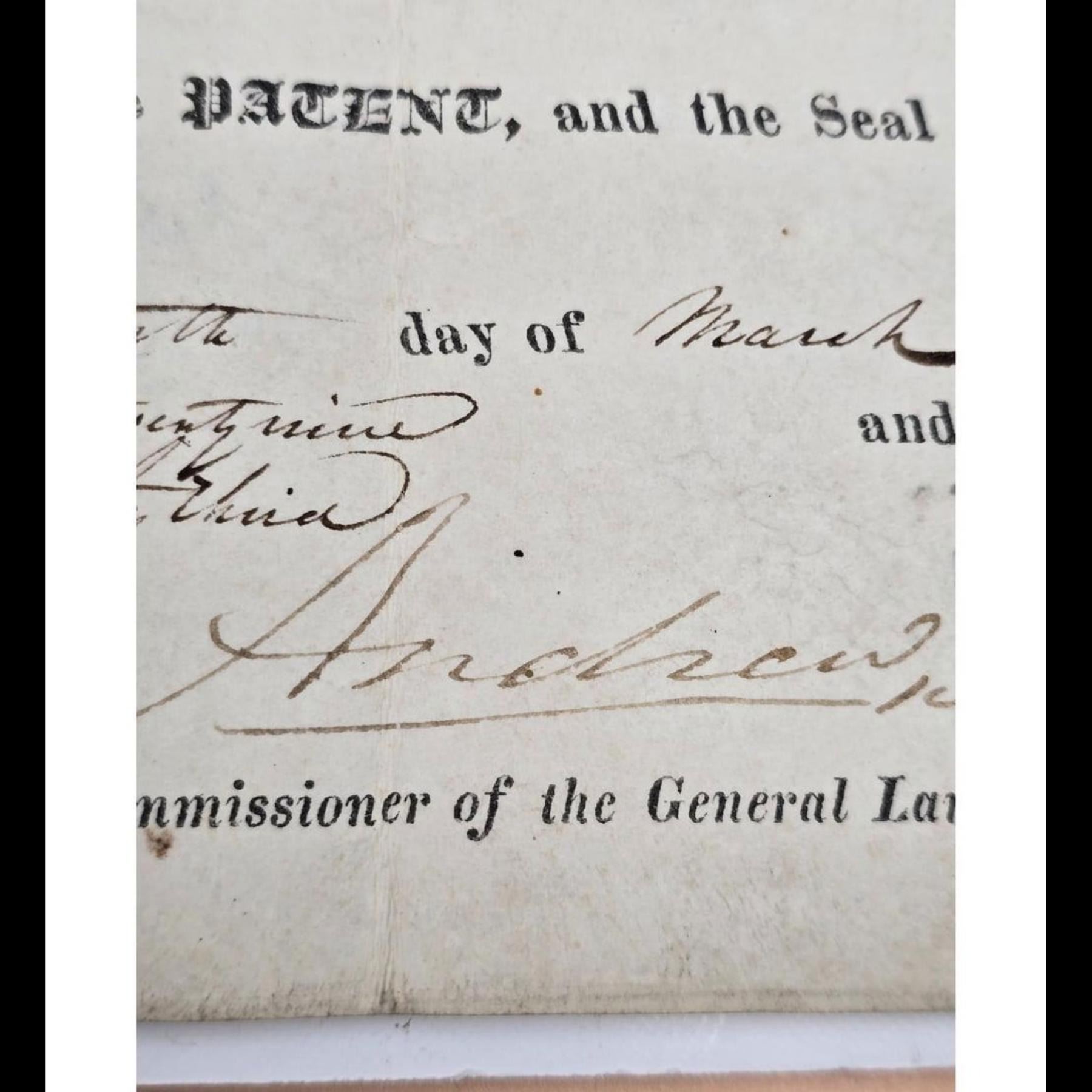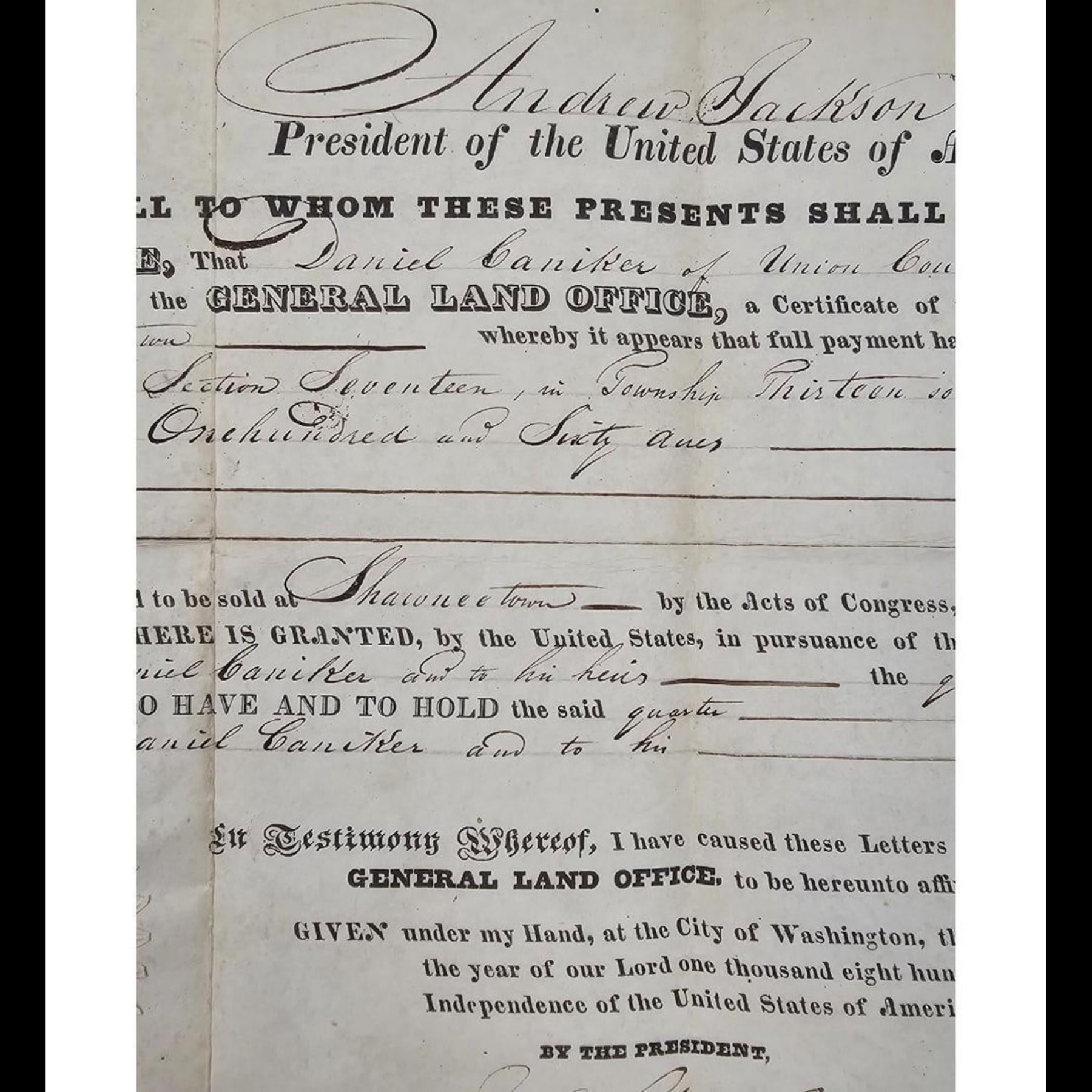 Early Andrew Jackson Document March 16th 1829, 12 Days After His Inauguration 03/04/1829. Land grant for 160 Acres of Shawnee Town, Illinois on The Ohio River, "Old Shawnee Town" Before 1937 Flood. Historically Famous U.S President Early Signature. Provenance: One Person Private Estate Central Florida.