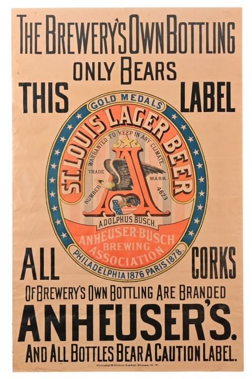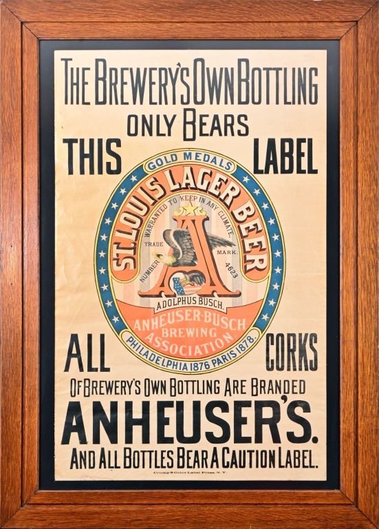 Circa 1890s Pre-prohibition in nice oak frame, Crump 5 Color Label Press, N.Y. Poster measures 26.5" x 42.5". Frame measures 37.5" x 52.25".