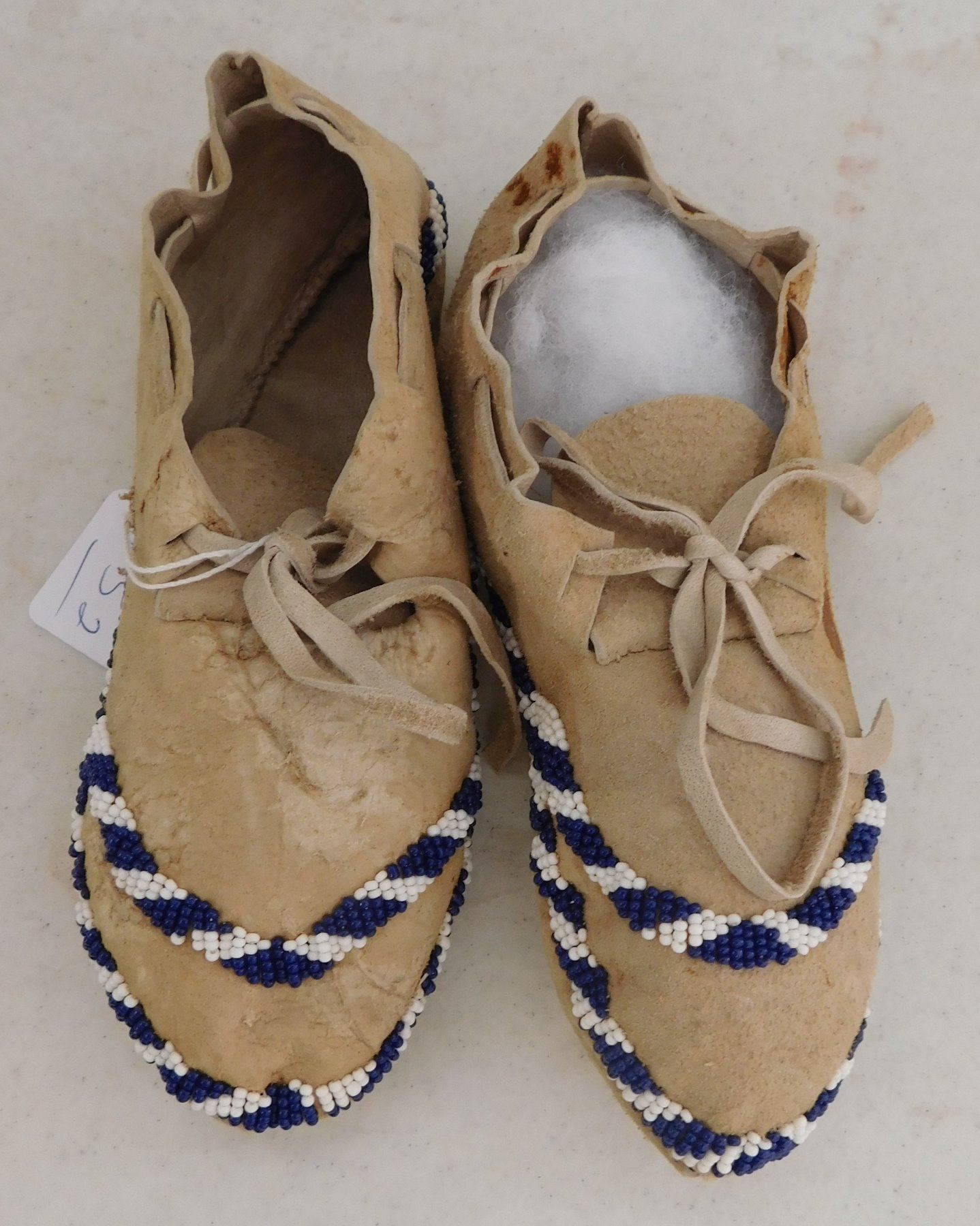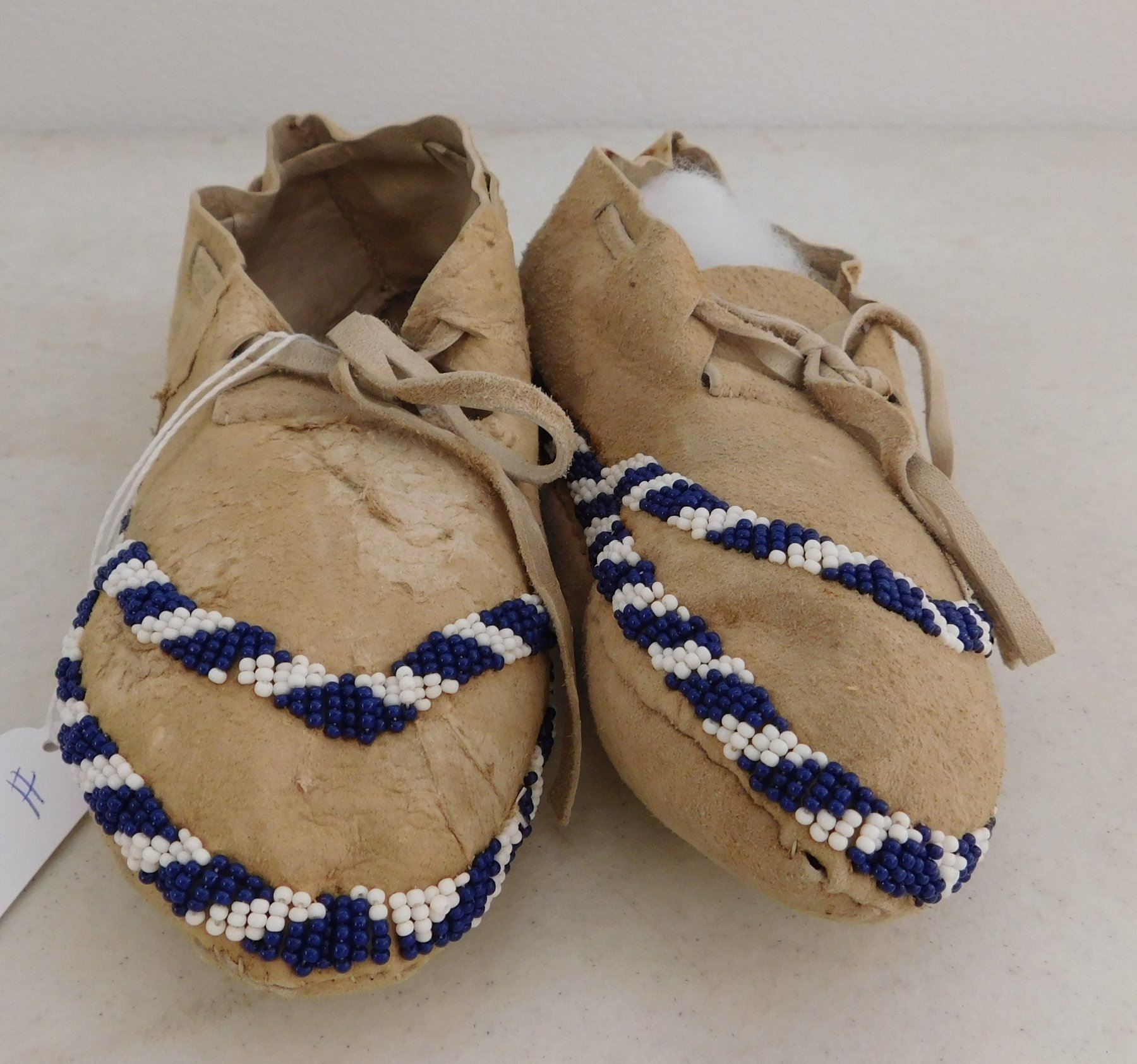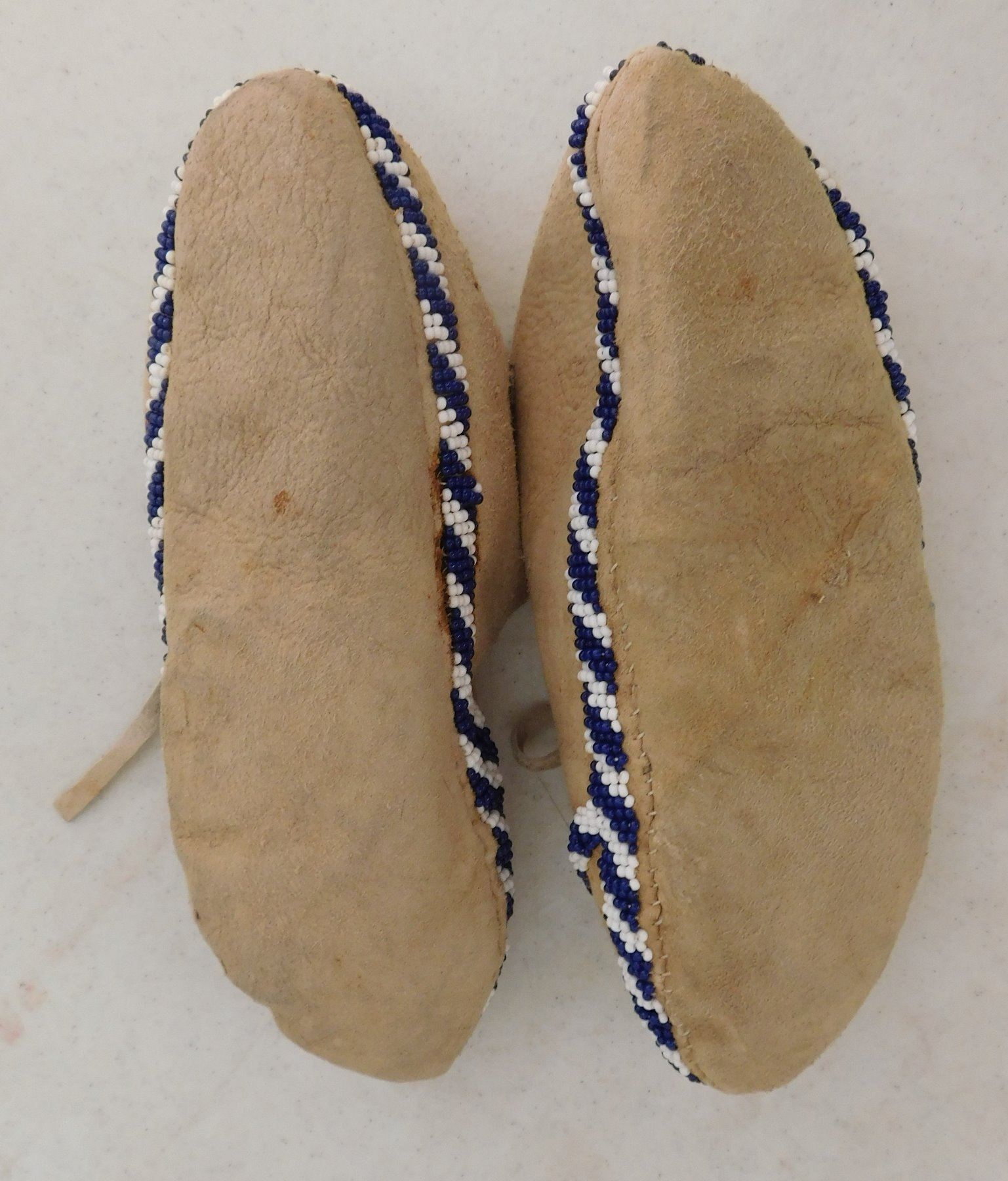 Early Apache Deerhide Moccasins, c. 1910. Made of deerhide and glass, the items measure approx. 3" x 8.5" each. Southern Plains, Apache/Comanche. Childs moccasins, soft sole, white and blue geometric design. Condition: Minor bead loss, staining to one, see images. Shipping: $20.00 w/insurance and signature.