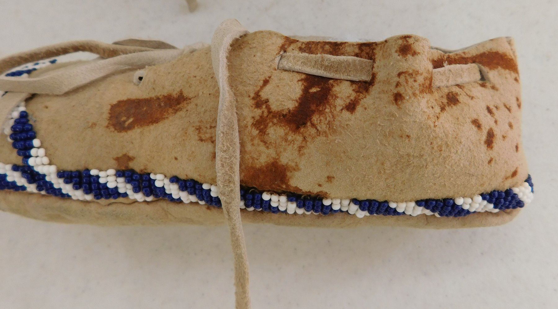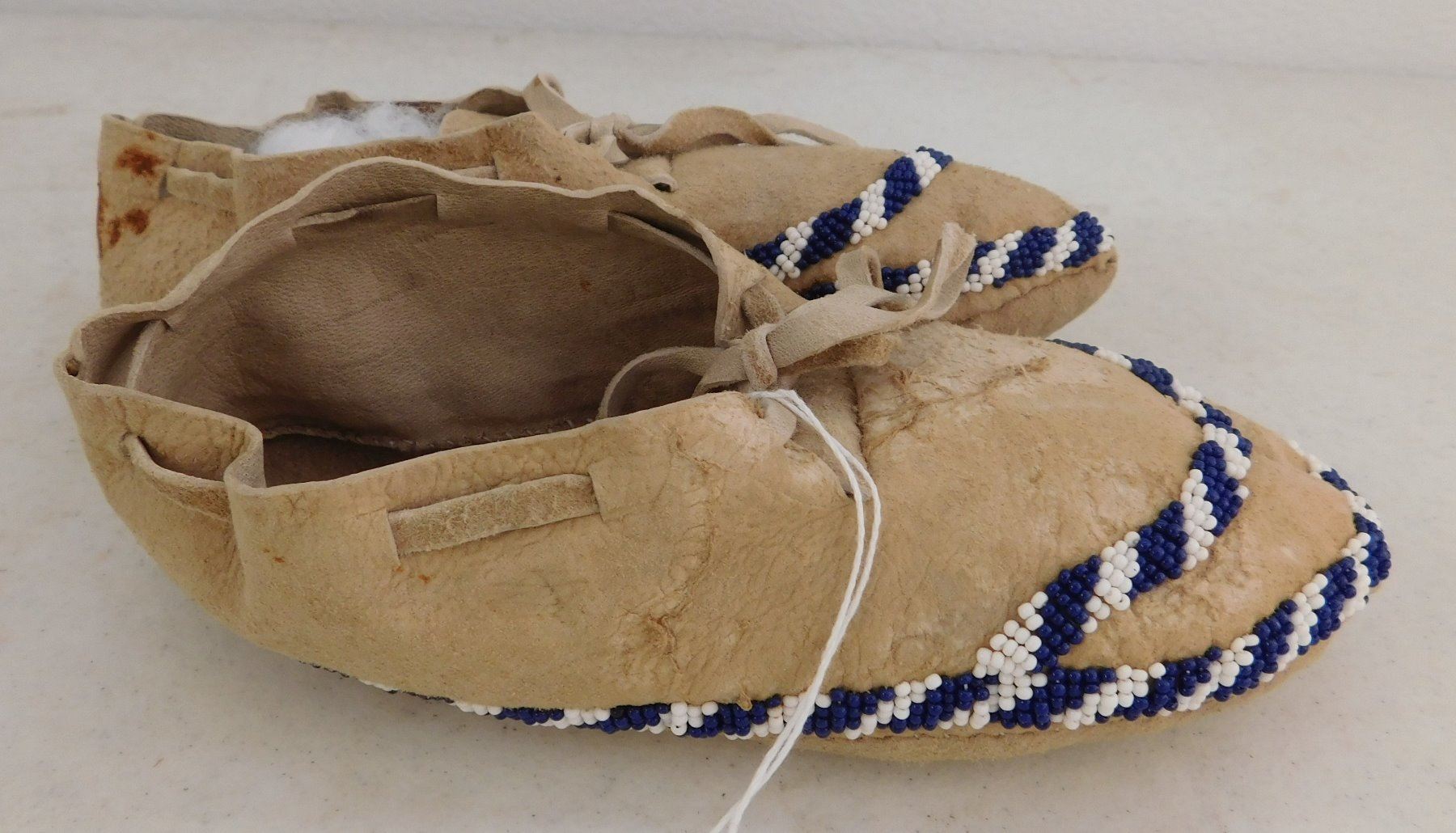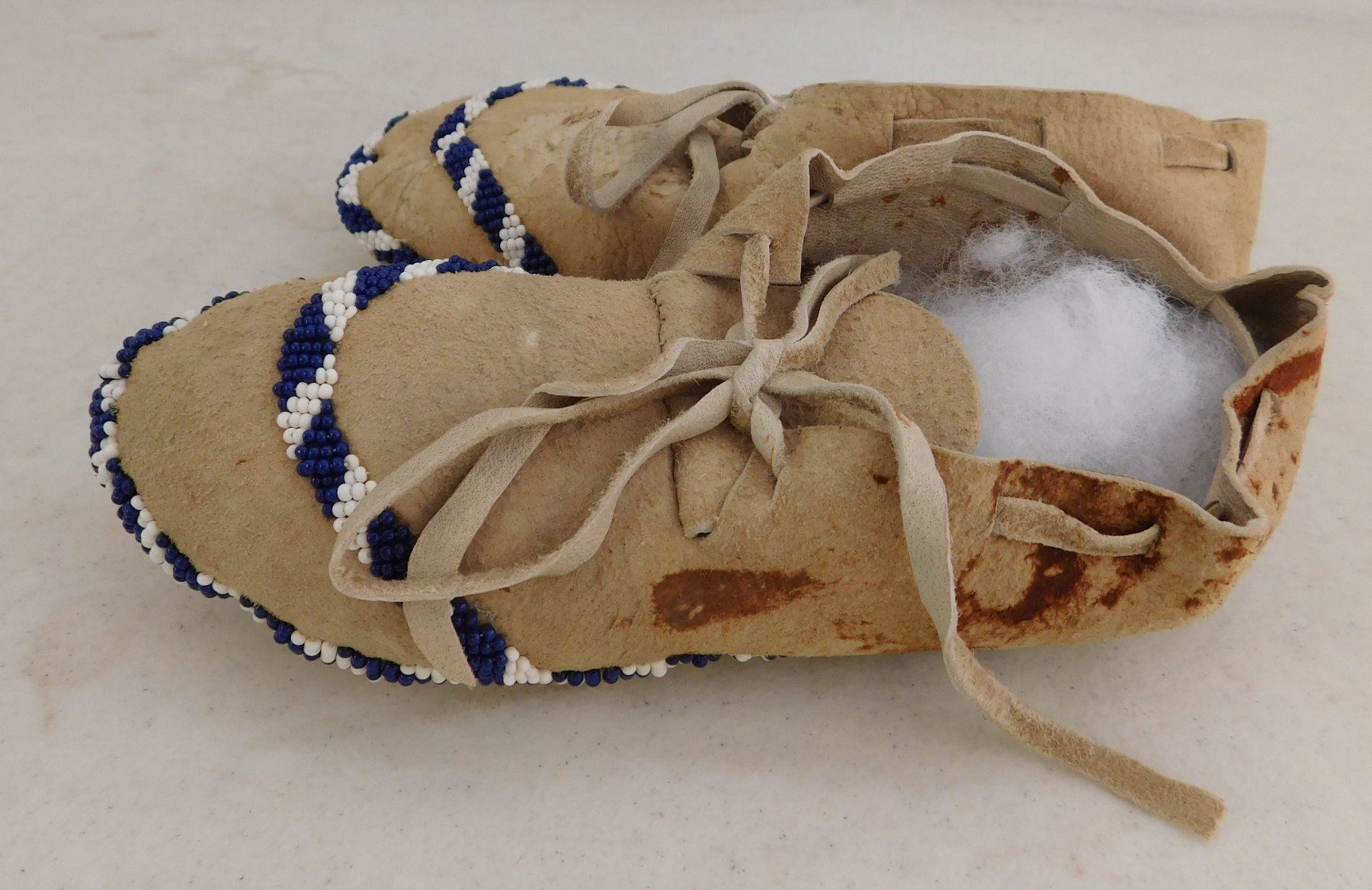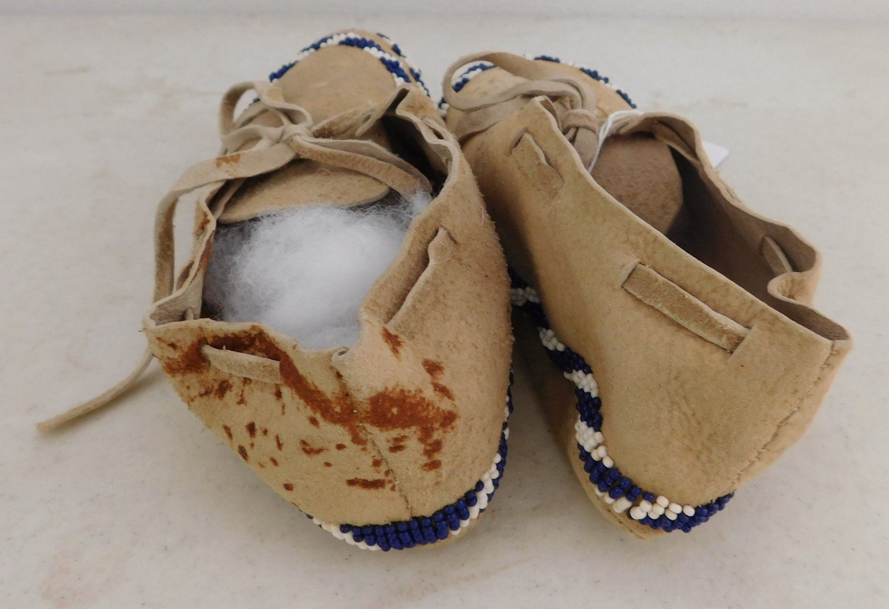 Early Apache Deerhide Moccasins, c. 1910. Made of deerhide and glass, the items measure approx. 3" x 8.5" each. Southern Plains, Apache/Comanche. Childs moccasins, soft sole, white and blue geometric design. Condition: Minor bead loss, staining to one, see images. Shipping: $20.00 w/insurance and signature.