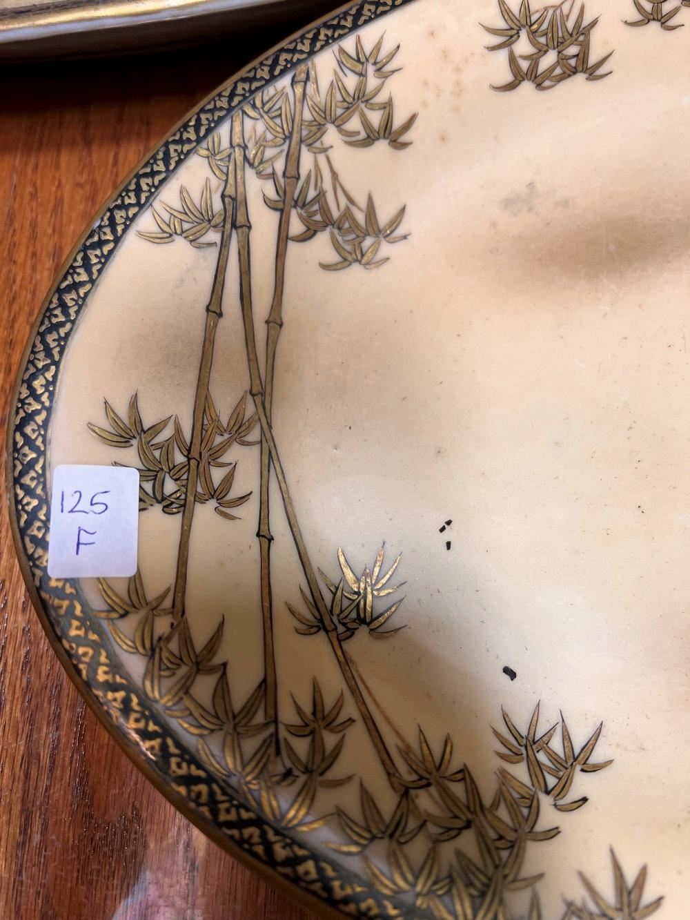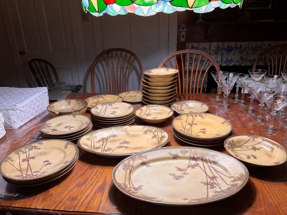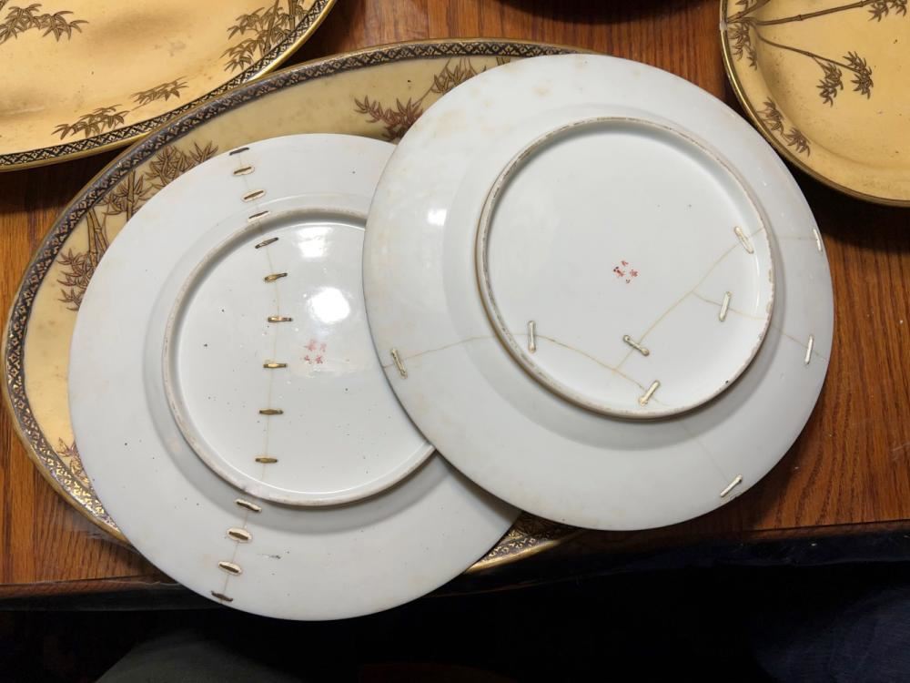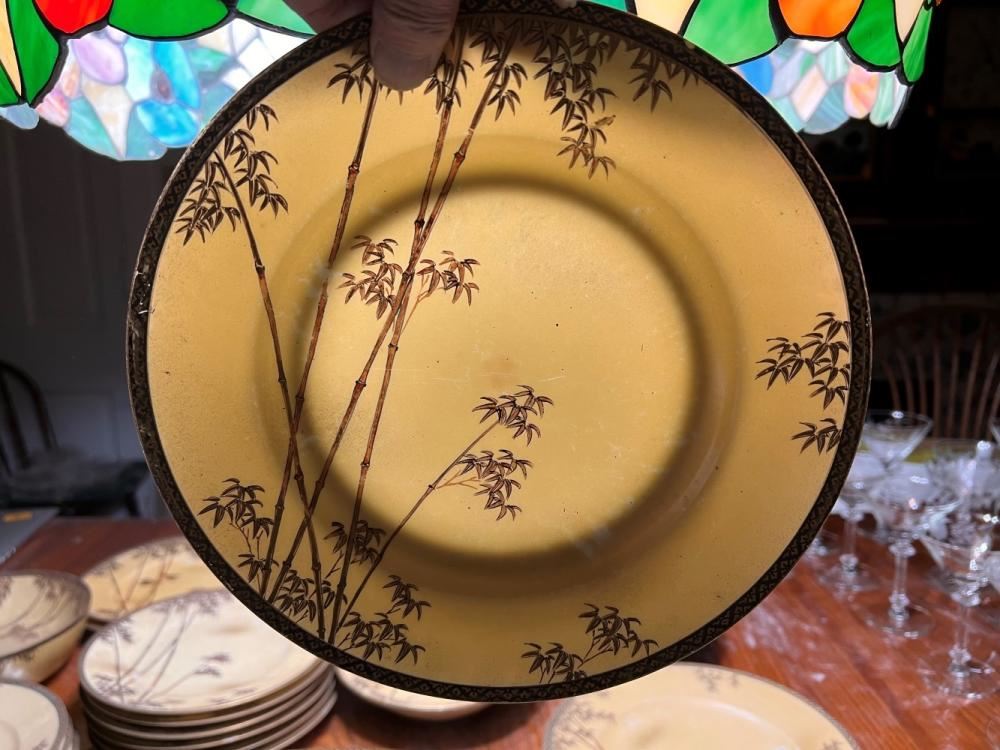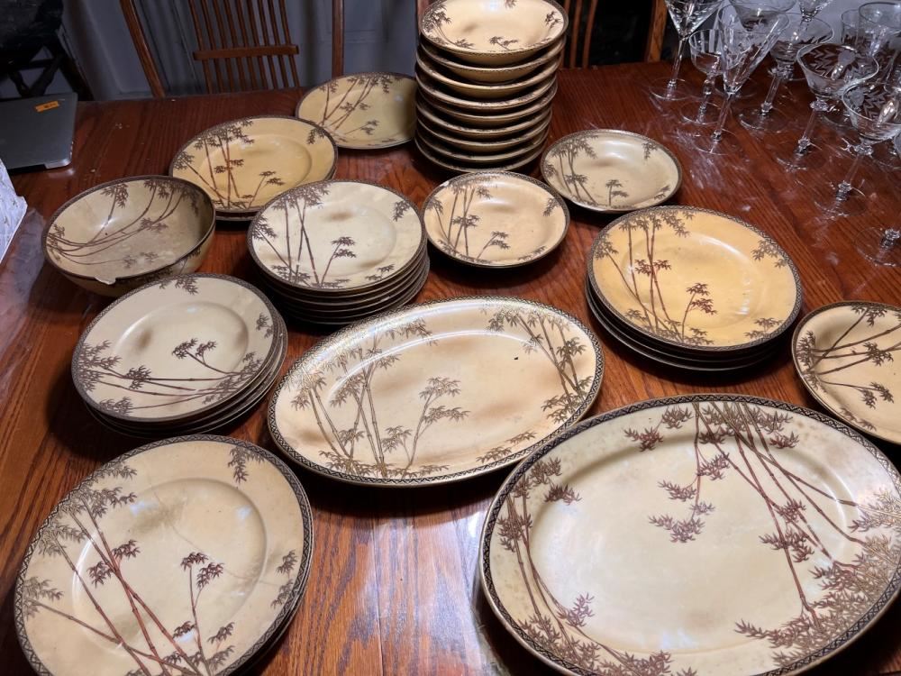 Early Asian China, bamboo in gold and black, 2 large serving platters, 10 dinner plates, 10 lunch plates, 12 soup bowls, 1 serving bowl. Early repairs made to some pieces.