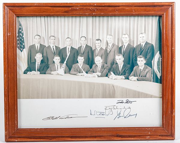 Early Astronaut Group Photo With 5 Autographs. Framed 16 x 13" B&W Astronaut group photo. A total of 14 in the photograph -- signed by Bill Anders, Alan Bean, Dave Scott, Gene Cernan and Rusty Schweickart. Faded but still a nice photo with good autographs.