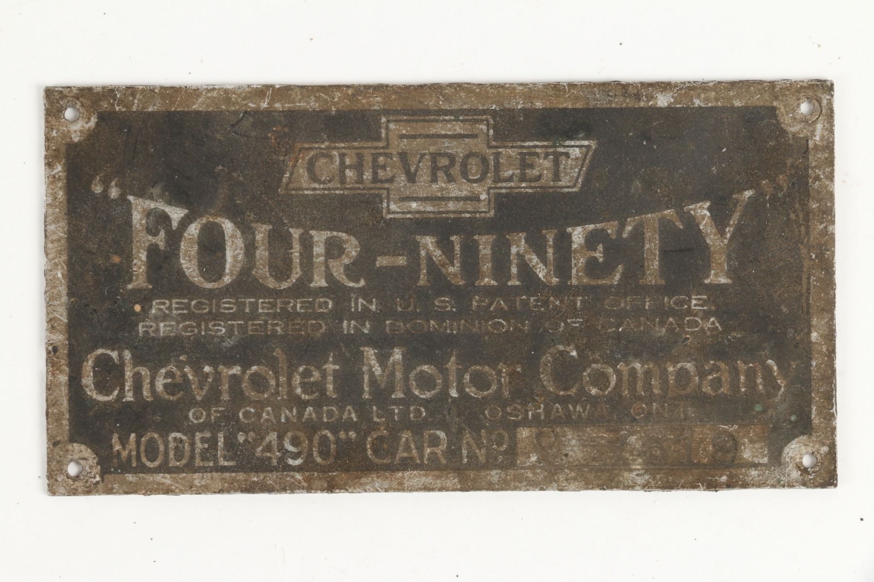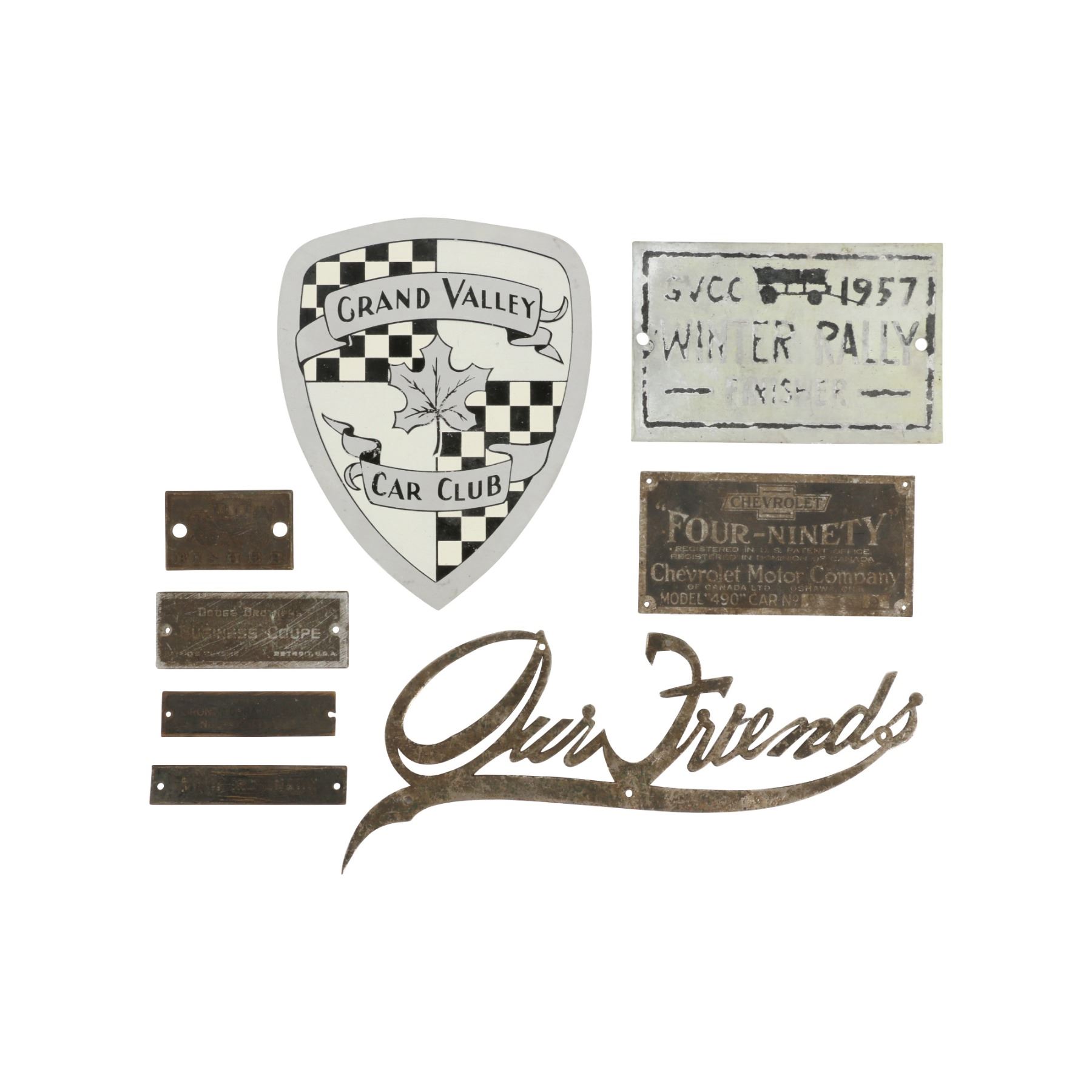 Eight (8) pieces. Mostly Canadian. Circa 1920s. Toronto Durant Co, Chevrolet, Dodge Brothers, Fisher Body, Grand Valley Car Club, Etc. Aluminum, brass and nickel composition. 1.5" to 7". Untouched original condition. $100-200.