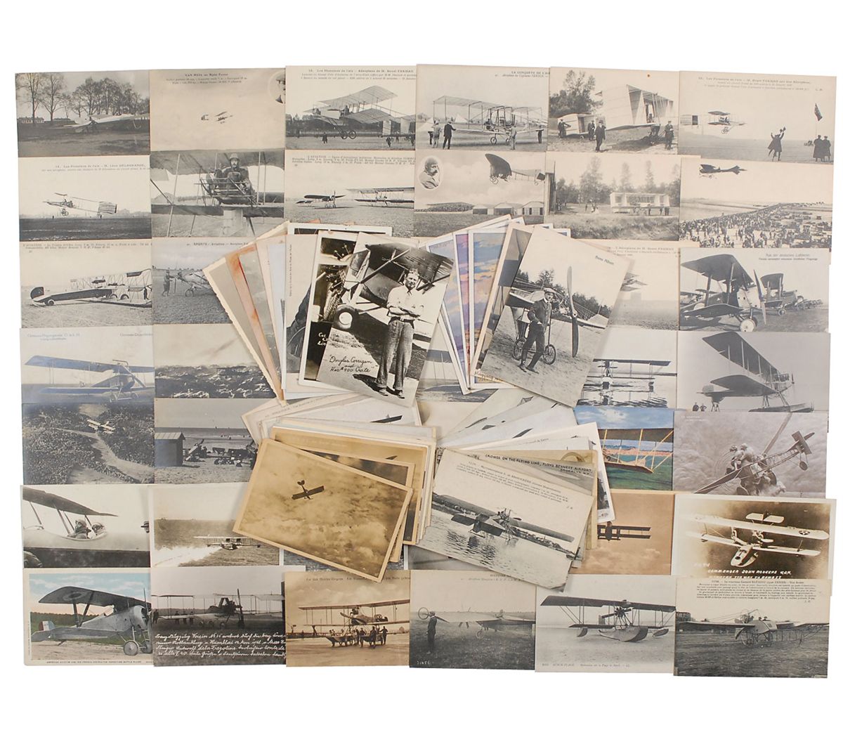 Collection of over 150 vintage early aviation postcards, most blank on the reverse but a few postally used. Aviators featured include Wilbur Wright, Orville Wright, Glenn Curtiss, Charles Lindbergh, Louis Bleriot, Douglas ‘Wrong Way’ Corrigan, Hubert Latham, Santos Dumont, Henri Farman, and Leon Delagrange. Plane types and manufacturers shown include the Wright Flyer, Burgess, B-17, Caudron Type C-33, Astra Triplane, Van Meel, Fokker, and hydroplanes. In overall fine condition.