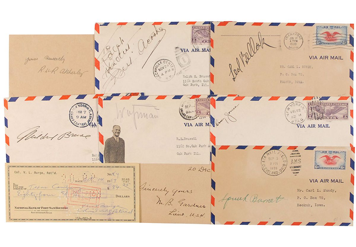 Nine items, consisting of a check, signatures, and various airmail covers, each signed by an early aviator. Signers are: Richard L. R. Atcherley, Bertrand Blanchard Acosta, ‘Squeek’ Barnet, Ted Bellak, Mildred Bruce, Vernon Burge, M. B. Gardner, Wolfgang von Gronau (pencil), and Casey Jones. In overall fine condition.